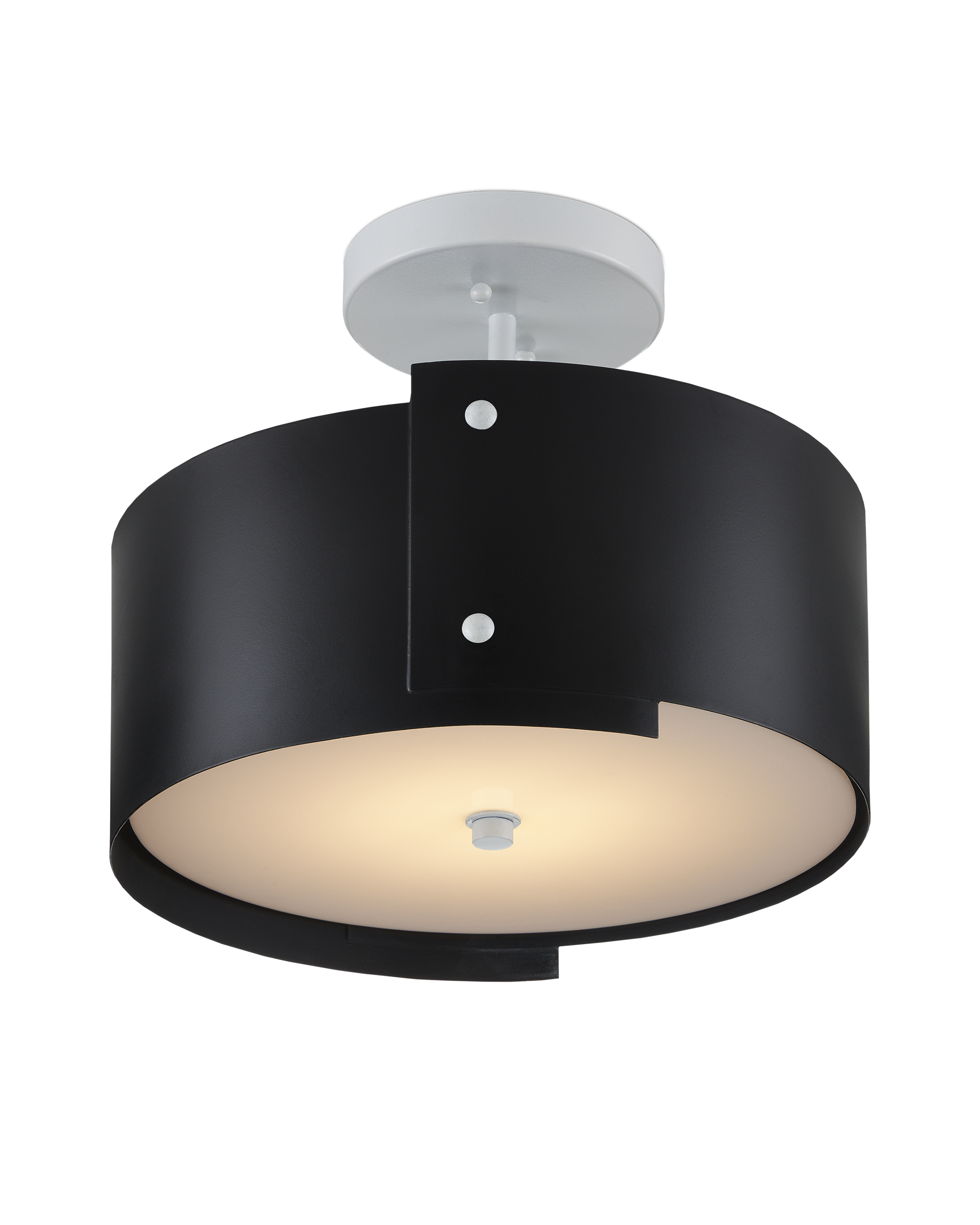 Clarence Mallari designed the Ritsu Black Semi-Flush. Inspired by Japanese origami, he wrapped the black ceiling light in wrought iron panels in a blacksmith finish, fastening them with brads that are contrasting elements in sugar white. These match the finial that holds the acrylic diffuser in place and the ceiling plate, the pops of paleness bringing sophistication to this design. The Ritsu is fitted with integrated LED technology.