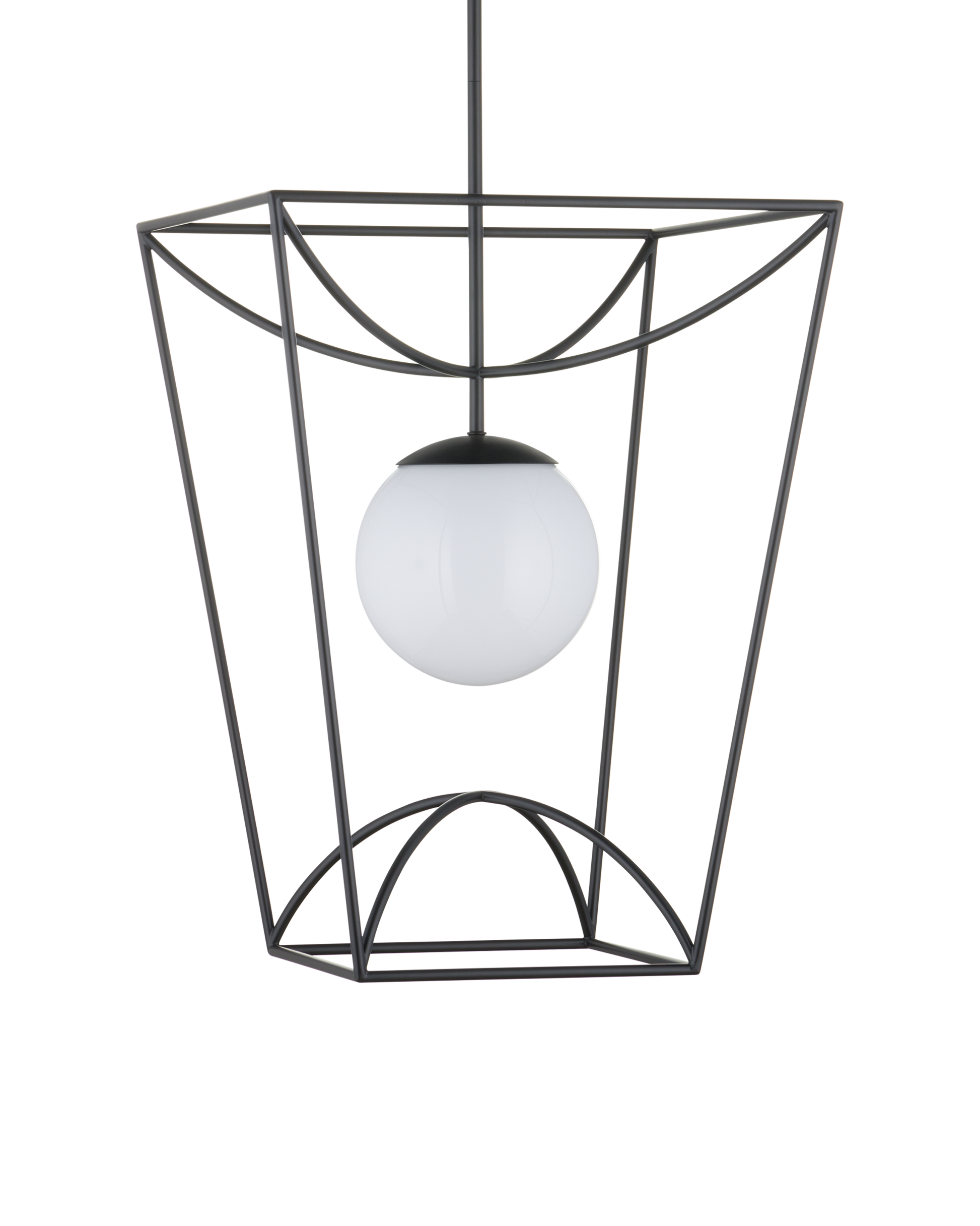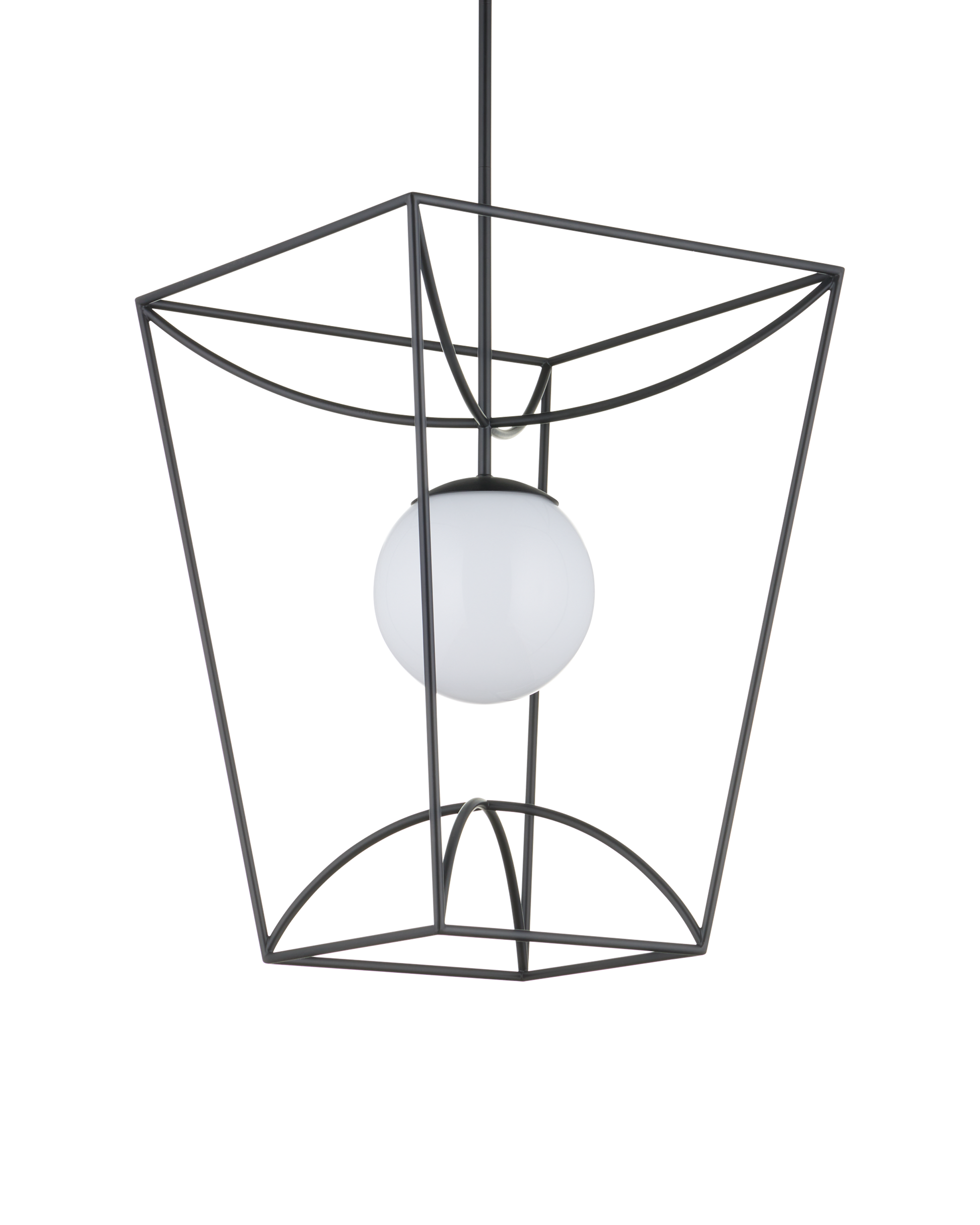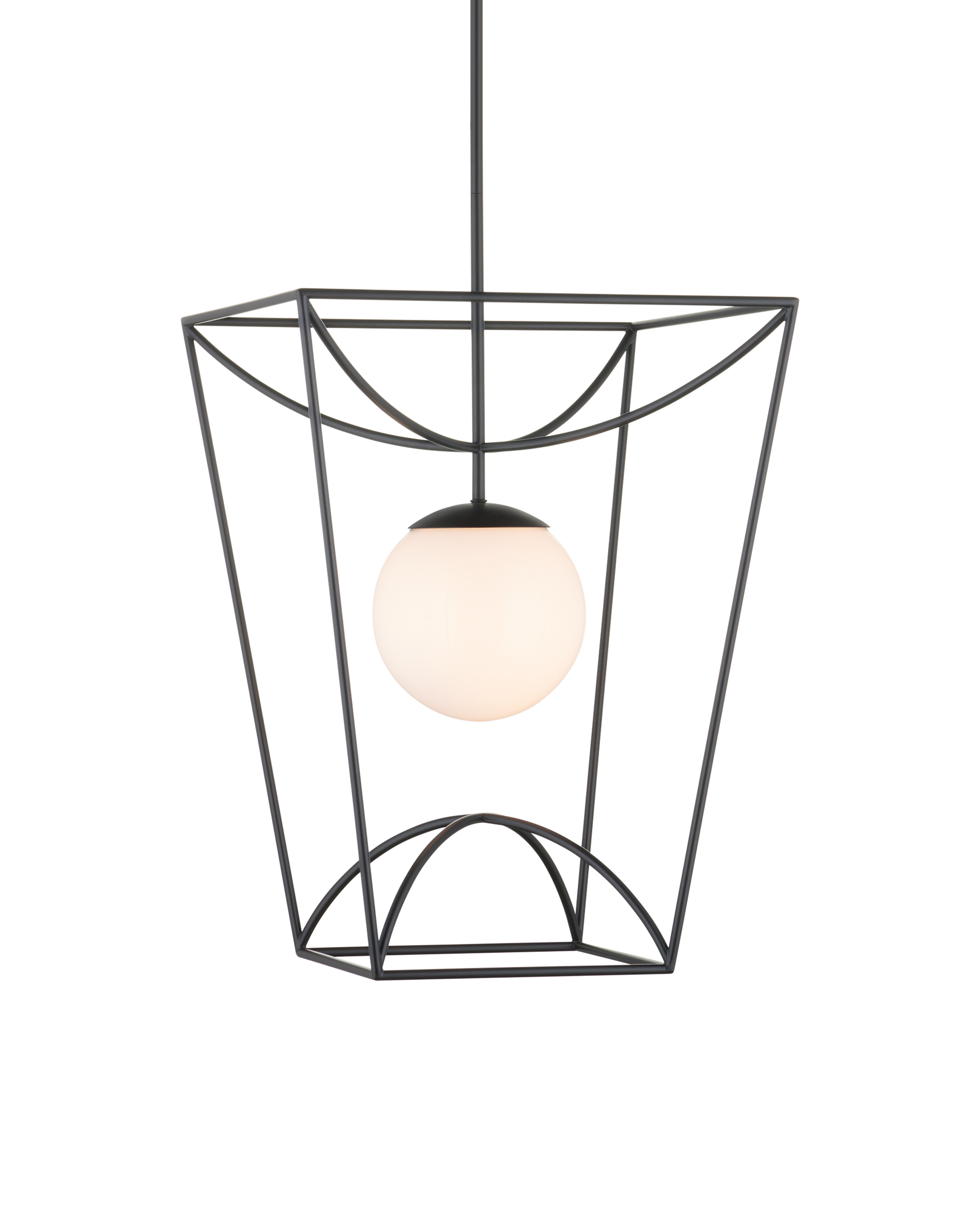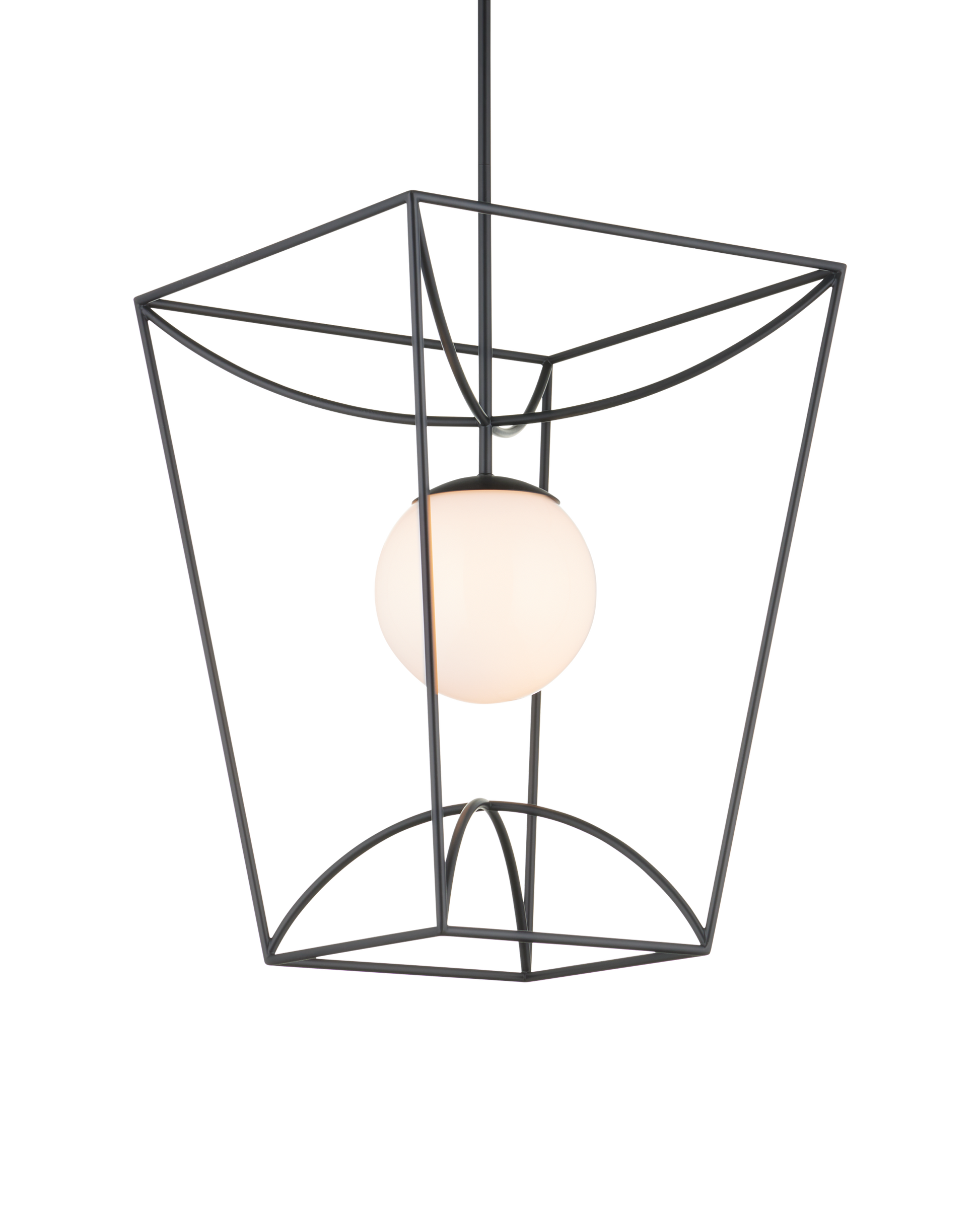 The Rochefort Medium Lantern is an outdoor pendant with beautiful lines that subtly draw themselves into a lantern-like form. The black powder-coated finish makes it durable for exterior environments and contrasts the milky white glass globe that it balances in its center. Whereas traditional lanterns may be limited to time-honored and transitional design aesthetics, the delicacy of this black lantern’s profile makes it fitting for mid-century modern homes and those that lean contemporary. Adjustable from 29.75" to 71.75" with use of included chain/rod kit/cable. If your space calls for a longer drop, additional chain/rods/cable is available for purchase.