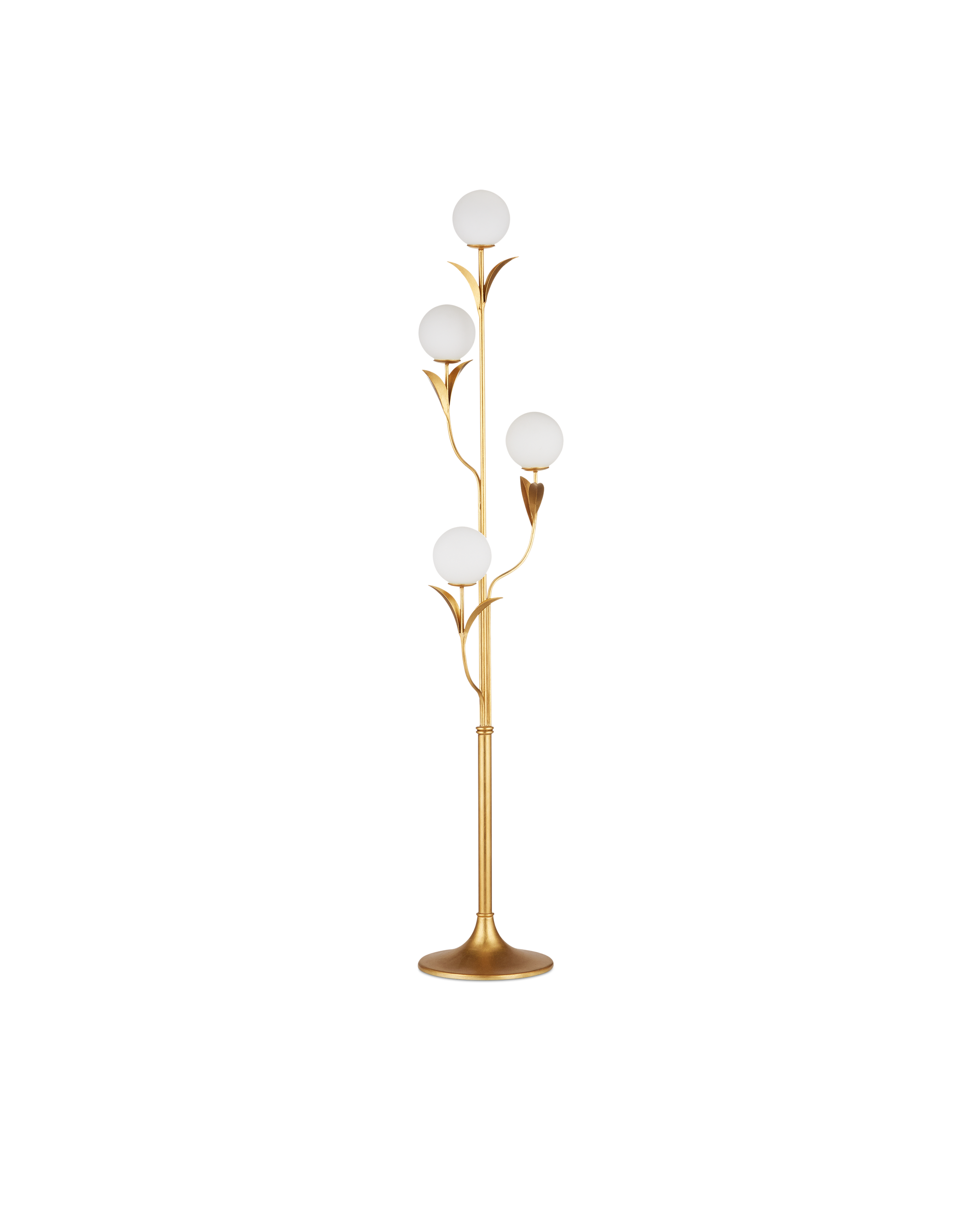 The Rossville Floor Lamp exudes a contemporary retro vibe with its globe-shaped bulbs. This nature-inspired floor lamps is modern in its makeup with the thin arcing leaves that flow along the body and stem of each of the four lights. Made of wrought iron in a contemporary gold leaf finish, the bobeches balance their white glass globes brilliantly.