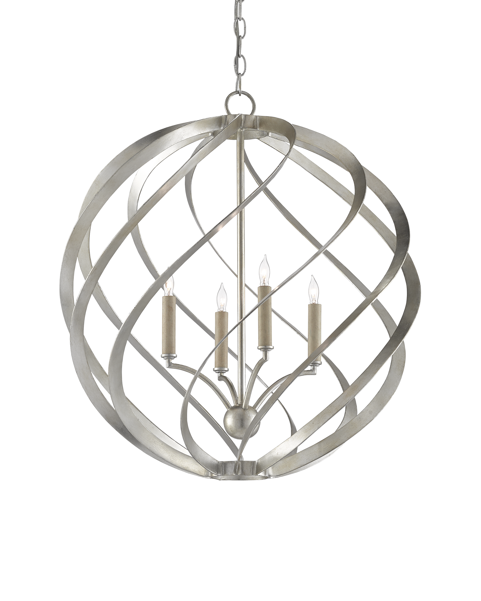 The globe shape of the Roussel Orb Chandelier is formed by bands of wrought iron in a contemporary silver leaf finish. These are turned to make them seem to undulate. The candle arms perched on thin stems seem to be floating within the swirling atmosphere of this silver chandelier. Adjustable from 32.75" to 101" with use of included chain/rod kit/cable. If your space calls for a longer drop, additional chain/rods/cable is available for purchase.