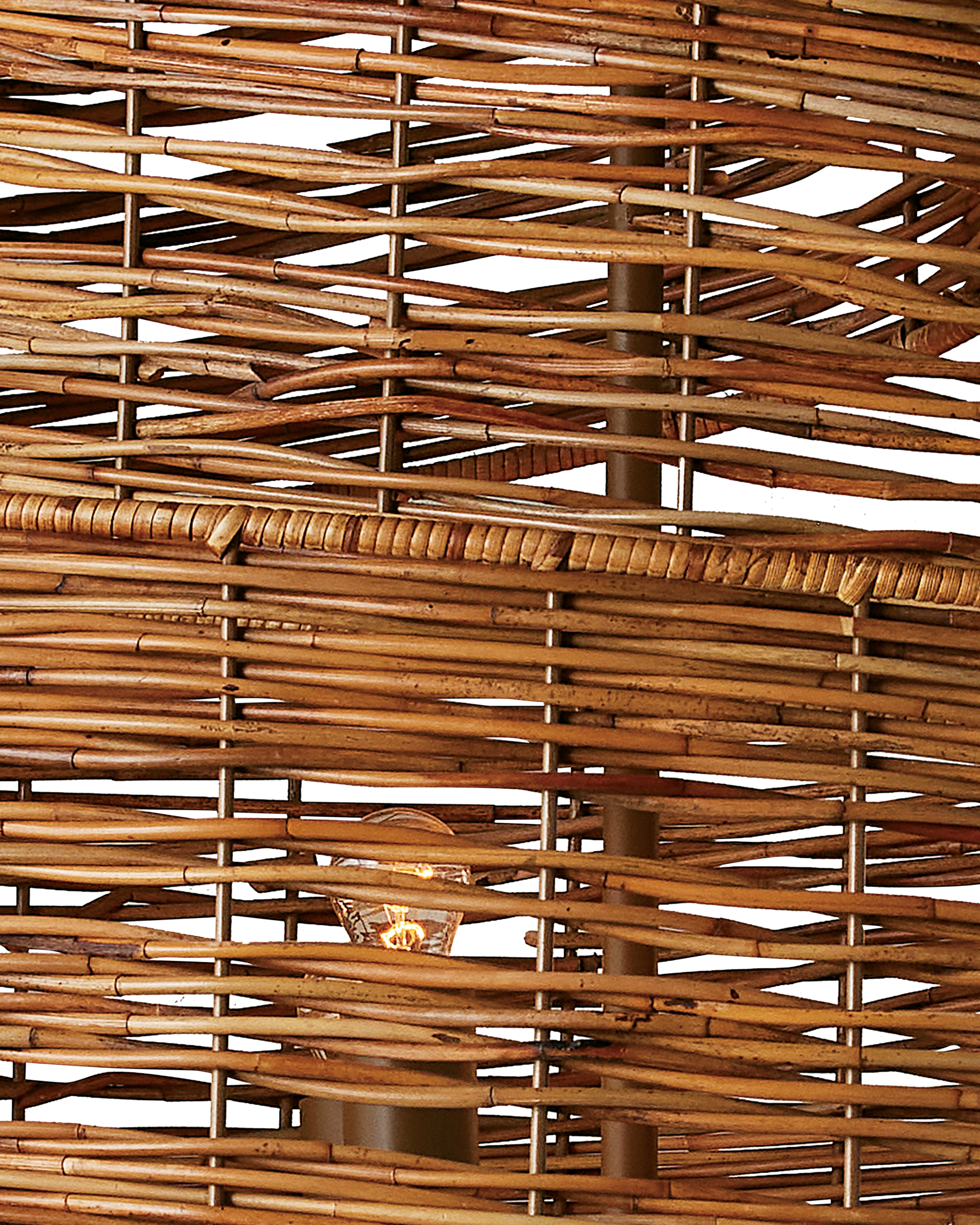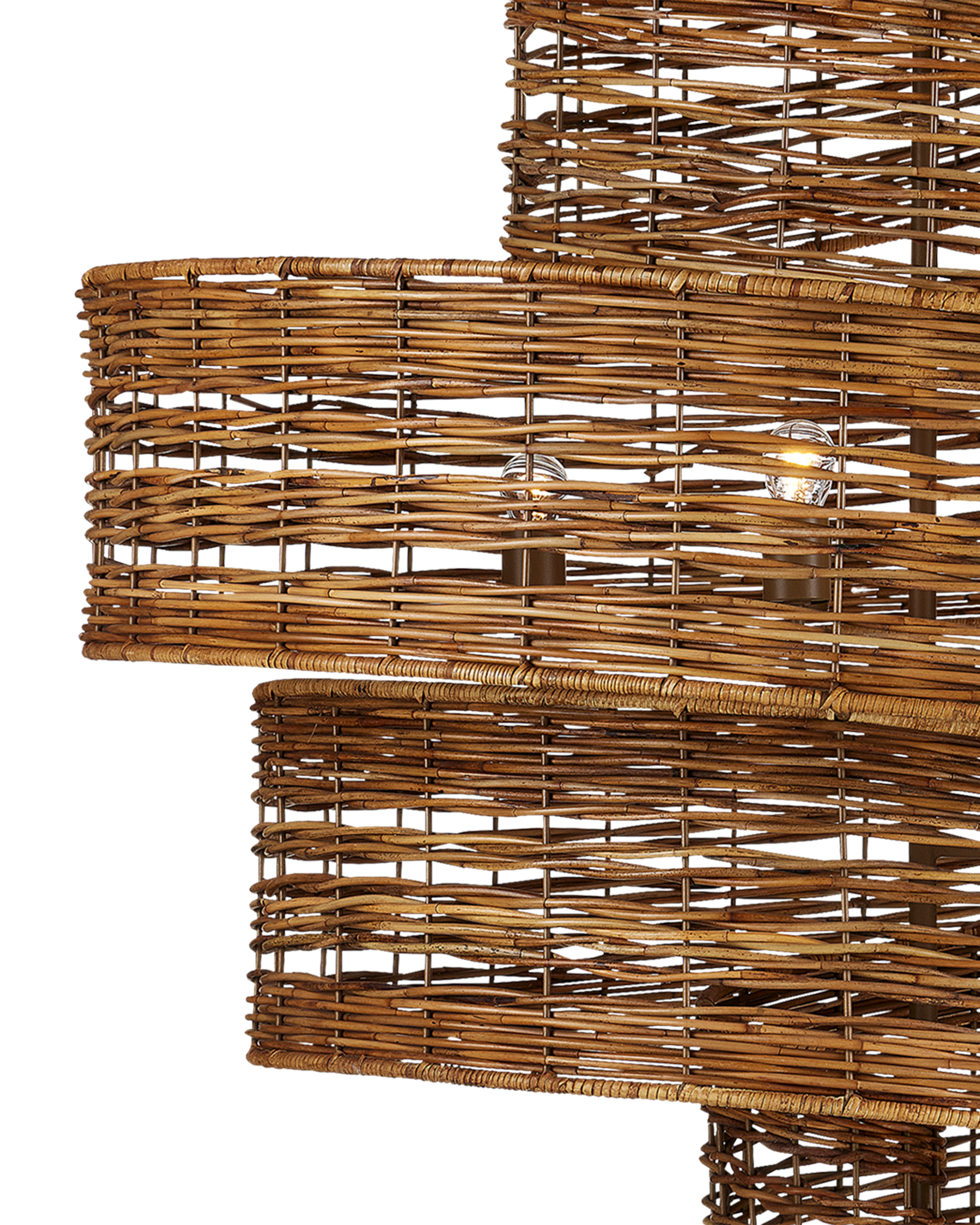 Hiroshi Koshitaka envisioned the Saisei Grande Chandelier as one of a number of fixtures he sees as fulfilling the concept that encompasses the acts involved in regeneration and reproduction as we restore, revive, and experience regrowth and rebirth. Rattan flows artfully around a spiral wrought iron frame in a khaki finish, which is tonally in sync with the natural color of the material. The otherworldly shape of this rattan chandelier was inspired by outer space - galaxies in the universe come to light. Adjustable from 56.75" to 125.50" with use of included chain/rod kit/cable. If your space calls for a longer drop, additional chain/rods/cable is available for purchase.