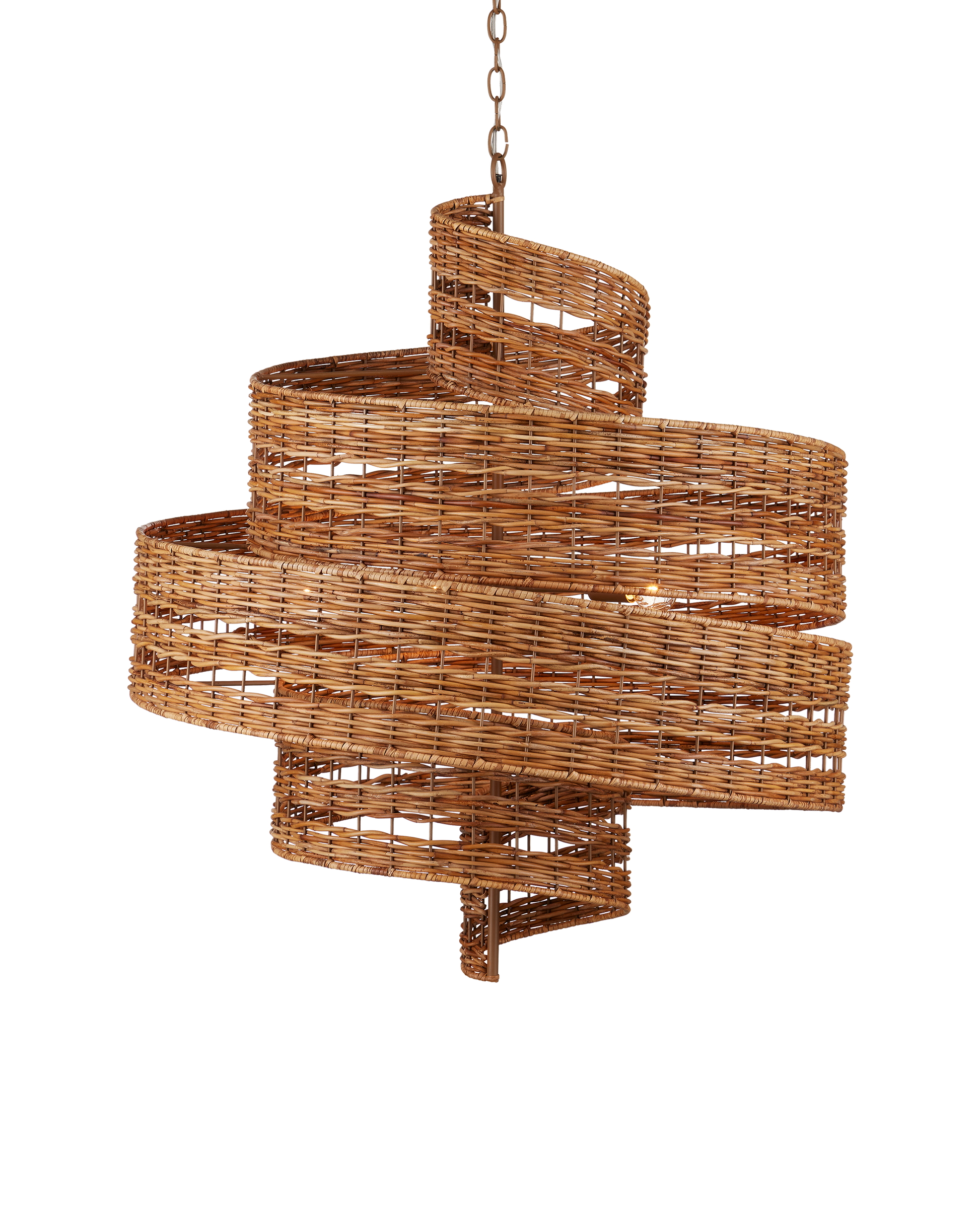 Hiroshi Koshitaka envisioned the Saisei Medium Chandelier as one of a number of fixtures he sees as fulfilling the concept that encompasses the acts involved in regeneration and reproduction as we restore, revive, and experience regrowth and rebirth. Rattan flows artfully around a spiral wrought iron frame in a khaki finish, which is tonally in sync with the natural color of the material. The otherworldly shape of this rattan chandelier was inspired by outer space — galaxies in the universe come to light. Adjustable from 43" to 111" with use of included chain/rod kit/cable. If your space calls for a longer drop, additional chain/rods/cable is available for purchase.