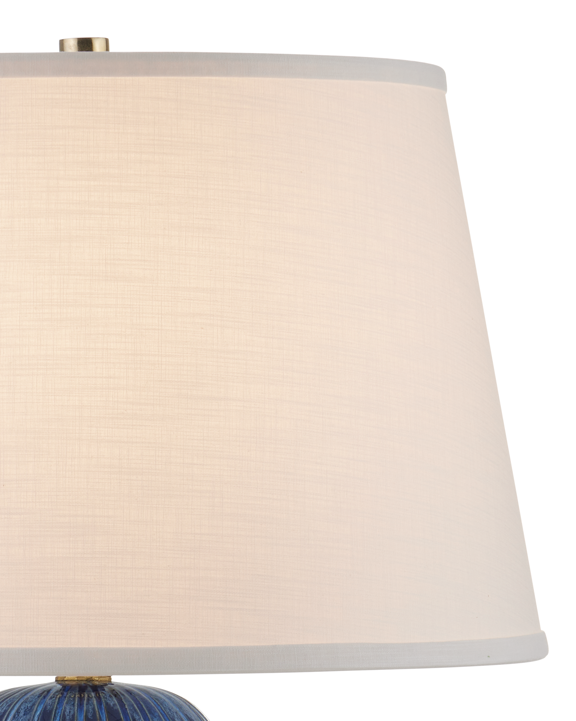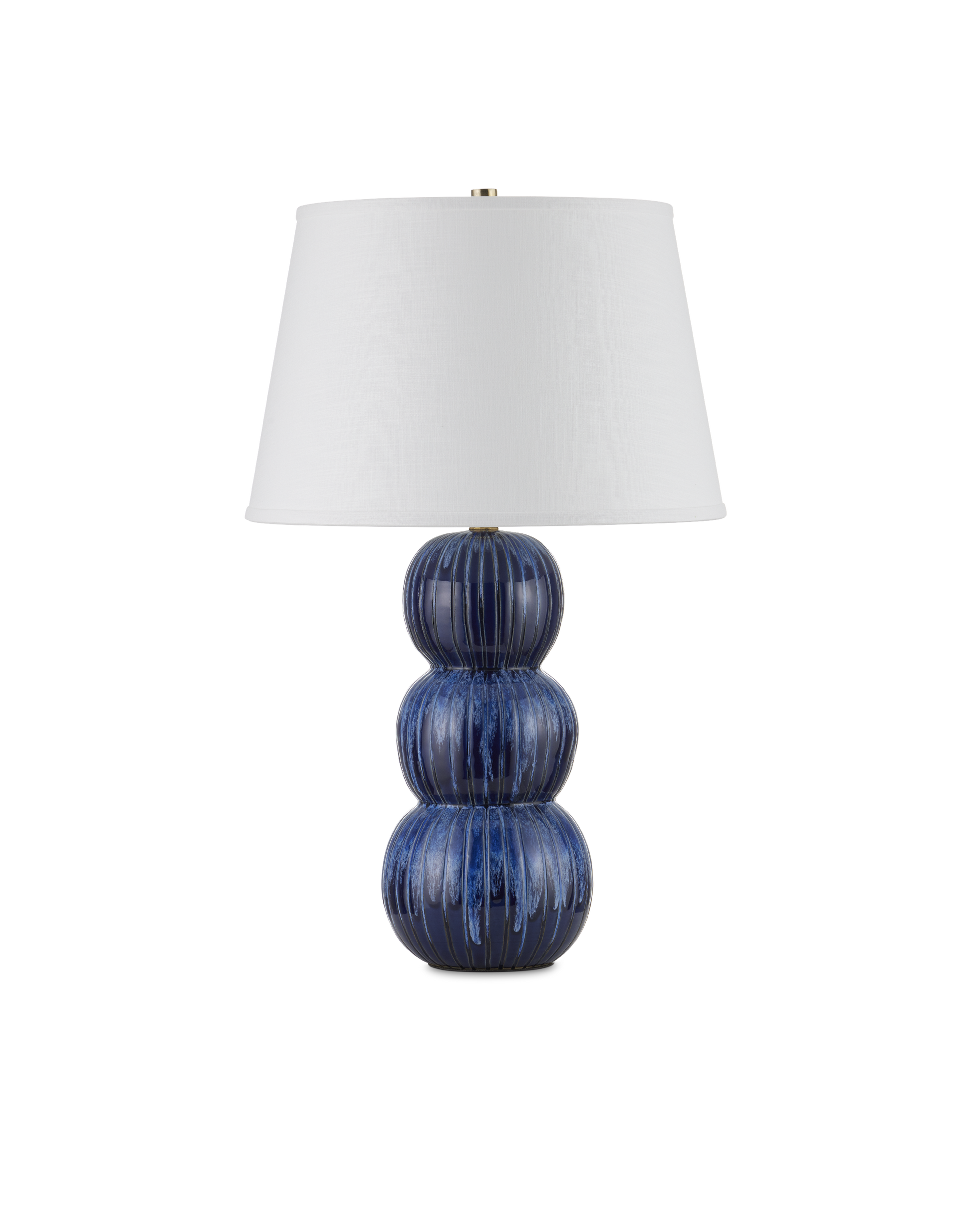 The Salacia Table Lamp has a stacked-globe body that drips with a mix of dark and bright blue glazes flowing down each striated orb in varying degrees of brightness. The painstaking attention to detail that is required to create such a varied but balanced glazing is achieved by a talented group of women artisans who live at the border of Burma and Thailand. The trim on the shade brings this navy blue lamp an uptick in sophistication.