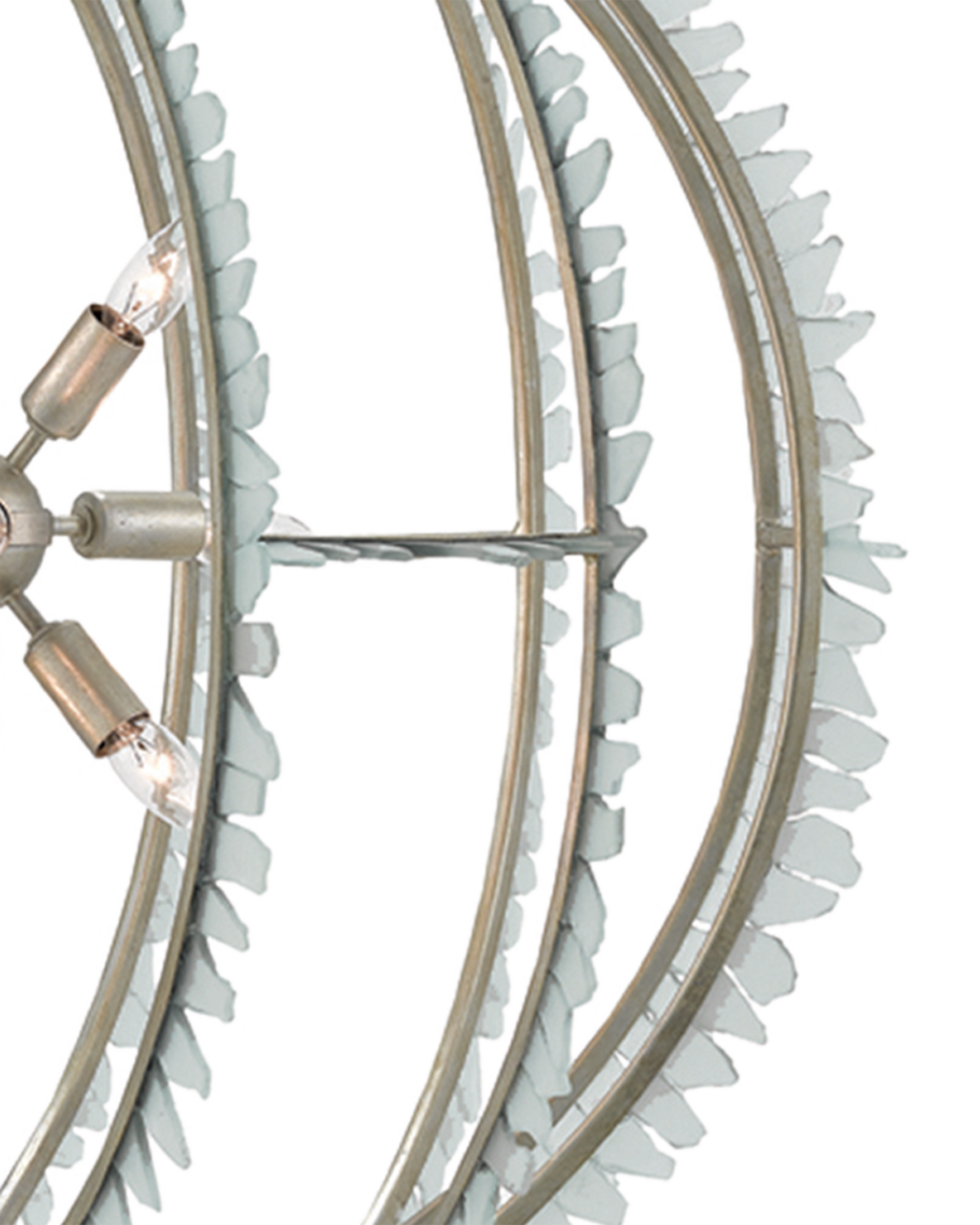 The Saltwater Orb Chandelier will enchant a space with its frosted recycled glass pieces ornamenting its wrought iron frame. Produced to mimic the beauty of the sea, the slight aqua tinge of the glass complements the contemporary silver leaf finish on the frame of this silver chandelier.