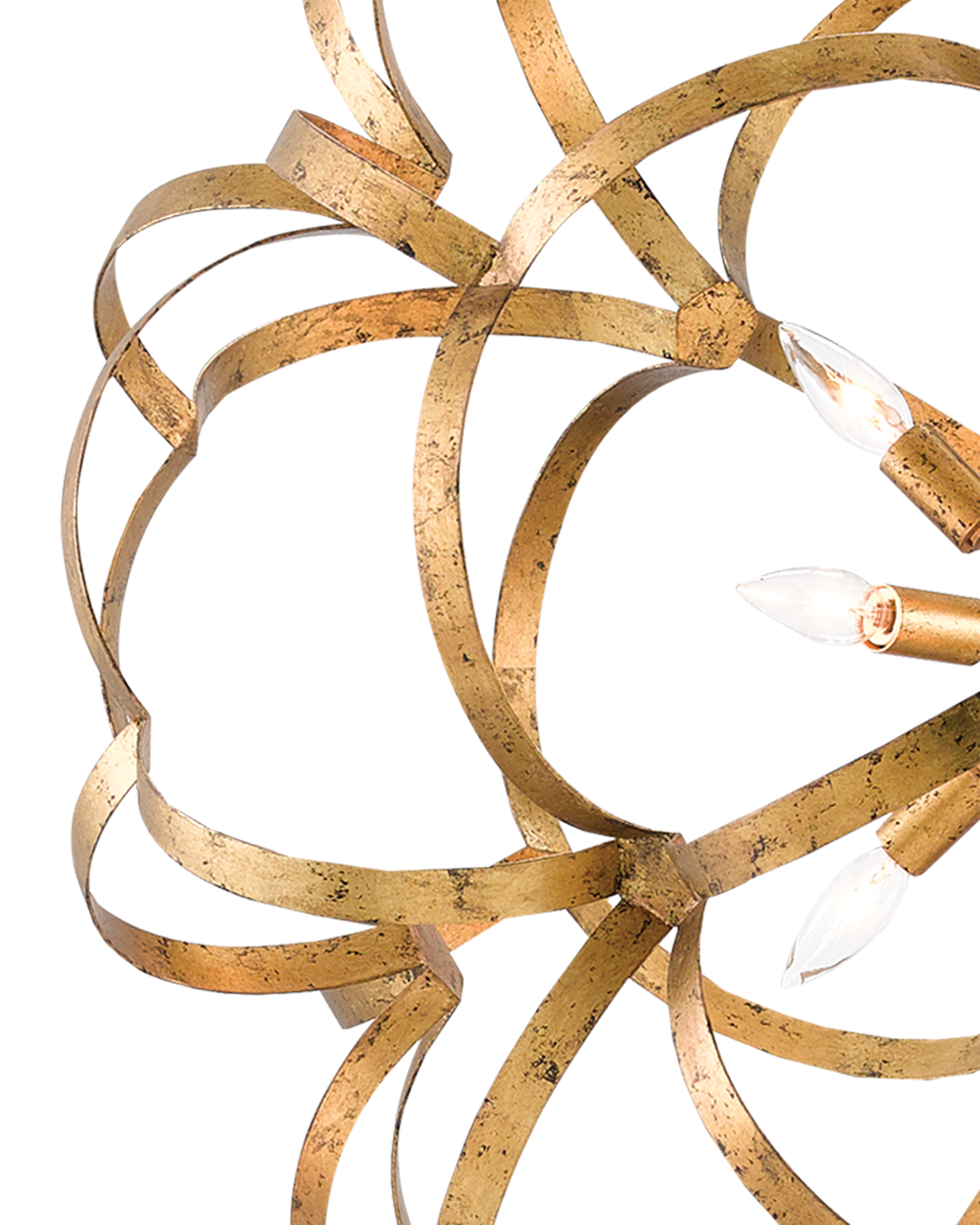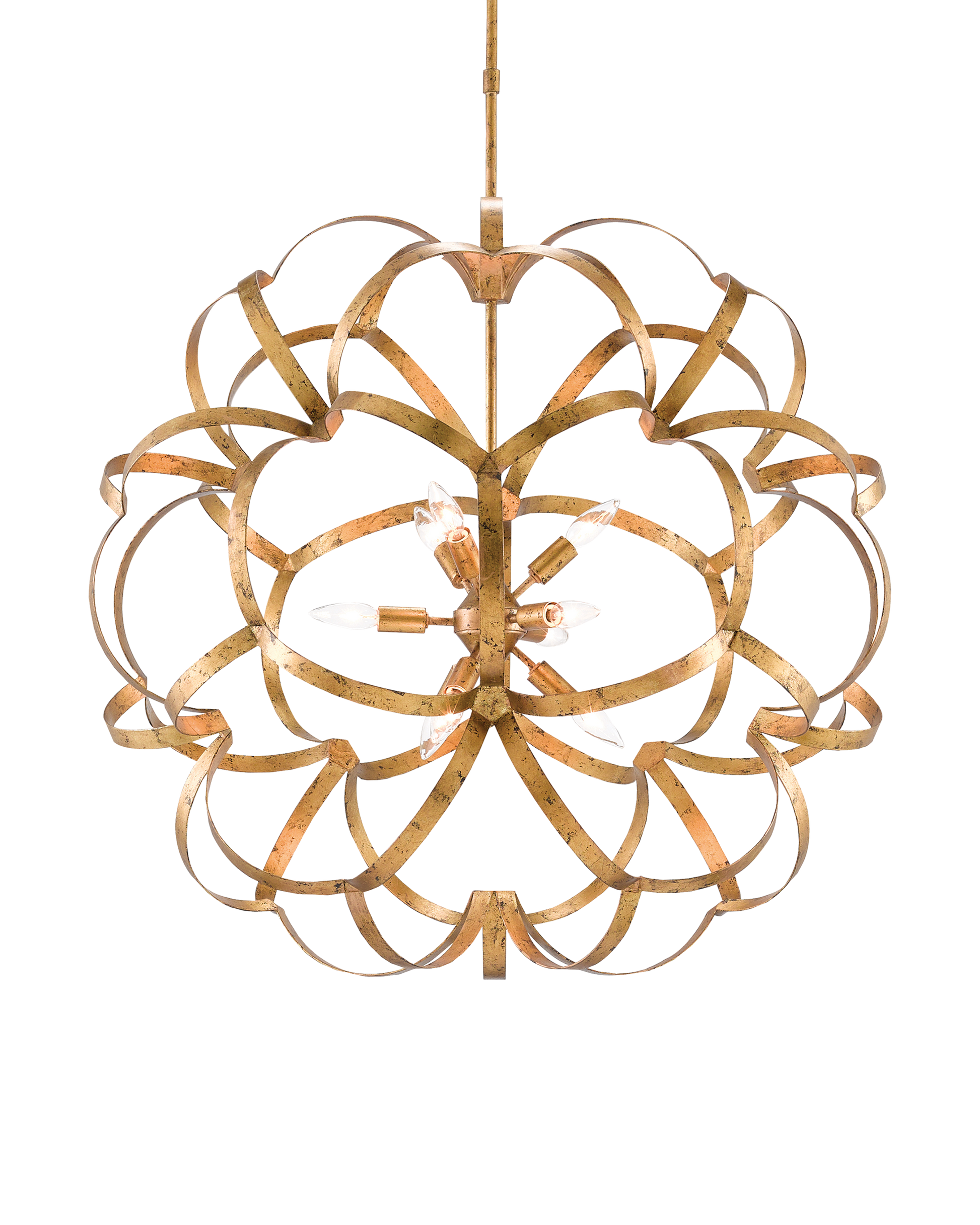 The Sappho Orb Chandelier is made of ribbons of wrought iron fluttering around its nine lights. This is a fixture that illustrates the talent of our craftspeople who can make such a rigid material feel graceful. Once it reached its final form, the gold chandelier was finished in a new gold leaf to make it shine.