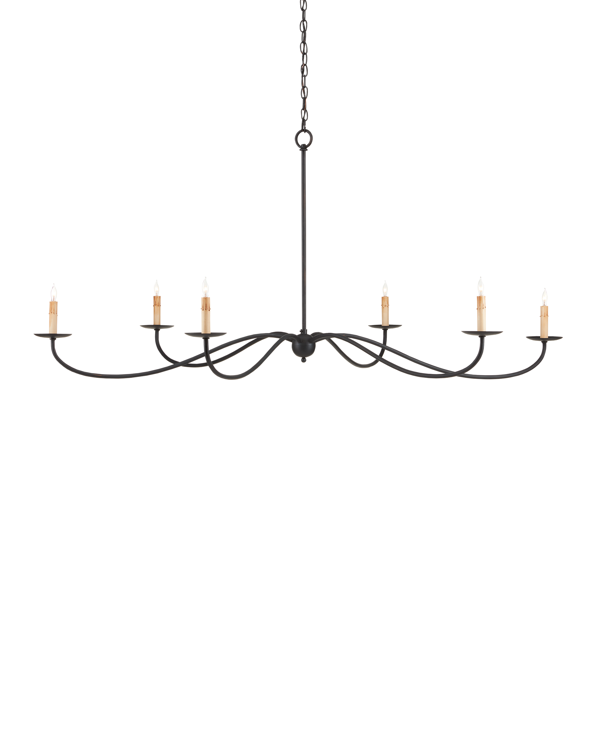 The Saxon Black Chandelier is one of our monumental chandeliers that extends to an impressive 63 inches in diameter. Its shape and the Zanzibar black finish are nods to a bygone era but its slender lines that arc gracefully make its profile modern. Adjustable from 35.5" to 103.5" with use of included chain/rod kit/cable. If your space calls for a longer drop, additional chain/rods/cable is available for purchase.