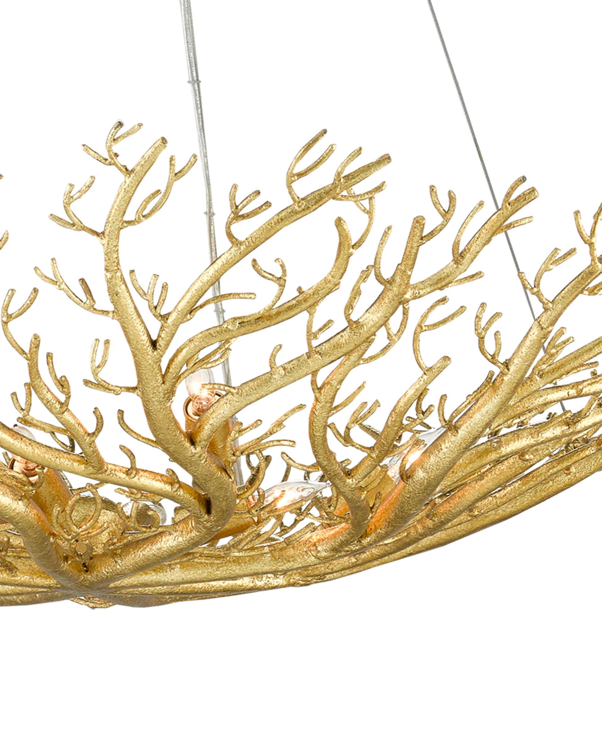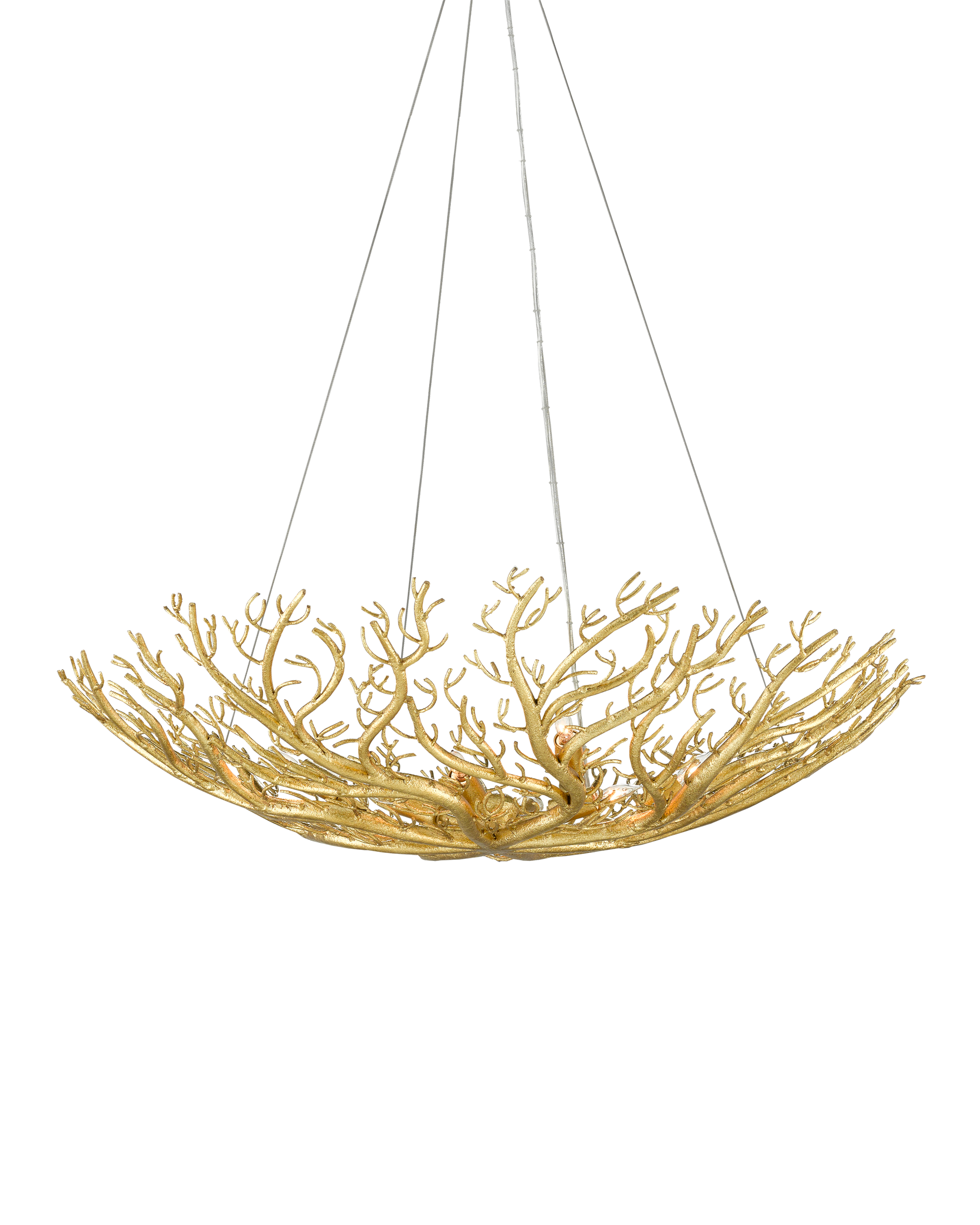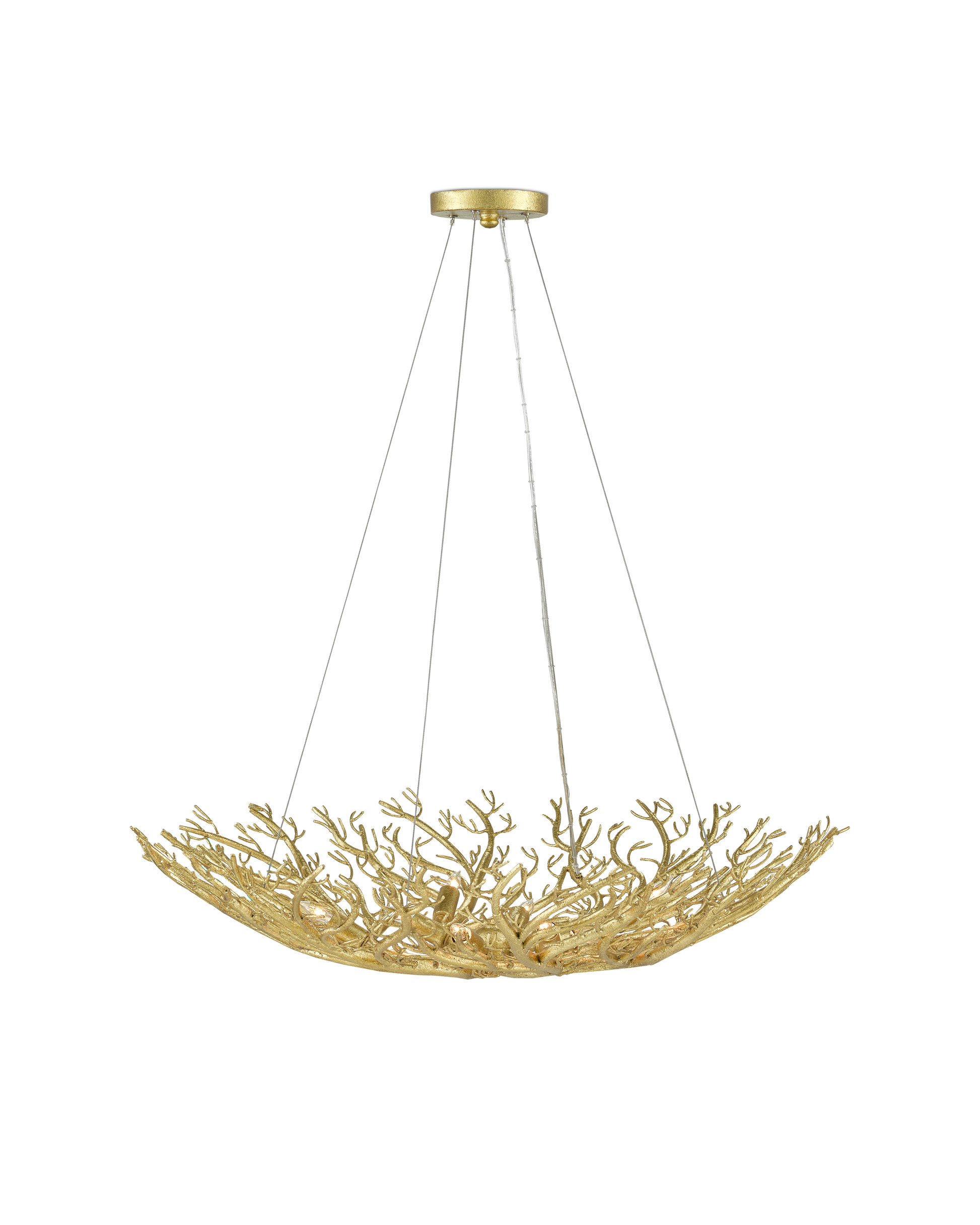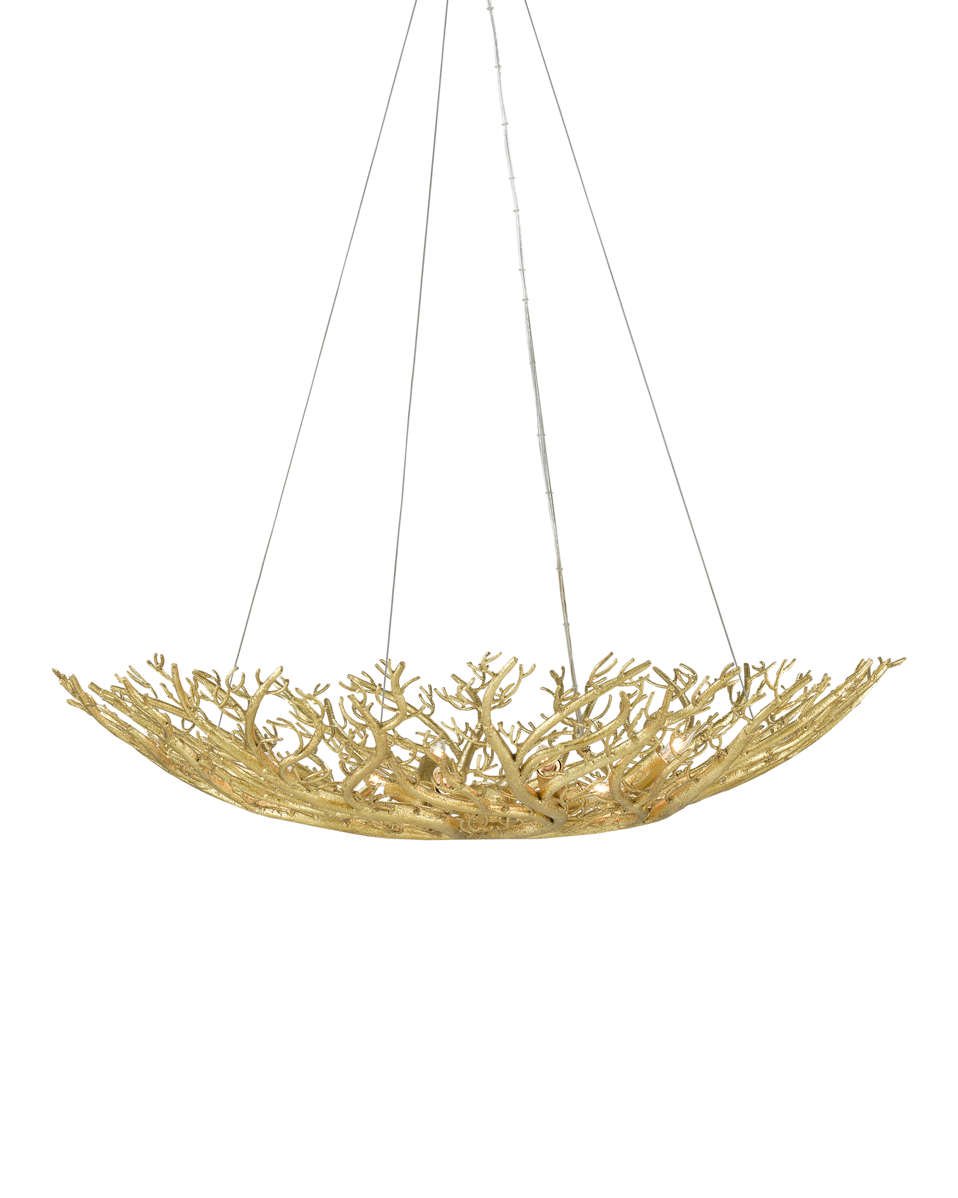 Sprays of wrought iron in a gold gilt finish flutter up to form the shade of the Sea Fan Bowl Chandelier, designed by Aviva Stanoff. She says of the inspiration for the design of this gold chandelier, "When I had my DNA test done, it turned out I am 12% mermaid! As a native Californian, the sea has always been by my side and has kept my secrets. I have a deep reverence for nature and particularly the ocean, and sea fans that live underwater remind us that we live among tides, that life is cyclical, and that there is beauty in believing in magic." Adjustable from 19.25" to 129.25" with use of included chain/rod kit/cable. If your space calls for a longer drop, additional chain/rods/cable is available for purchase.