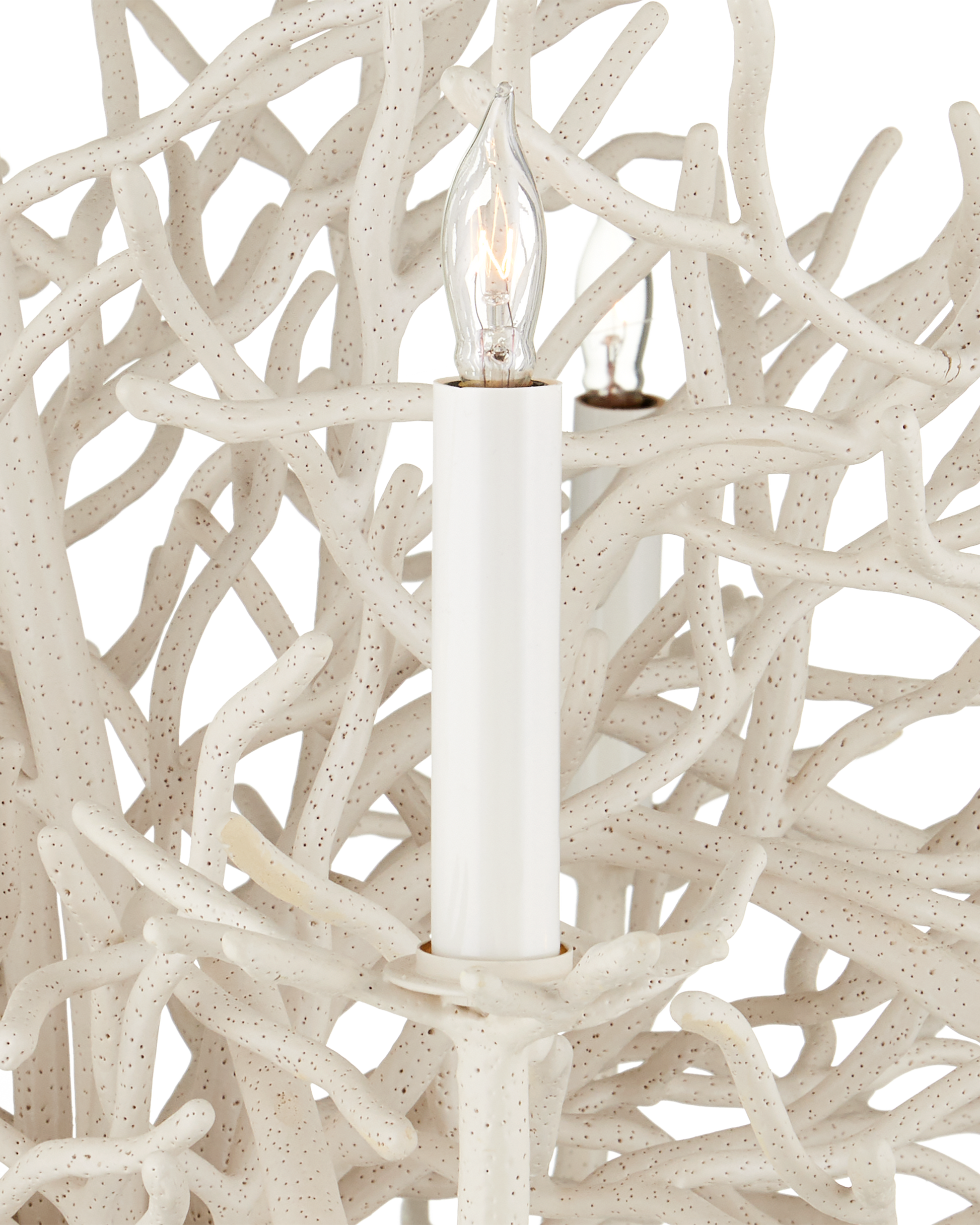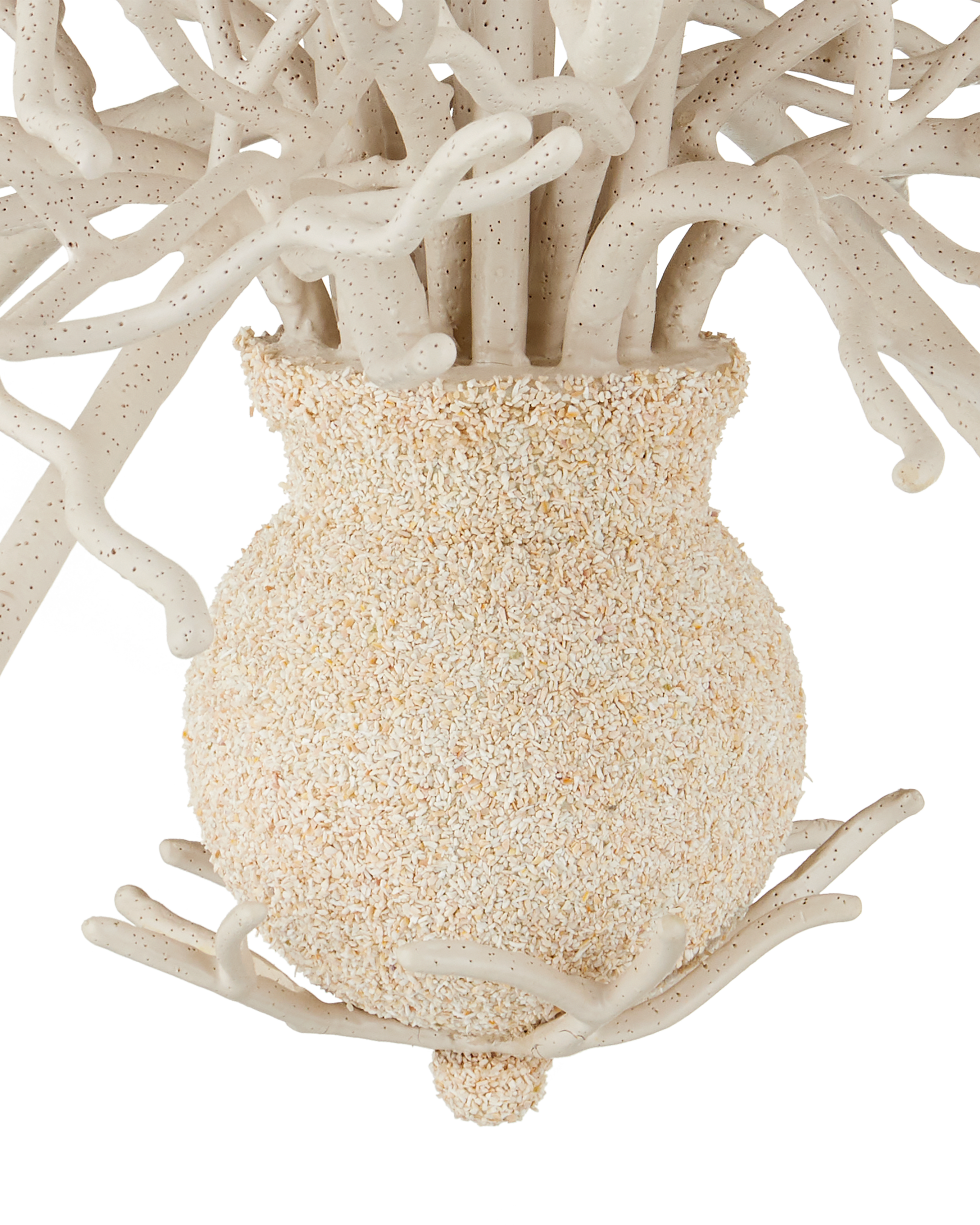 The Seaward Large Chandelier is made of wrought iron beautifully sculpted to resemble white coral. Covered in an application of sand, this lovely ivory chandelier is anchored at the bottom by a textural pot from which its arms extend. Adjustable from 52" to 76" with use of included chain/rod kit/cable. If your space calls for a longer drop, additional chain/rods/cable is available for purchase.