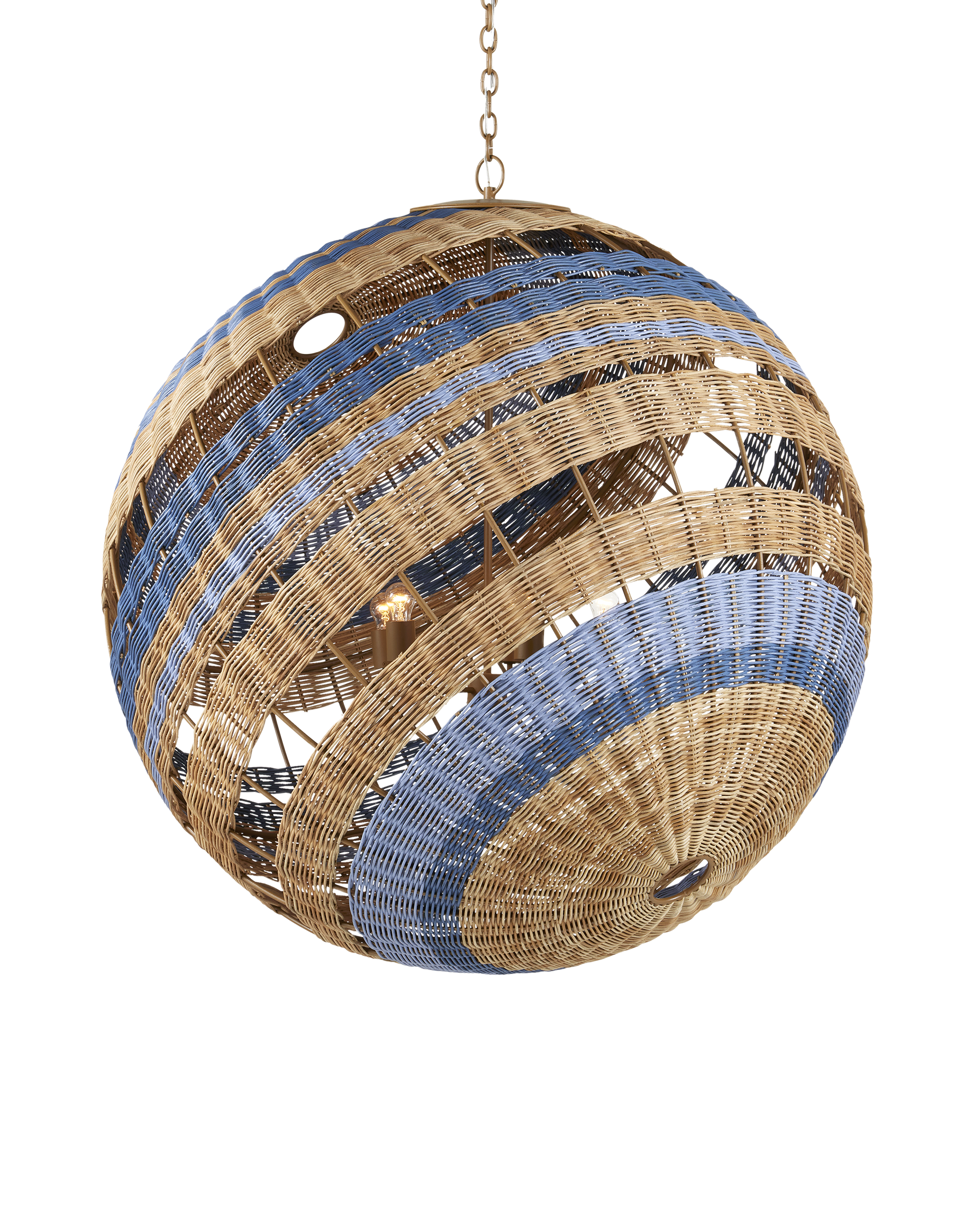 Hiroshi Koshitaka envisioned the Senjyo Tilted Orb Chandelier as one of a number of fixtures he sees as fulfilling Saisei, a concept that encompasses the acts involved in regeneration and reproduction as we restore, revive, and experience regrowth and rebirth. Rattan is woven around a wrought iron frame in stripes that graduate from a khaki finish to Bluebonnet and Cornflower blue finishes. With this tan and blue pendant, Koshitaka stays true to exploring his fascination with the Color Field tradition of the 1940s, which has been a constant in his repertoire for decades. Adjustable from 60.75" to 149.75" with use of included chain/rod kit/cable. If your space calls for a longer drop, additional chain/rods/cable is available for purchase.
