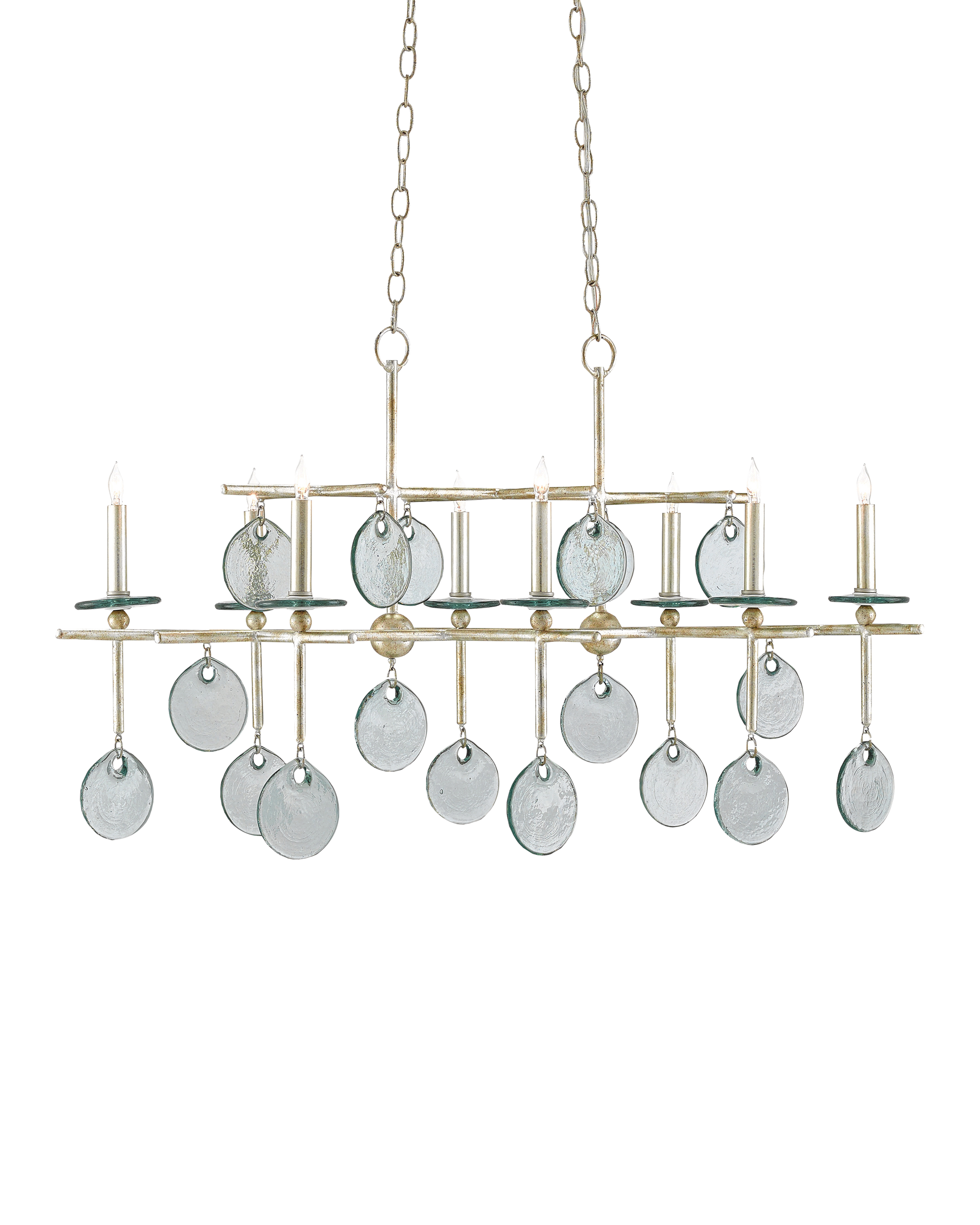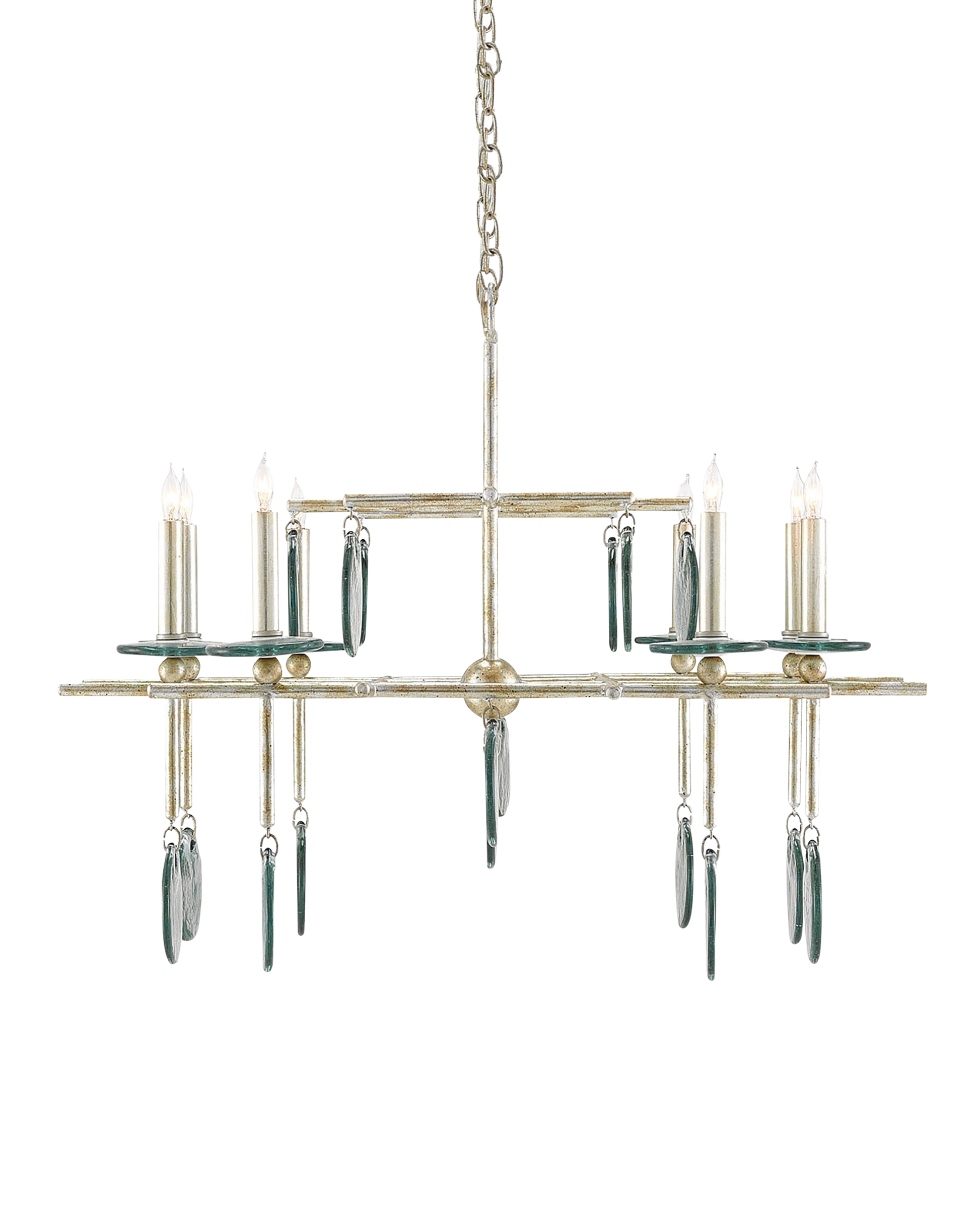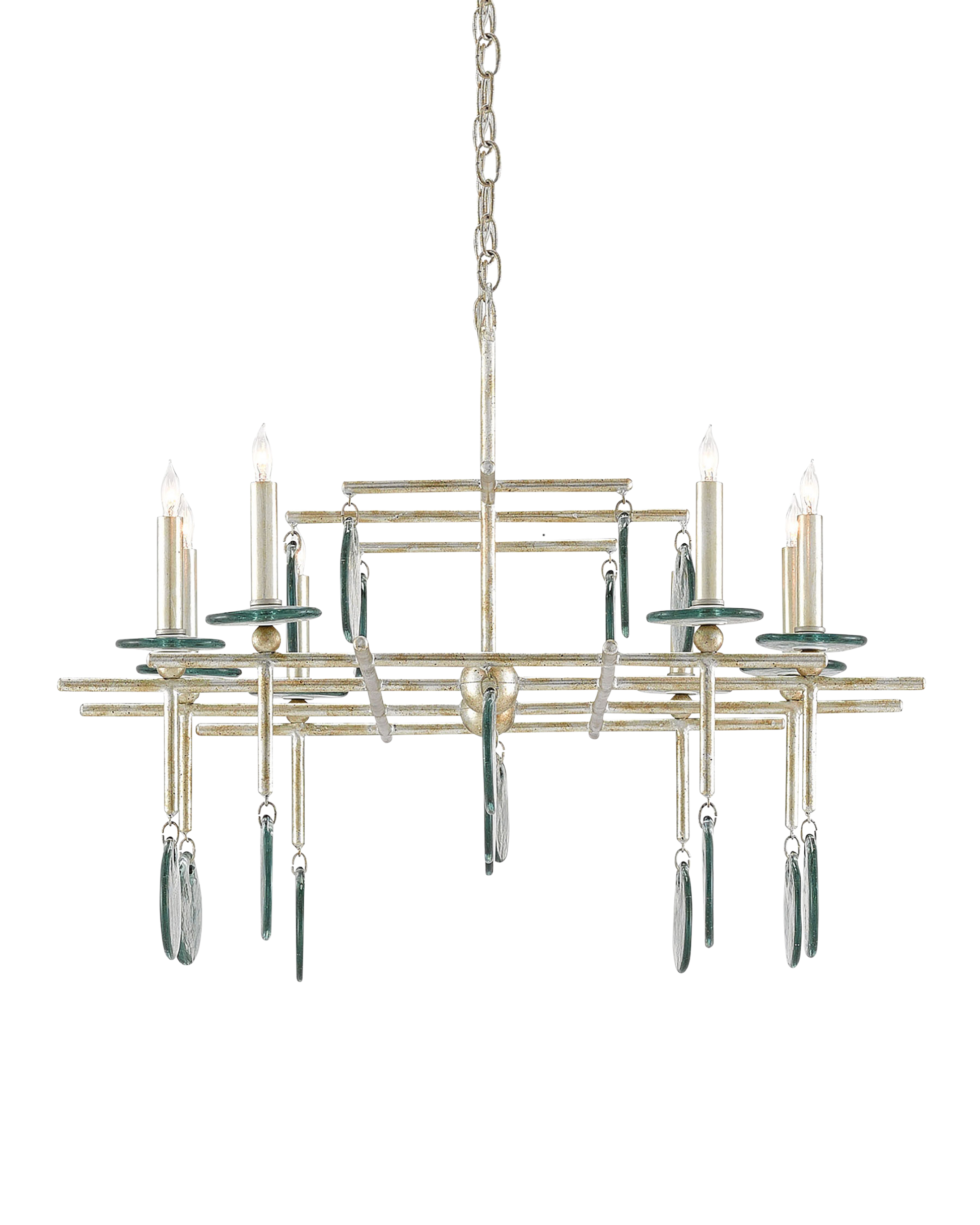 The Sethos Silver Rectangular Chandelier has a linear wrought iron frame in a silver Granello finish that refences early American antiques. This and the discs of recycled glass dangling from its arms bring the silver chandelier a nostalgic feel. Adjustable from 28" to 97" with use of included chain/rod kit/cable. If your space calls for a longer drop, additional chain/rods/cable is available for purchase.