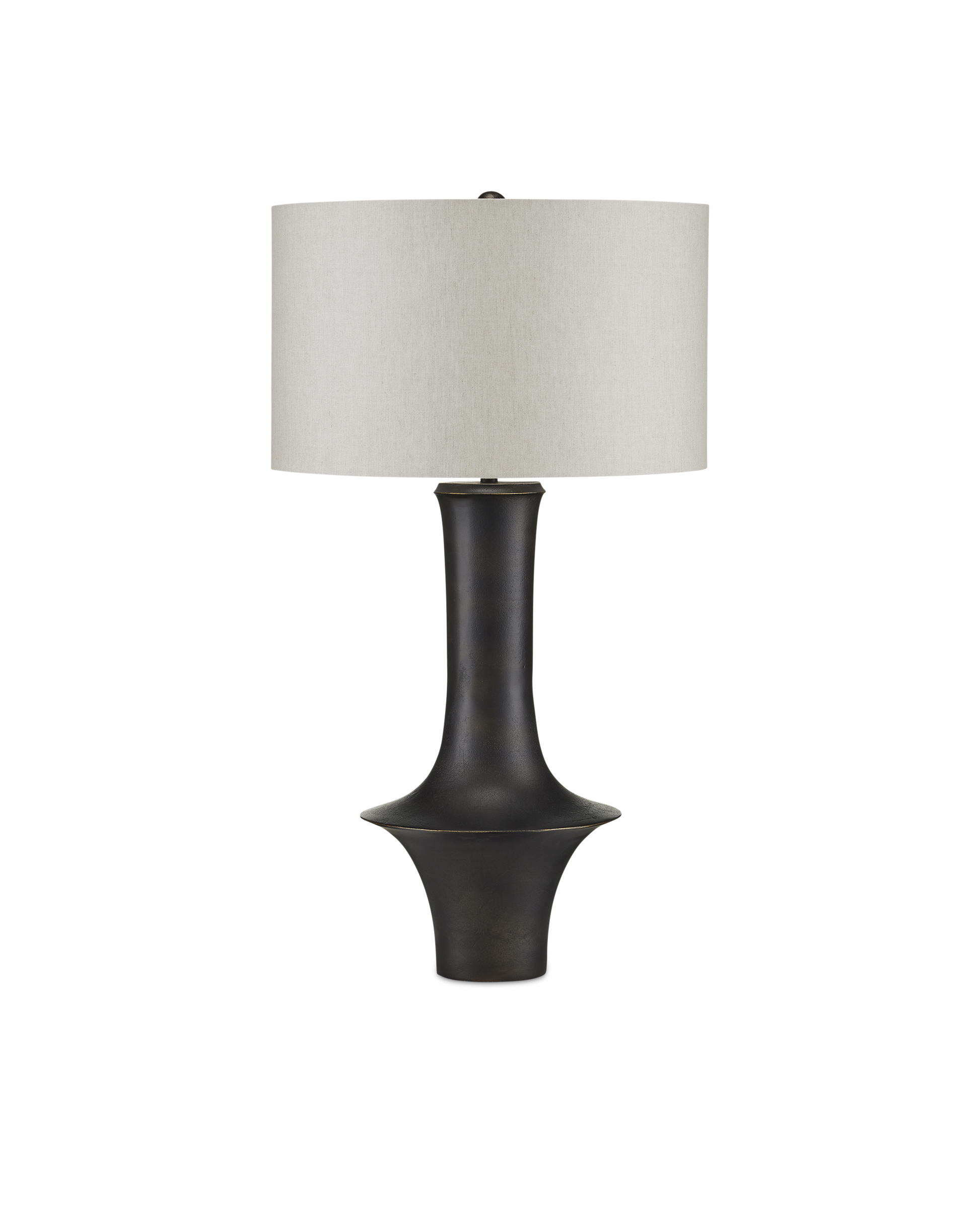 Pam Bailey and Christina Pomroy designed the Silvestri Black Table Lamp with its flaring shape that straddles the mid-century modern and industrial design eras. Made of cast aluminum in a matte black finish, the surface has a subtle pitting that was achieved through a sandcast method. The natural linen shade brings the black table lamp even more texture and heightens the warmth of the overall composition.