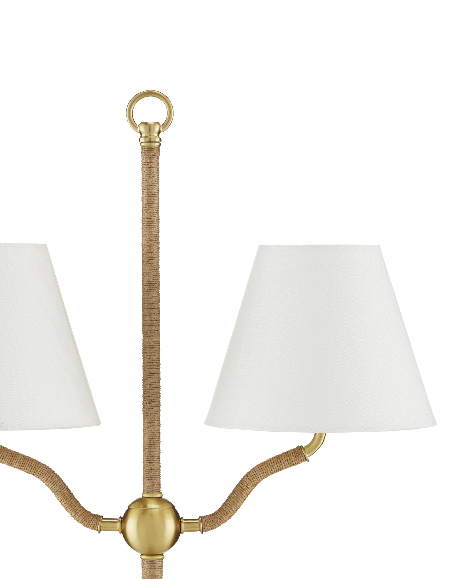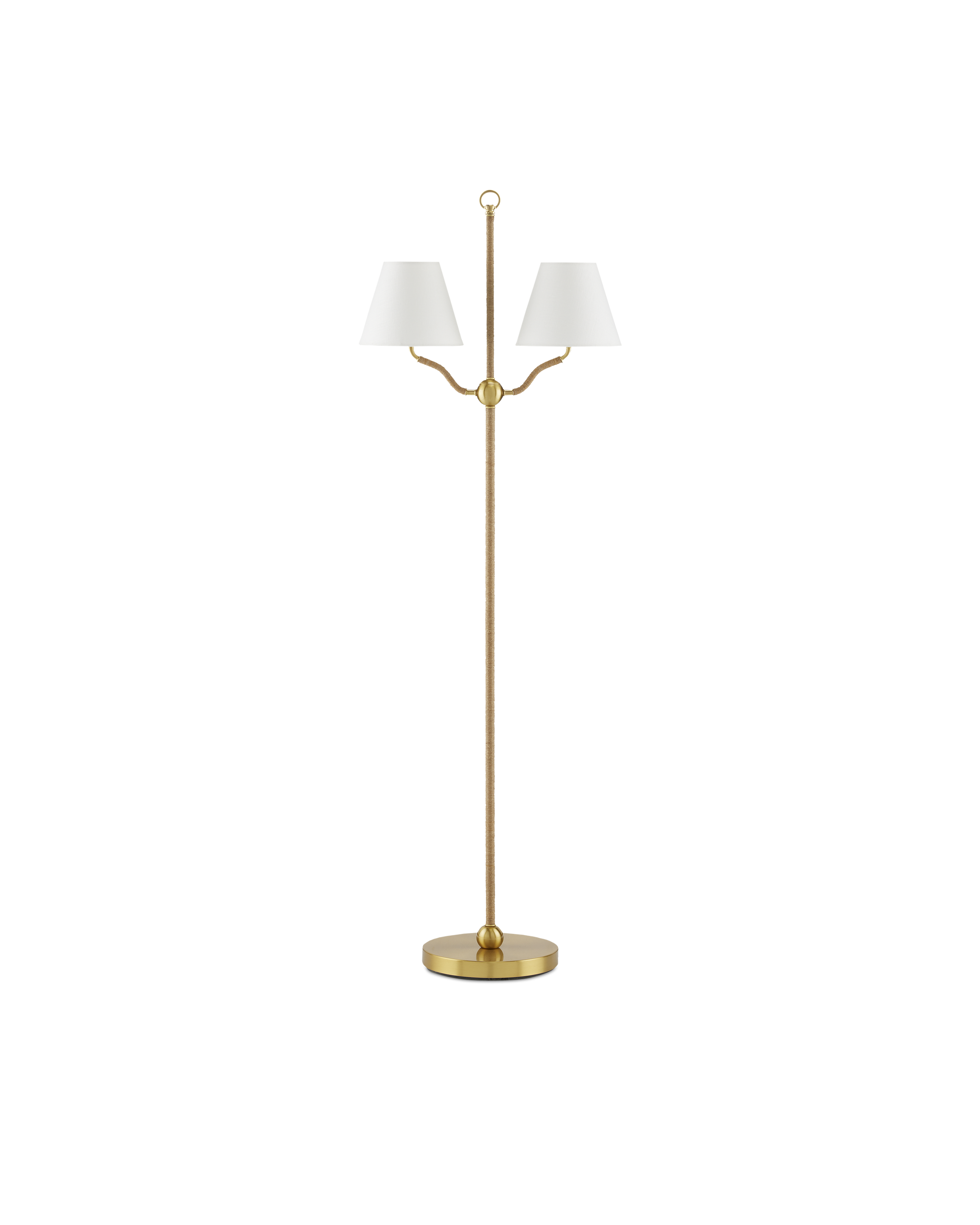 Tom Caldwell created a light profile for the Sirocco Floor Lamp and wrapped all but the main decorative elements in jute rope. These include the ring at its apex, the small globes at its base and the one connecting the forked arms, and the base itself. Made of steel and natural plated antique brass, the rope floor lamp is fitted with two off-white linen shades. This is a petite floor lamp designed to be a decorative accent in a space.