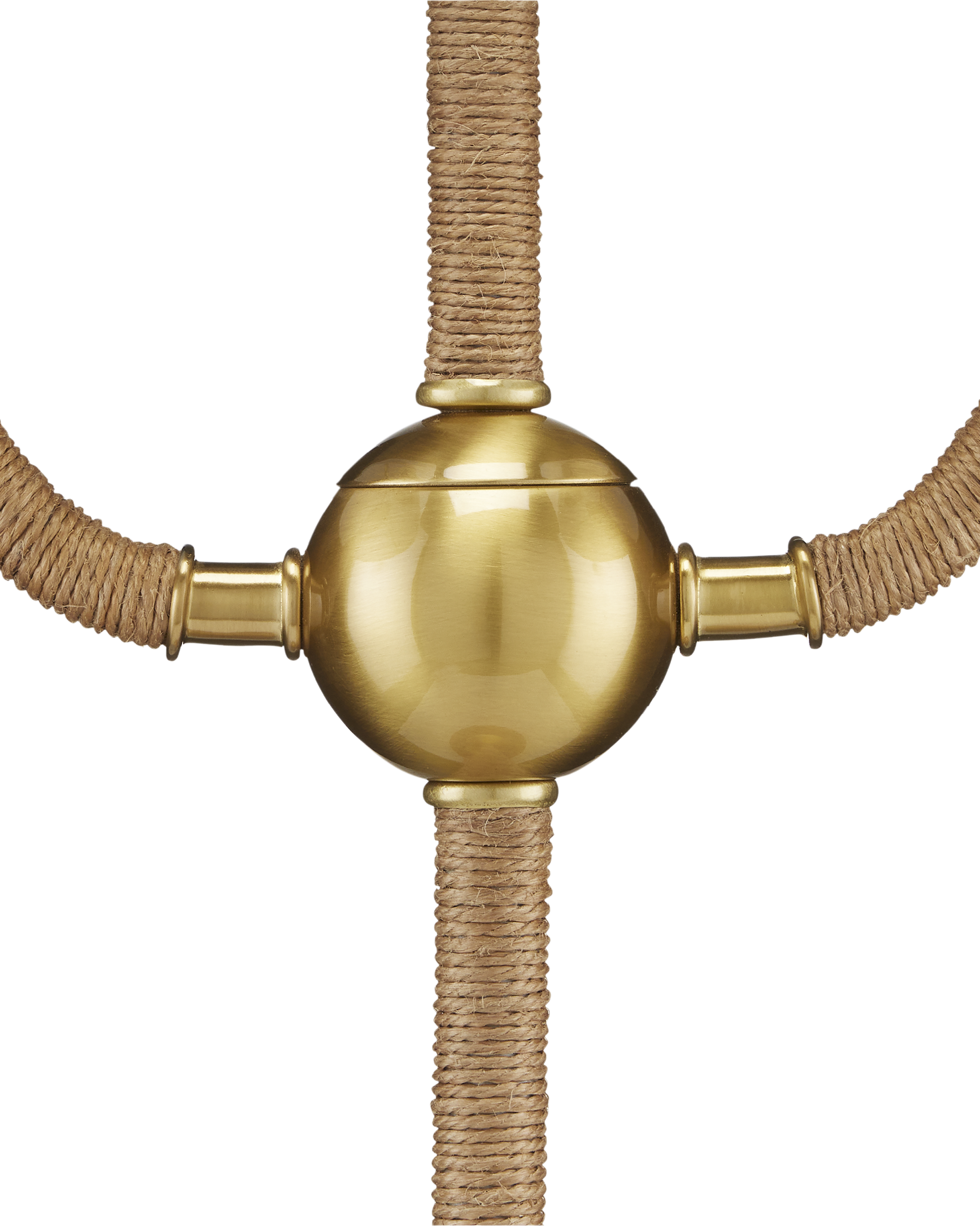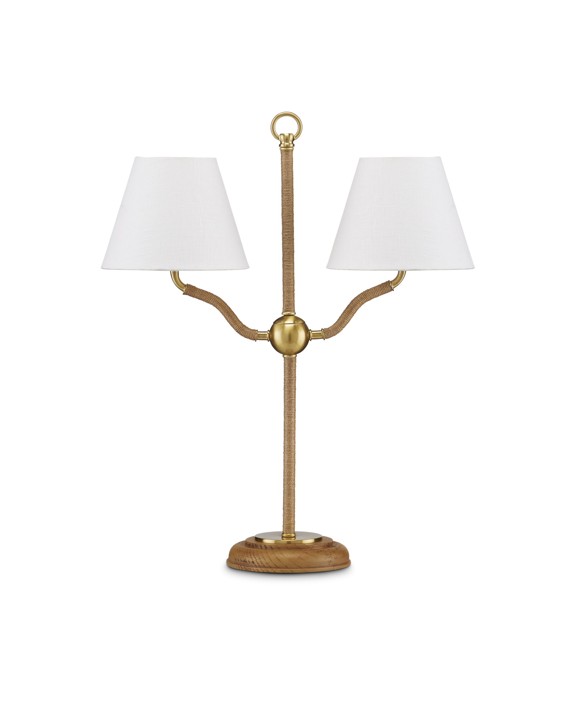 Tom Caldwell created a light profile for the Sirocco Desk Lamp and wrapped all but the main decorative elements in jute rope. These include the ring at its apex, the small globe connecting the forked arms, and the base itself. Made of wood and plated antique brass, the rope desk lamp is fitted with two off-white linen shades. This is a dressy desk lamp that was designed to be a decorative and fucntional accent in a space.