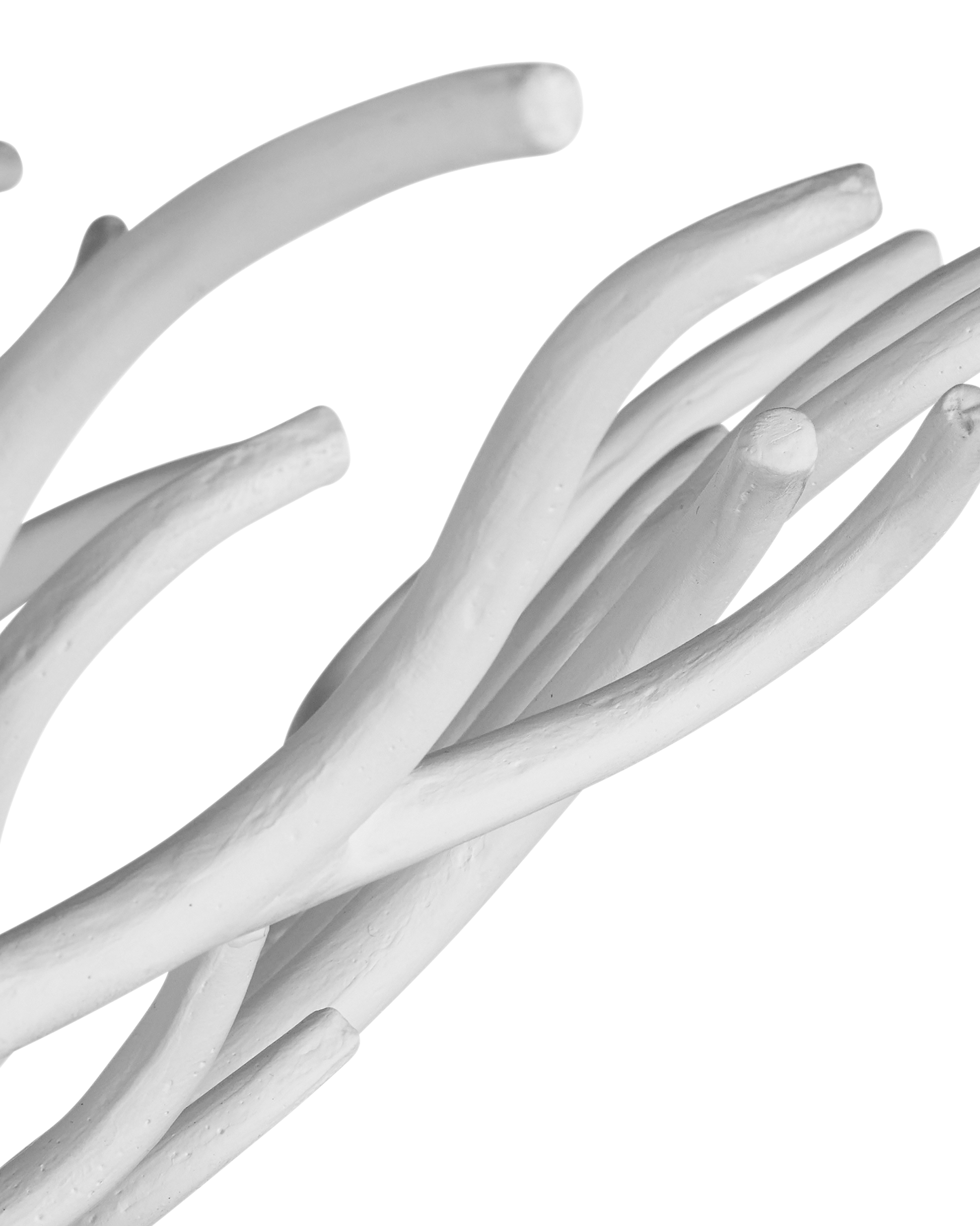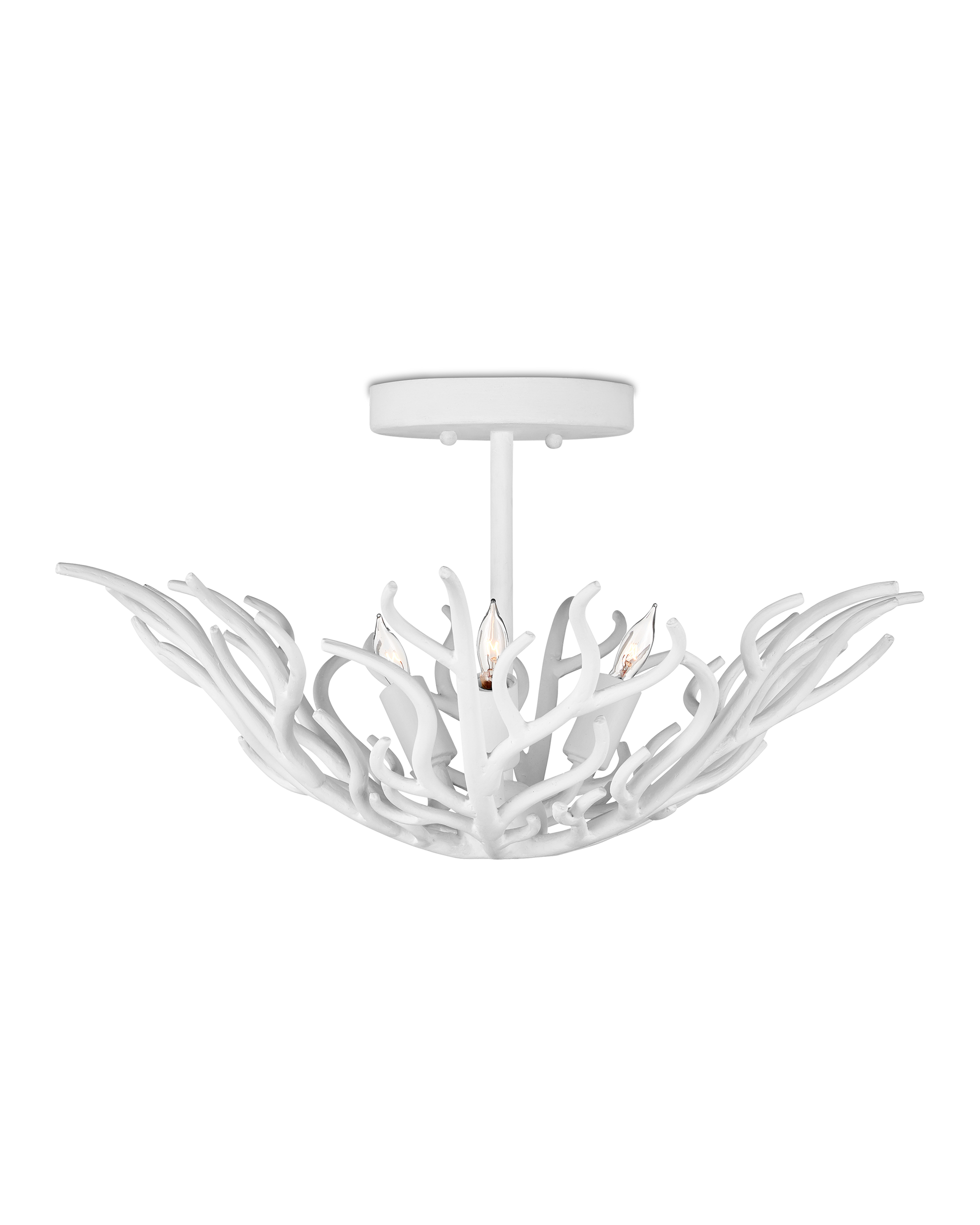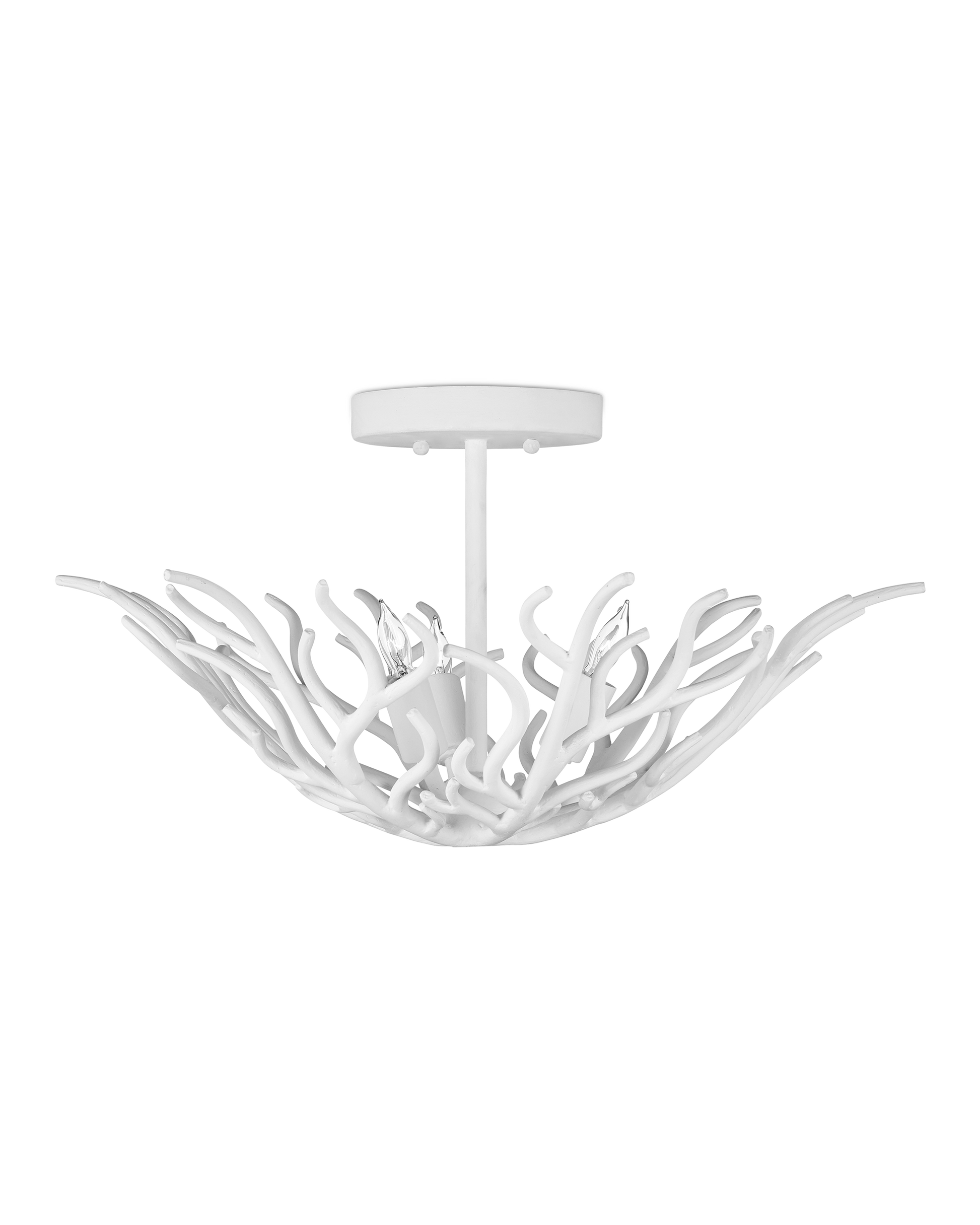 The Snowfall Semi-Flush Mount is made of wrought iron in a gesso white finish. Given it is made from resolute metal, it is a remarkably graceful design. Ian Thornton envisioned the white semi-flush to mimic the way snow sticks to branches after a winter storm. "The branches taper as they would in nature," he says. "I feel this fixture has a nice sense of movement."