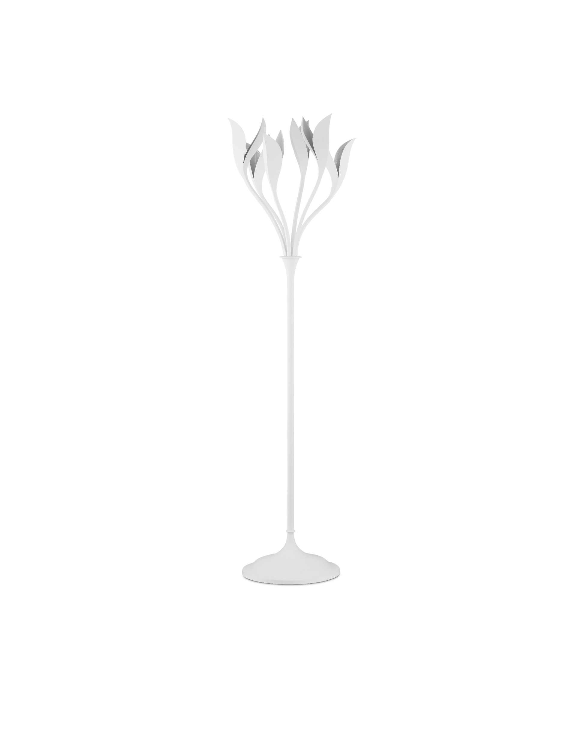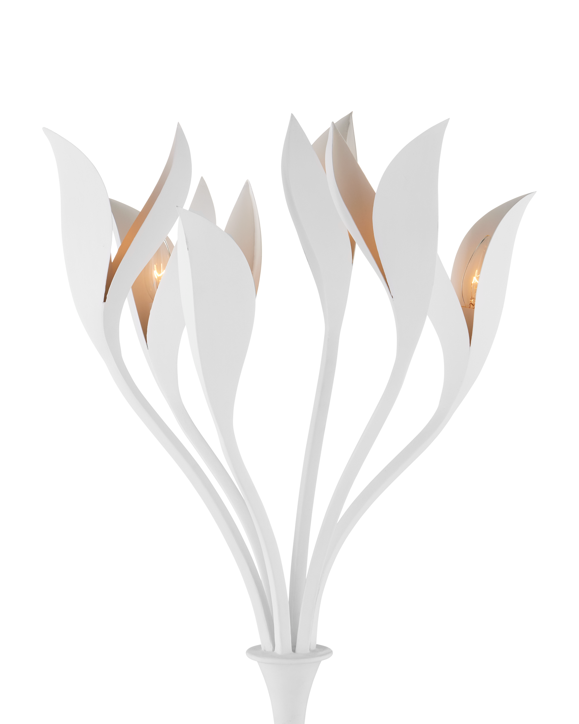 The big, beautiful blossoms of the Snowflower Floor Lamp and the body they flow up from are made of wrought iron in a gesso white finish. Unfolding toward the ceiling, the undulant petals direct the light upward. The pale finish that flows into the interiors of the blooms turns warm when the bulbs illuminate it. The white floor lamp with its wild botanical personality has a foot switch for ease of turning it off and on.