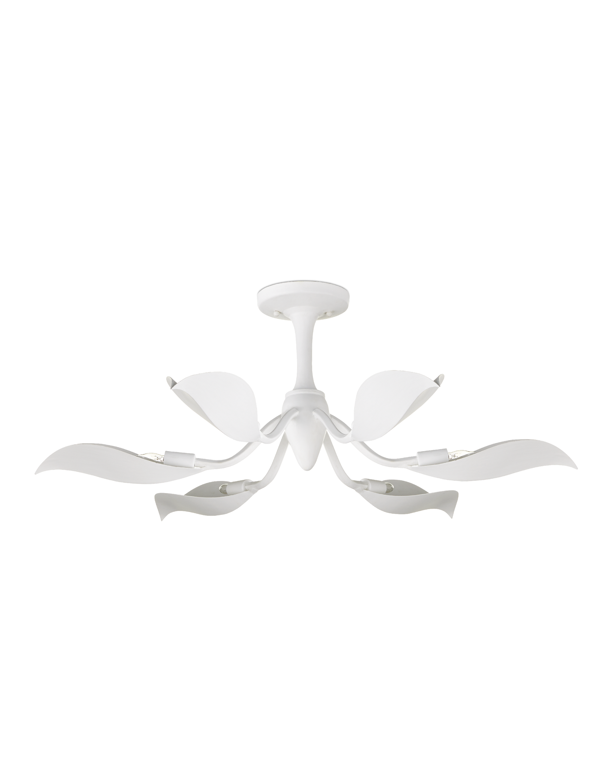 The big, beautiful blossoms of the Snowflower Semi-Flush Mount and the frame they flow from are made of wrought iron in a gesso white finish. Nodding toward the ceiling, the slightly folding petals direct the light upward. The crisp color of the finish will enhance the coolness of the illumination to create more brightness. The white semi-flush with its wild botanical personality will reflect any number of design styles with grace.