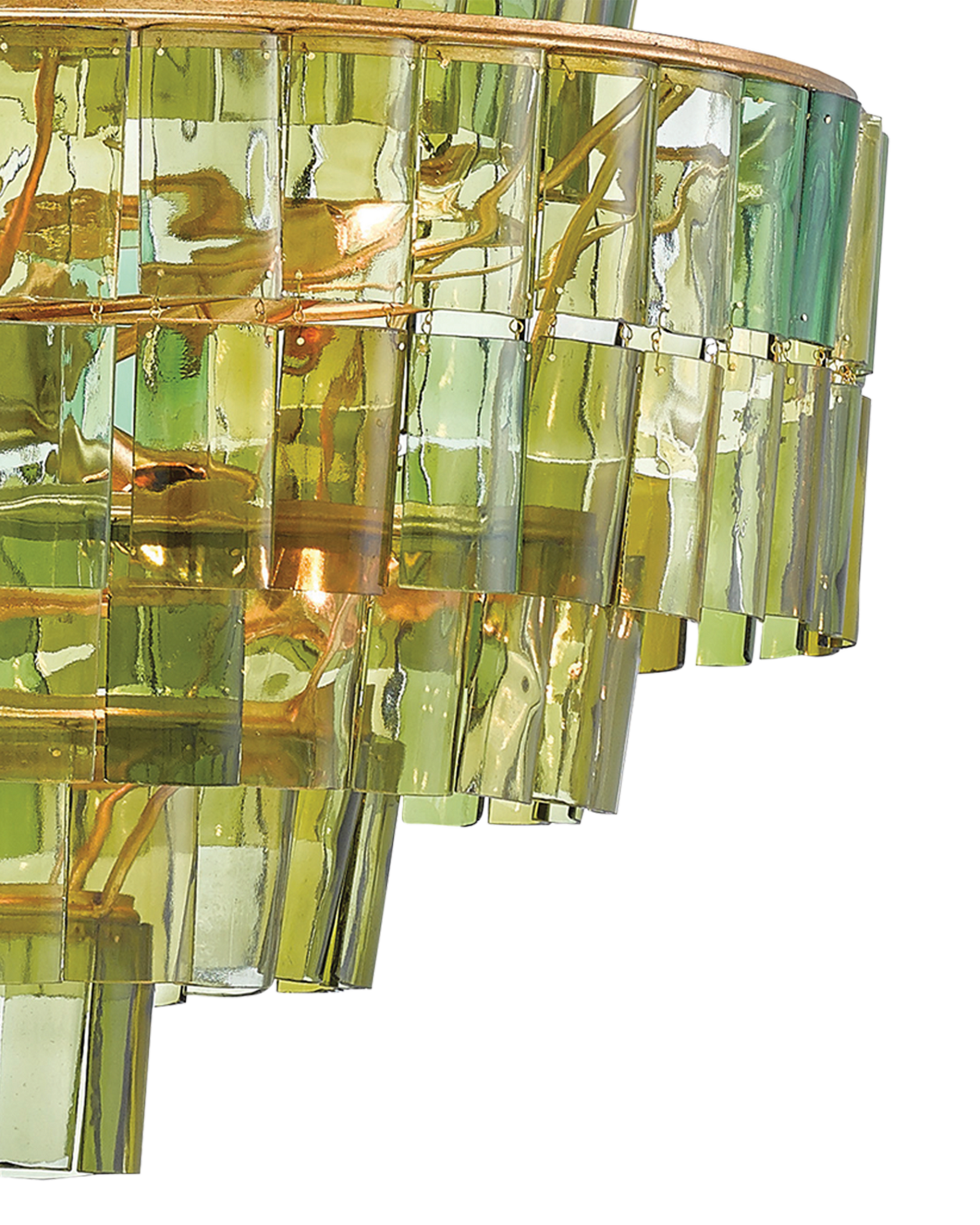 The distinctive green hues of the recycled wine bottles used to make the Sommelier Chandelier bring this fixture its feeling of luminosity. Natural uneven textures on the hanging glass pieces affixed to the green chandelier are accentuated by a dark contemporary gold leaf finish. Adjustable from 31" to 100" with use of included chain/rod kit/cable. If your space calls for a longer drop, additional chain/rods/cable is available for purchase.