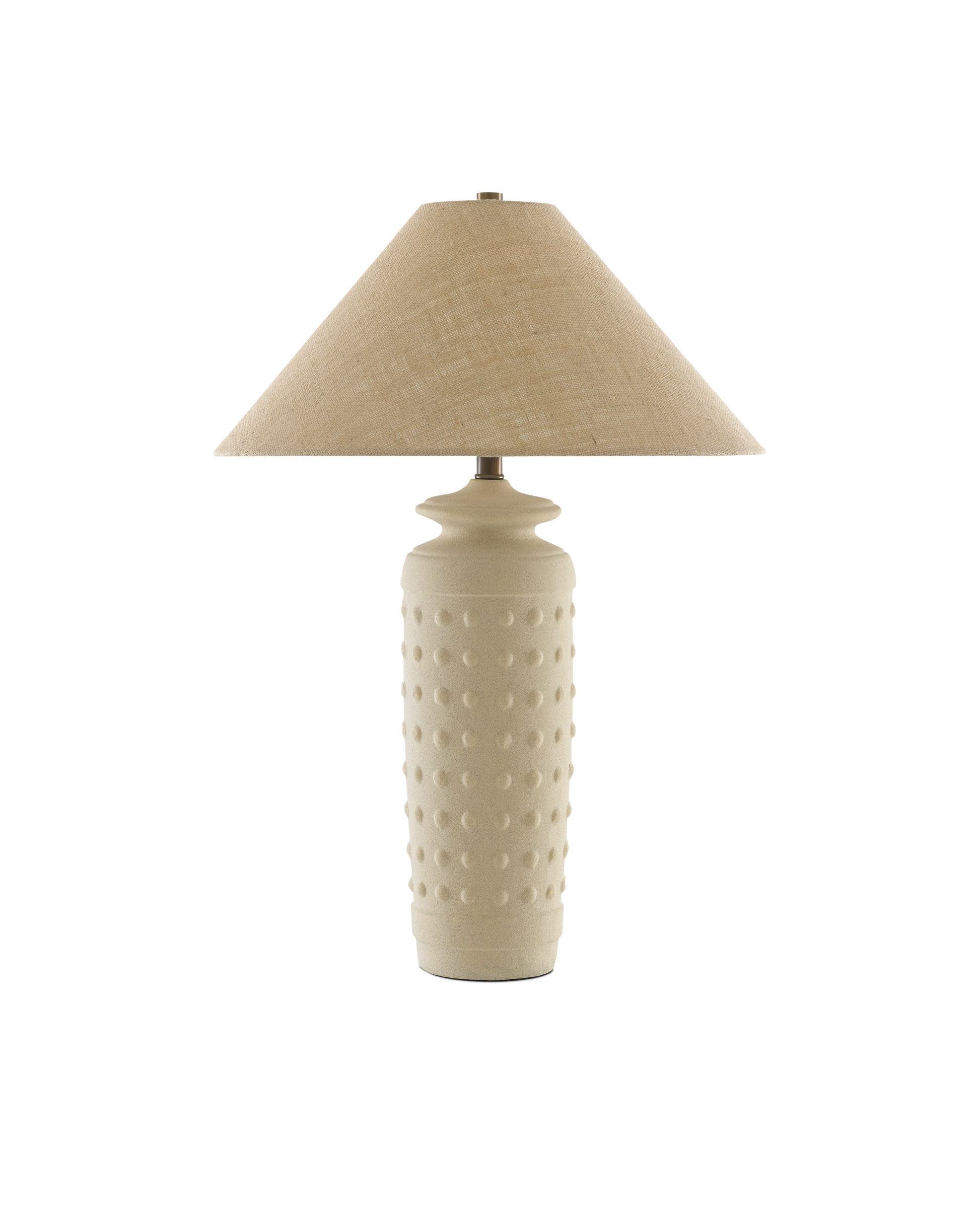 The matte surface of the Sonoran Table Lamp makes this a bisque beauty. Made of terracotta in a sand hue, the ivory lamp has rows of raised circles pressed into its surface. The Sonoran is topped with a natural burlap shade.