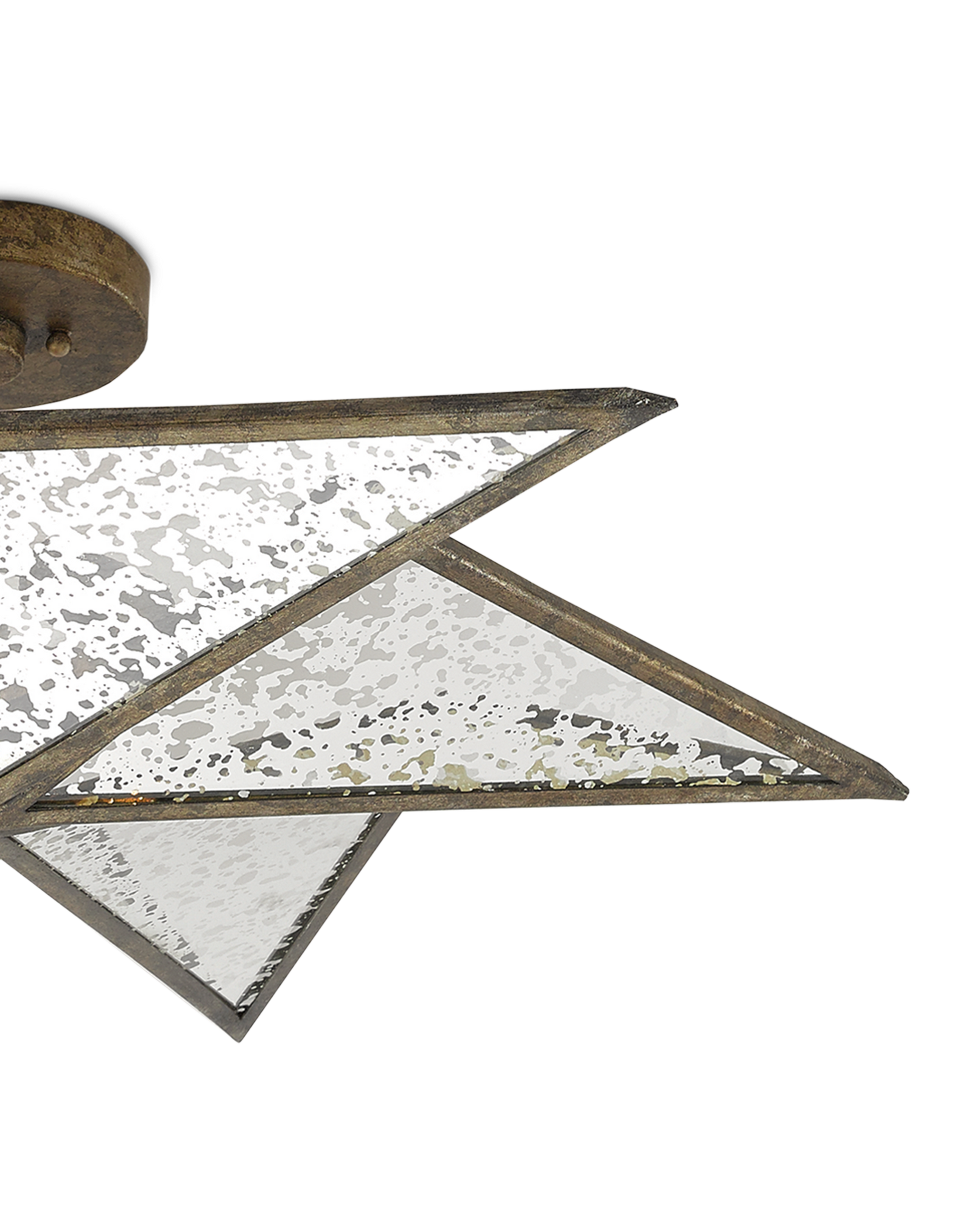 The distinctive shape of the Stargazer Semi-Flush is made of wrought iron in a Pyrite bronze finish inset with raj mirror panels. These are slanted in such a way as to give the ceiling light a sense of movement. The mirrored semi-flush will reflect illumination on or off.