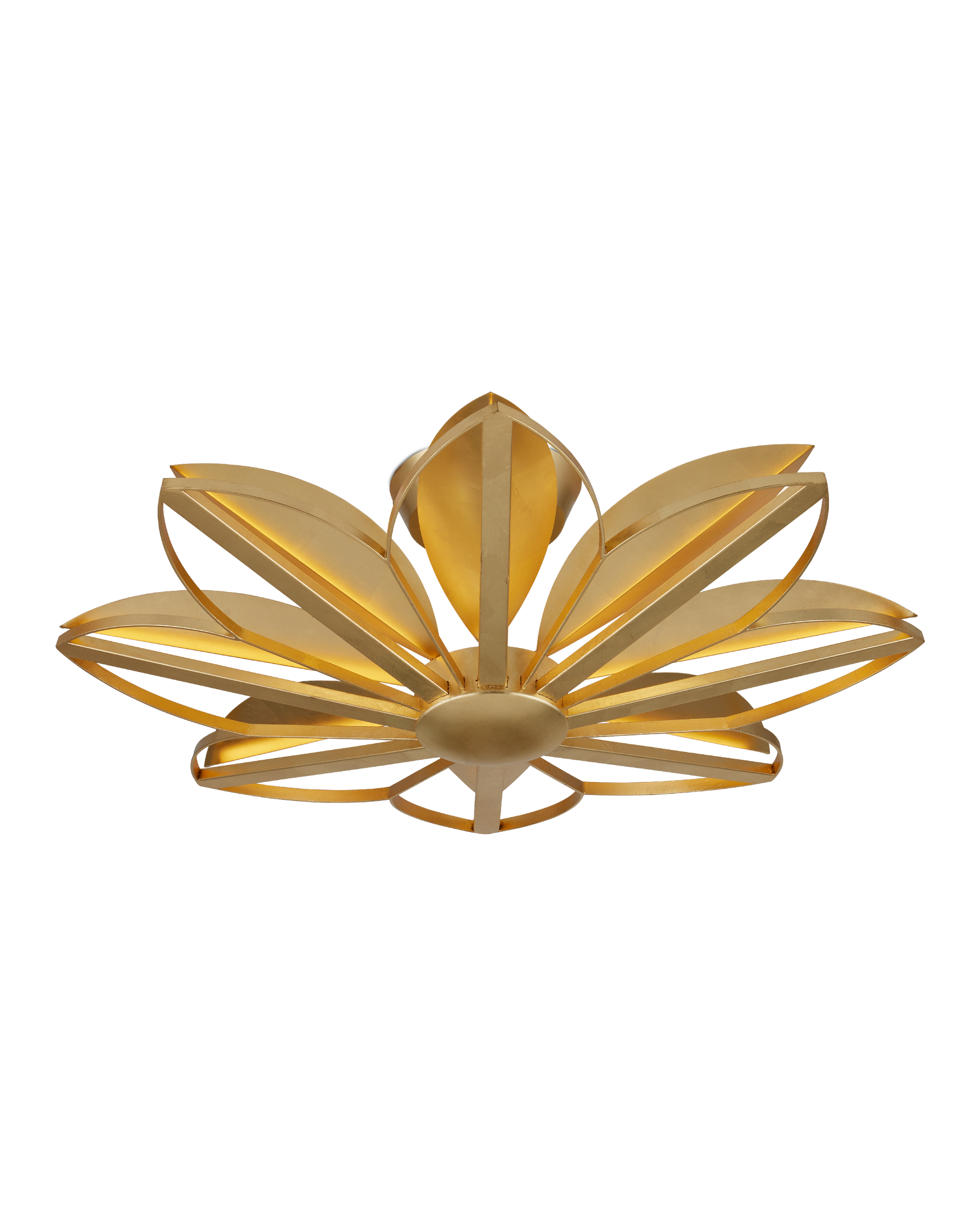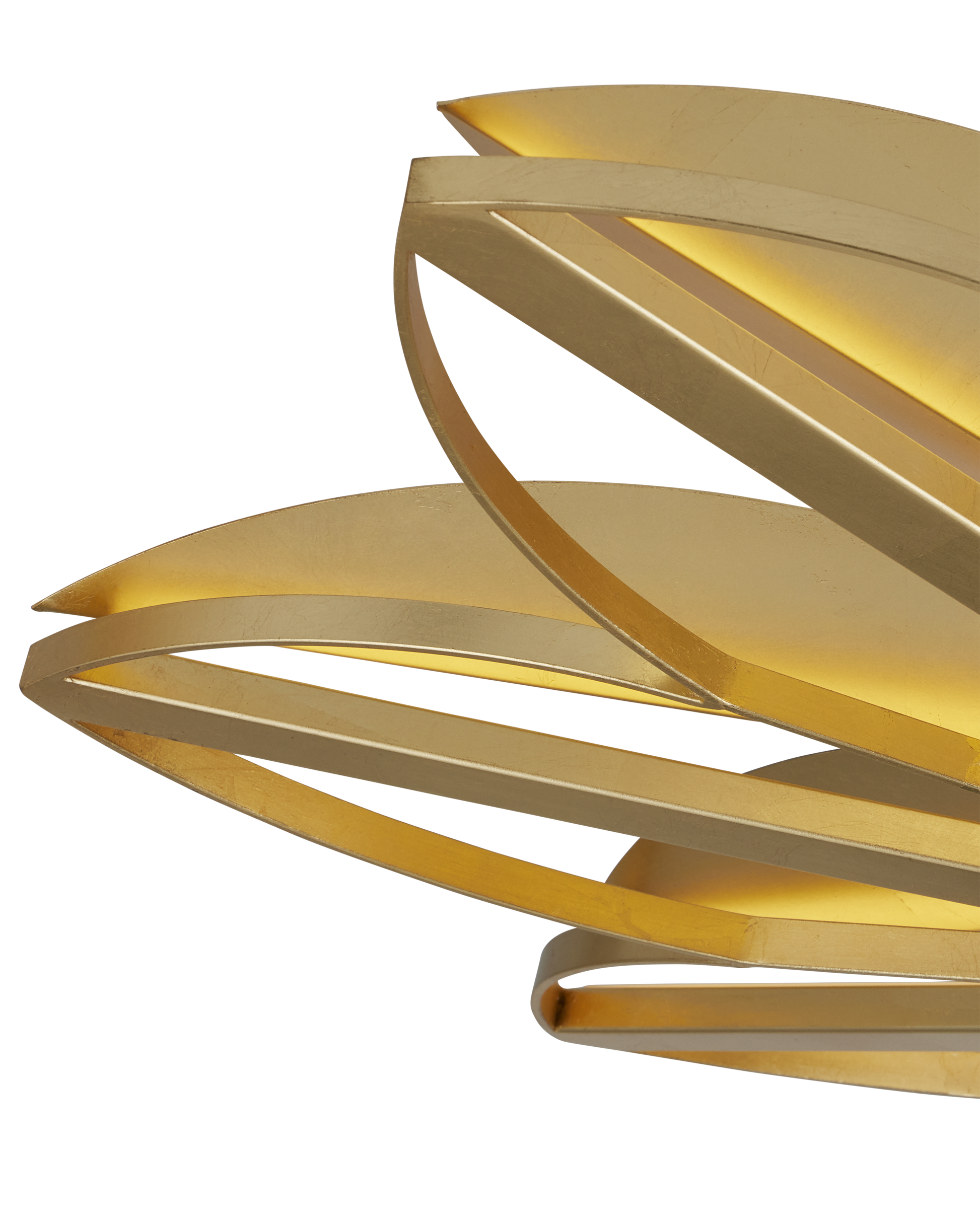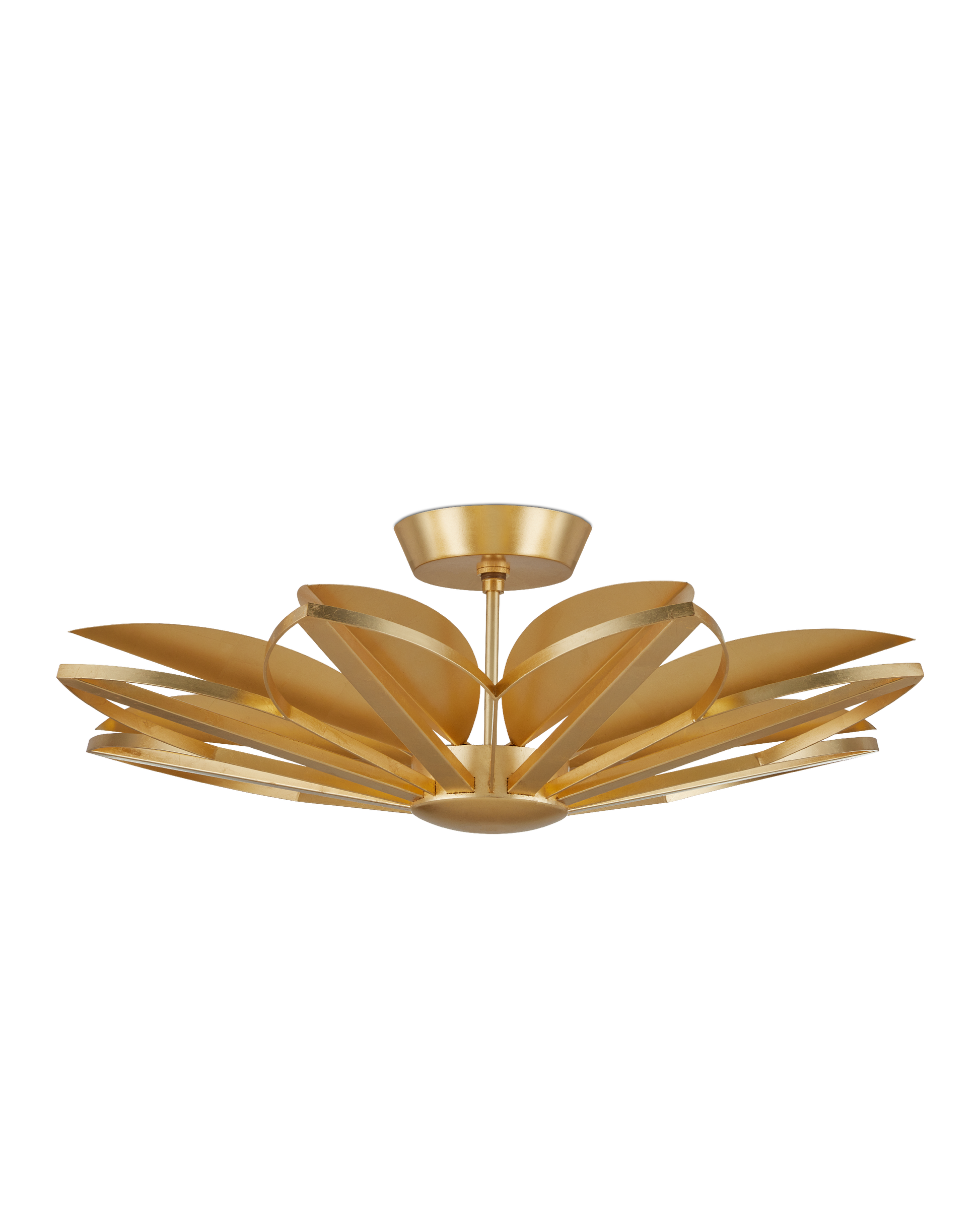 The Stewart Semi-Flush is an artistic exploration of metal with its arcing bands that mimic the shapes of the leaves resting above them. Designed as a nod to botanicals, this fixture is covered in a brilliant gold leaf finish. Bouncing light onto the leaves while simultaneously reflecting it onto the ceiling to create a warm glow was the aim with this nature-inspired gold semi-flush.