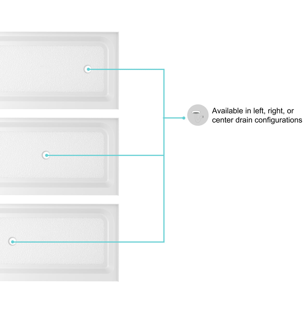 Upgrade your bathroom with our acrylic single threshold alcove shower base in glossy white and enjoy the perfect blend of style, safety, and quality for years to come! This rectangular masterpiece not only adds a touch of contemporary luxury to your space but also ensures top-notch safety and durability. Available in multiple sizes and three drain configurations (left, right, and center).