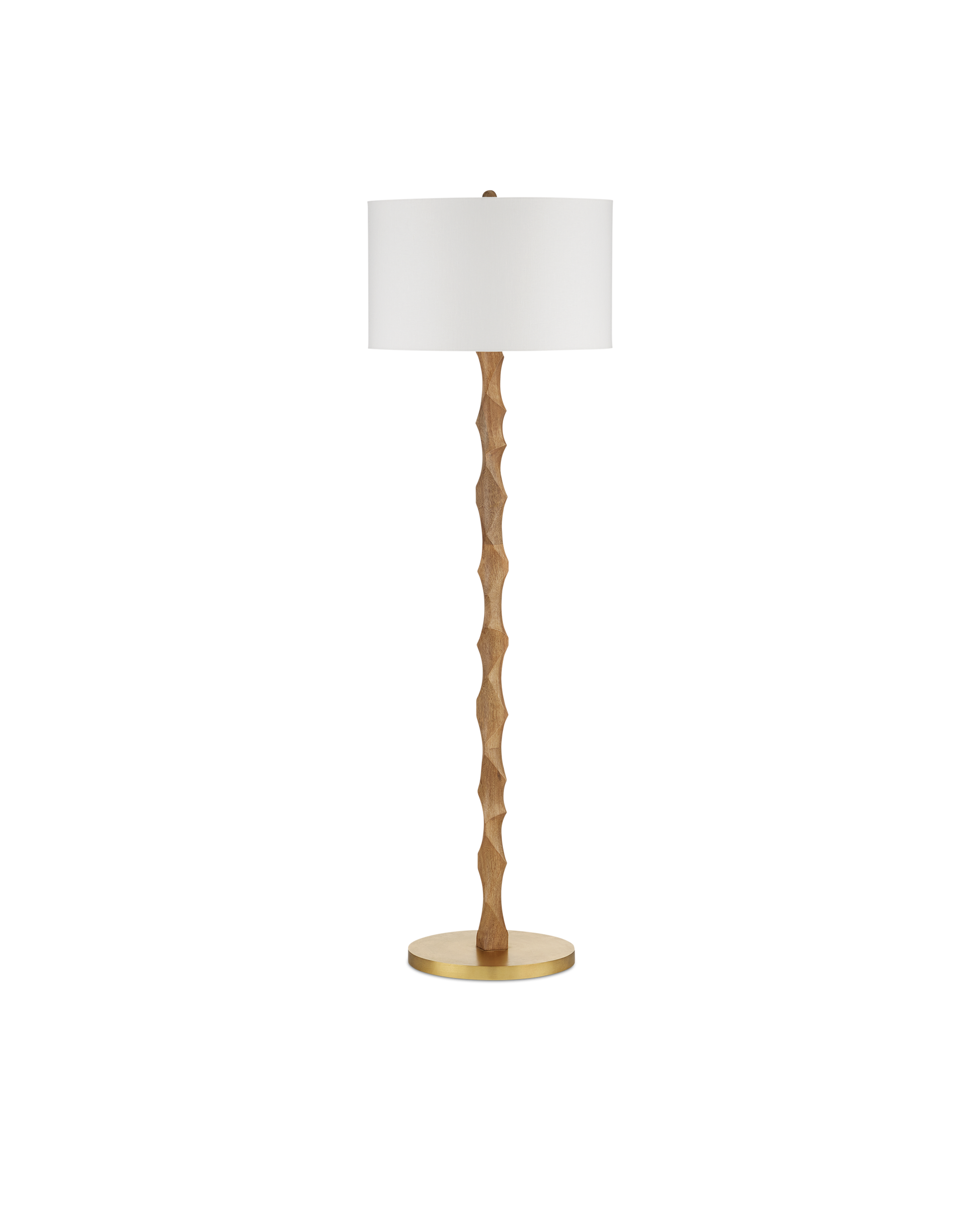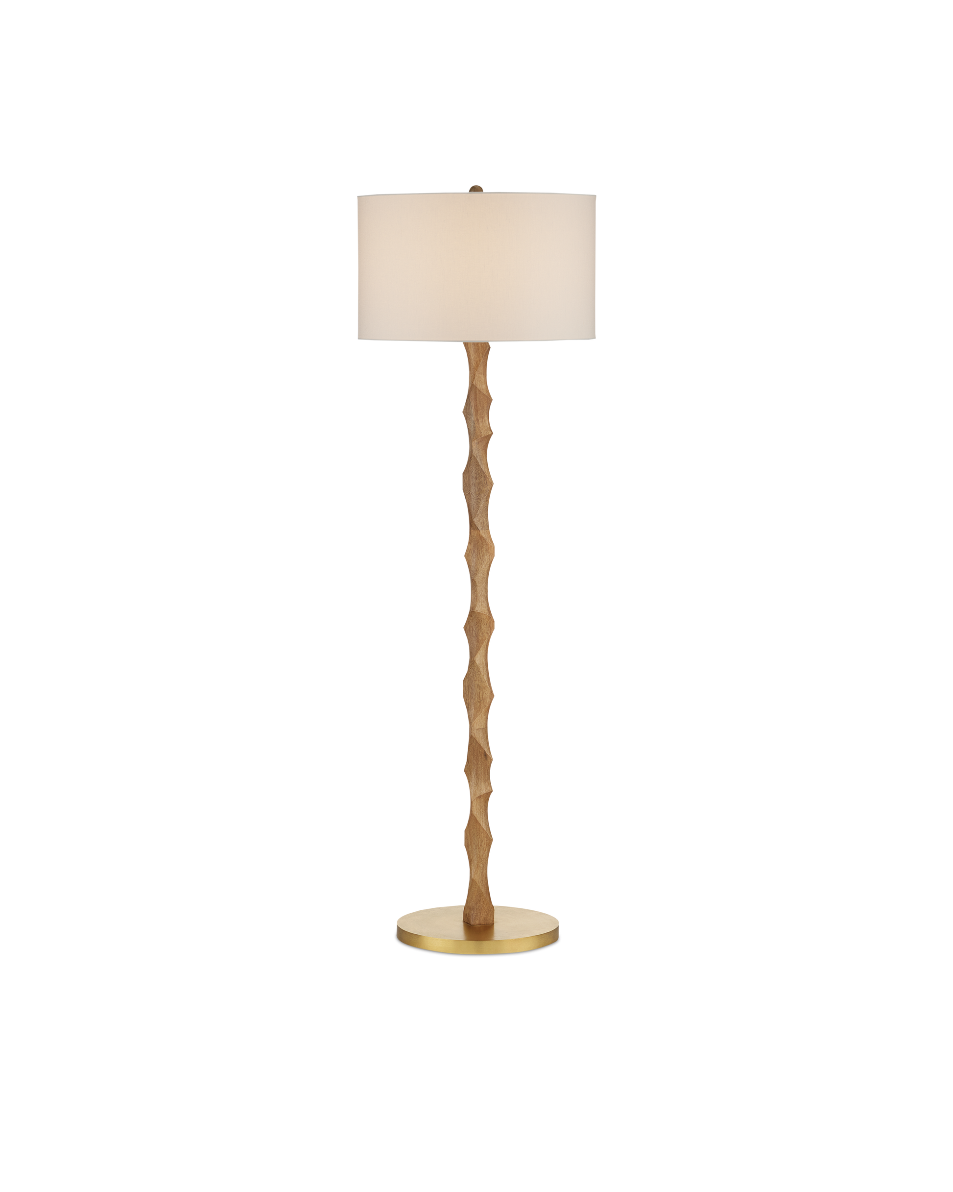 The undulant shape of the Sunbird Floor Lamp is achieved when wood is rotated on a machine to carve its outline. This requires great skill because it has to be manipulated at 90-degree angles to create both the smoothness of the surface and the knottiness of the shape. Ian Thornton was playing around with profiles to see what interesting shapes he might achieve when he conceived this graceful design. The tan lamp sits atop a metal base in a brass finish and is topped with an off white shantung shade.