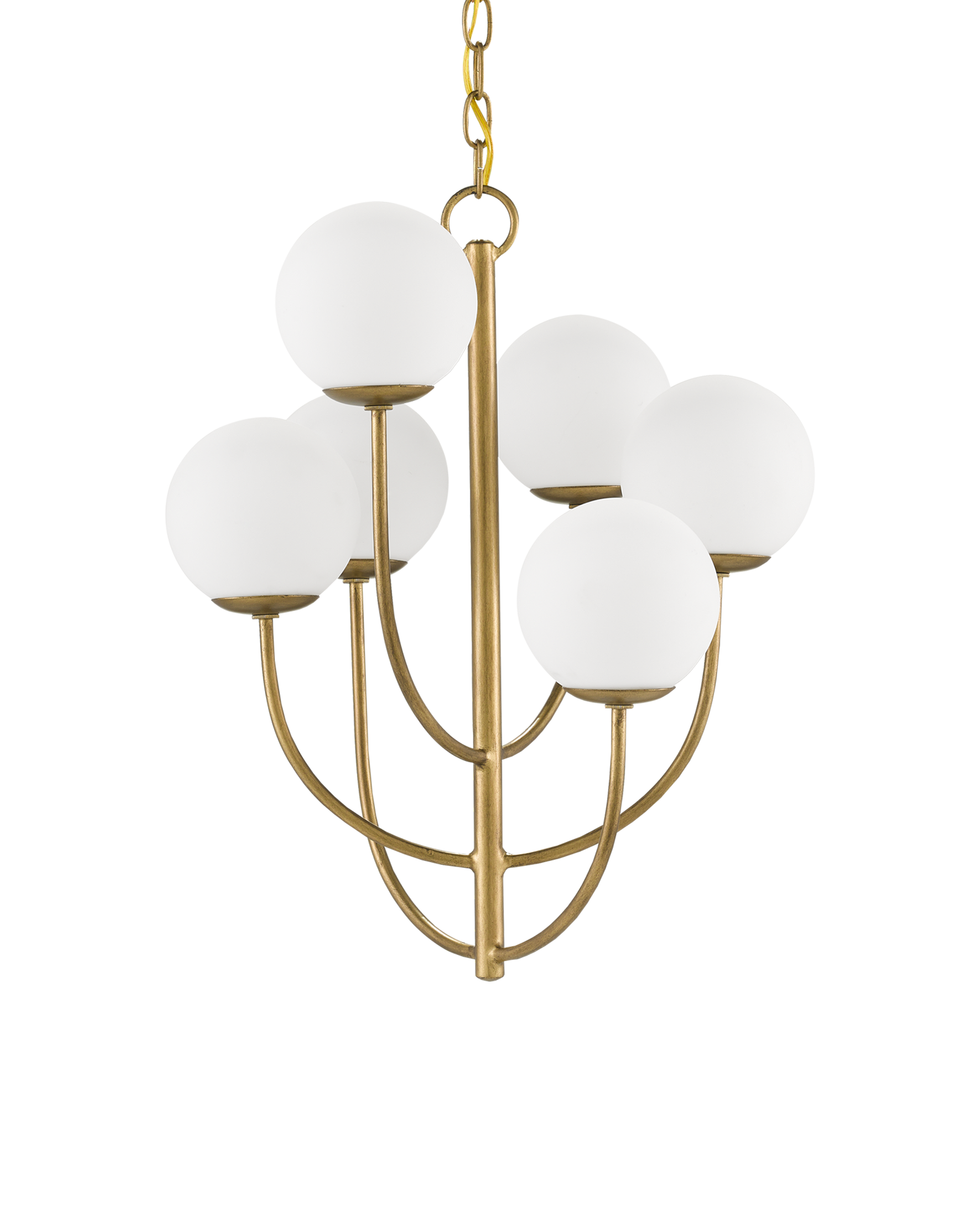 When mid-century modern was at its height, white glass globes were central to the designs produced by some of the greatest visionaries who've ever conceived products for the home. The Sunnylands Chandelier has this verve in its DNA. Made of wrought iron in a new brass finish, the long thin stem and arcing arms hold six opaque white glass globes in a staggered design that makes it seriously chic. Adjustable from 27.5" to 95.5" with use of included chain/rod kit/cable. If your space calls for a longer drop, additional chain/rods/cable is available for purchase.