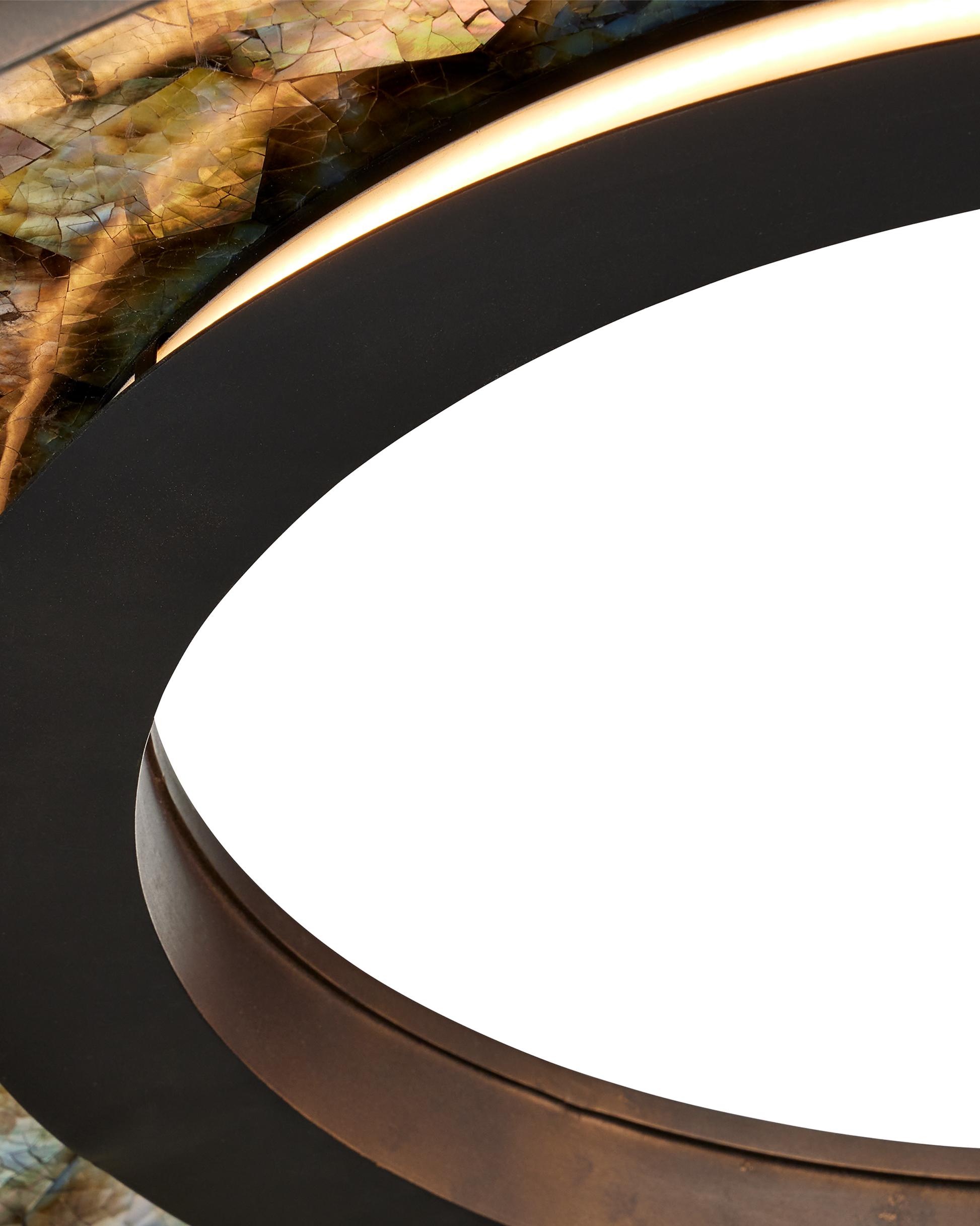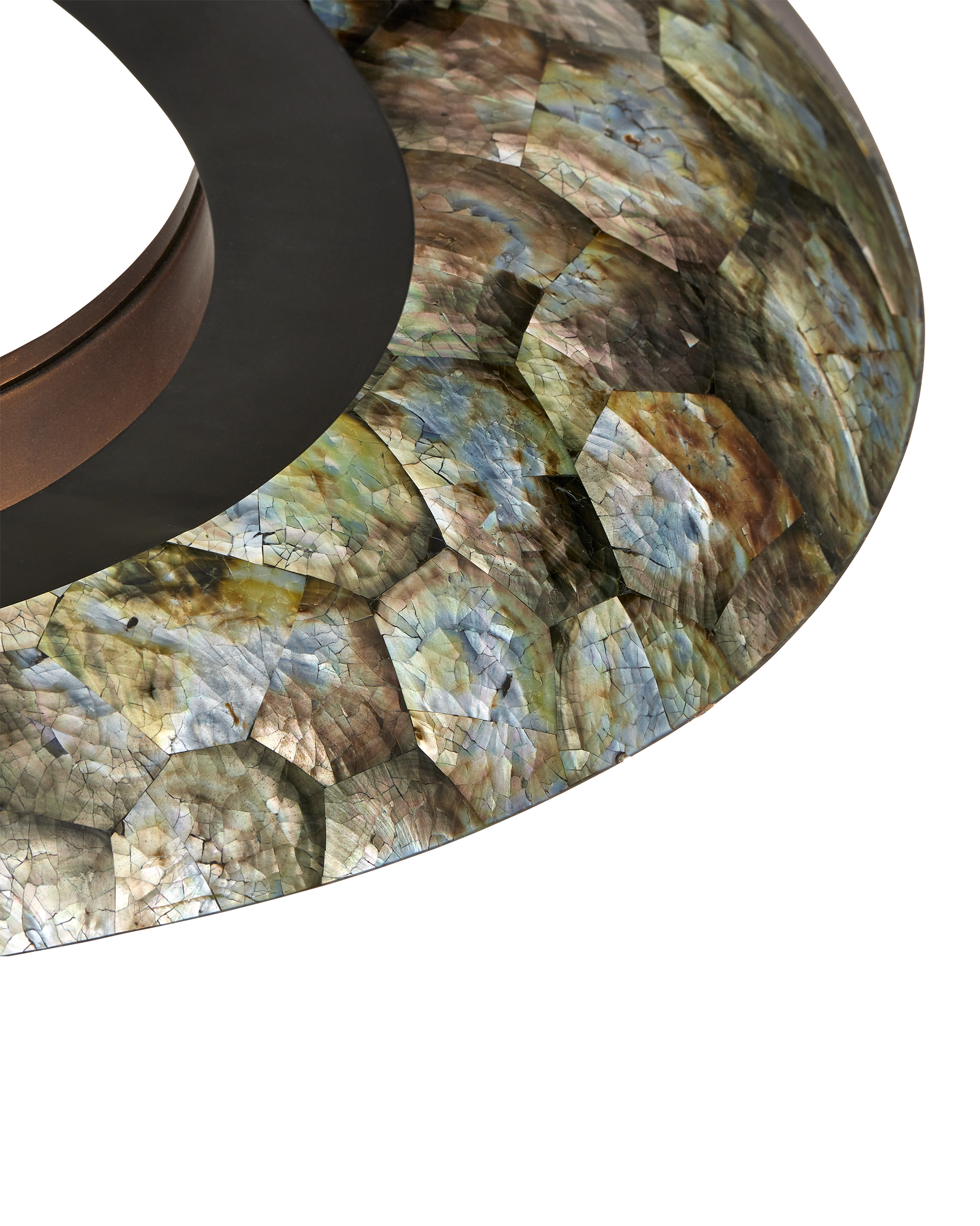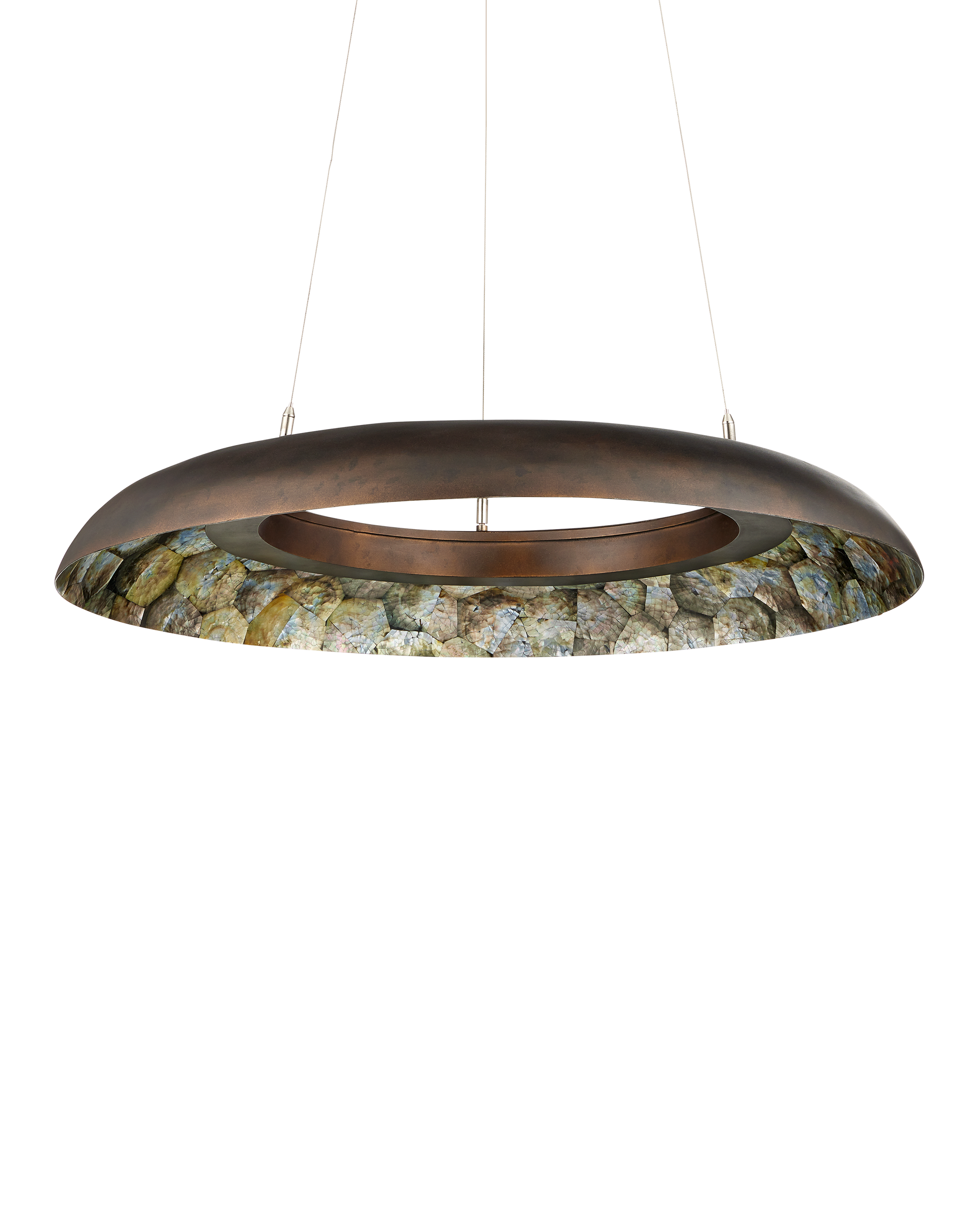 The Tairagai Chandelier was designed by Ian Thornton with an aim to highlight the shell material on the inside of the shade. Fitted underneath the open dome-like wrought iron ring in a bronze gold finish, the shells are laminated in place. The illumination generated by the integrated LED light source washes over the shells to make them gleam and accents the darker tones in the shells. Adjustable from 17.75" to 140" with use of included chain/rod kit/cable. If your space calls for a longer drop, additional chain/rods/cable is available for purchase.