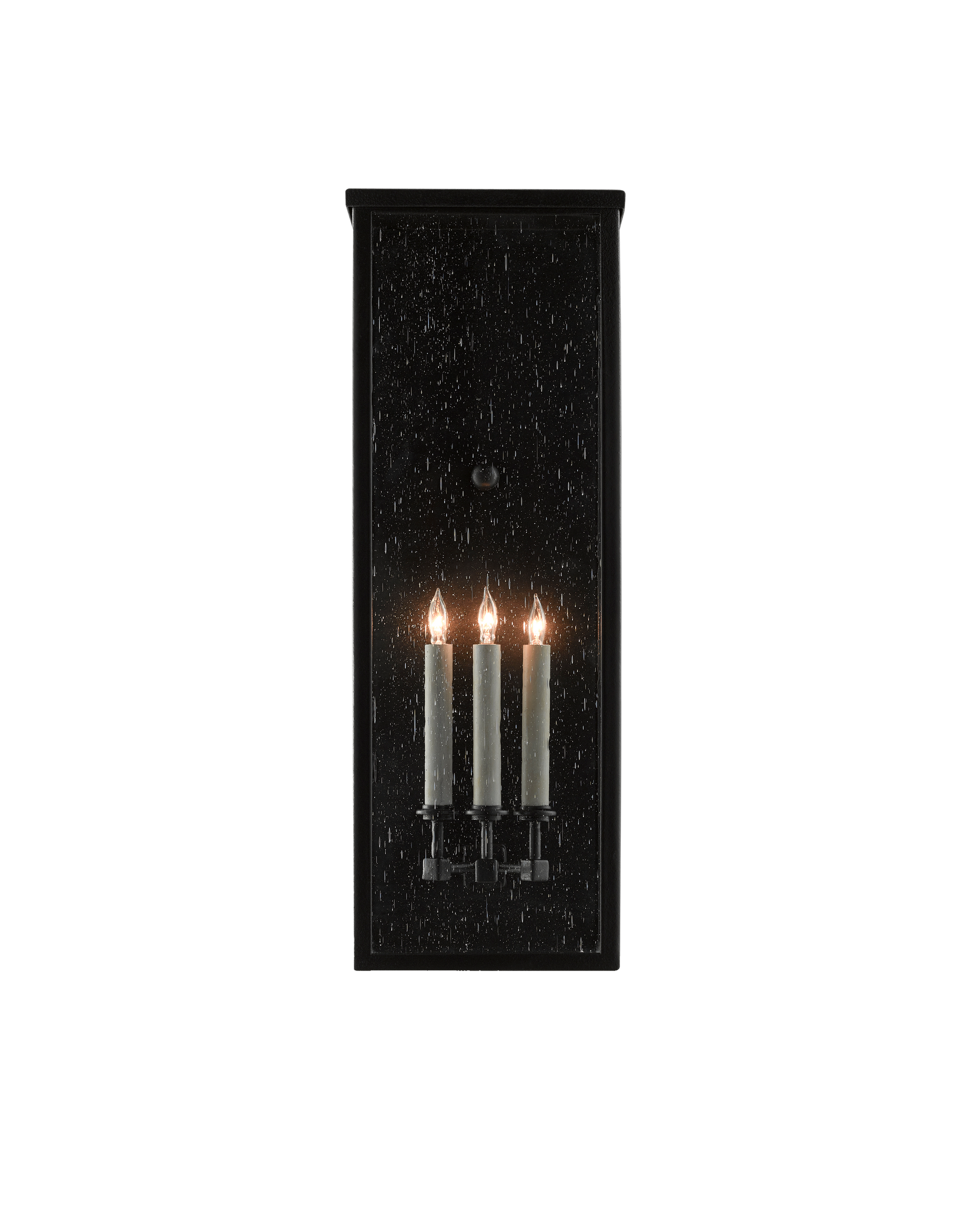 The Tanzy Large Outdoor Wall Sconce in our Twelfth Street collection of outdoor lighting features a high-performance, weather-resistant Trilux finish that is fade resistant, crack resistant and rust resistant. We guarantee the finishes applied to our Twelfth Street pieces for five years. The metal on this black post light in a midnight finish surrounds seeded-glass panes. It is certified for outdoor and damp locations.