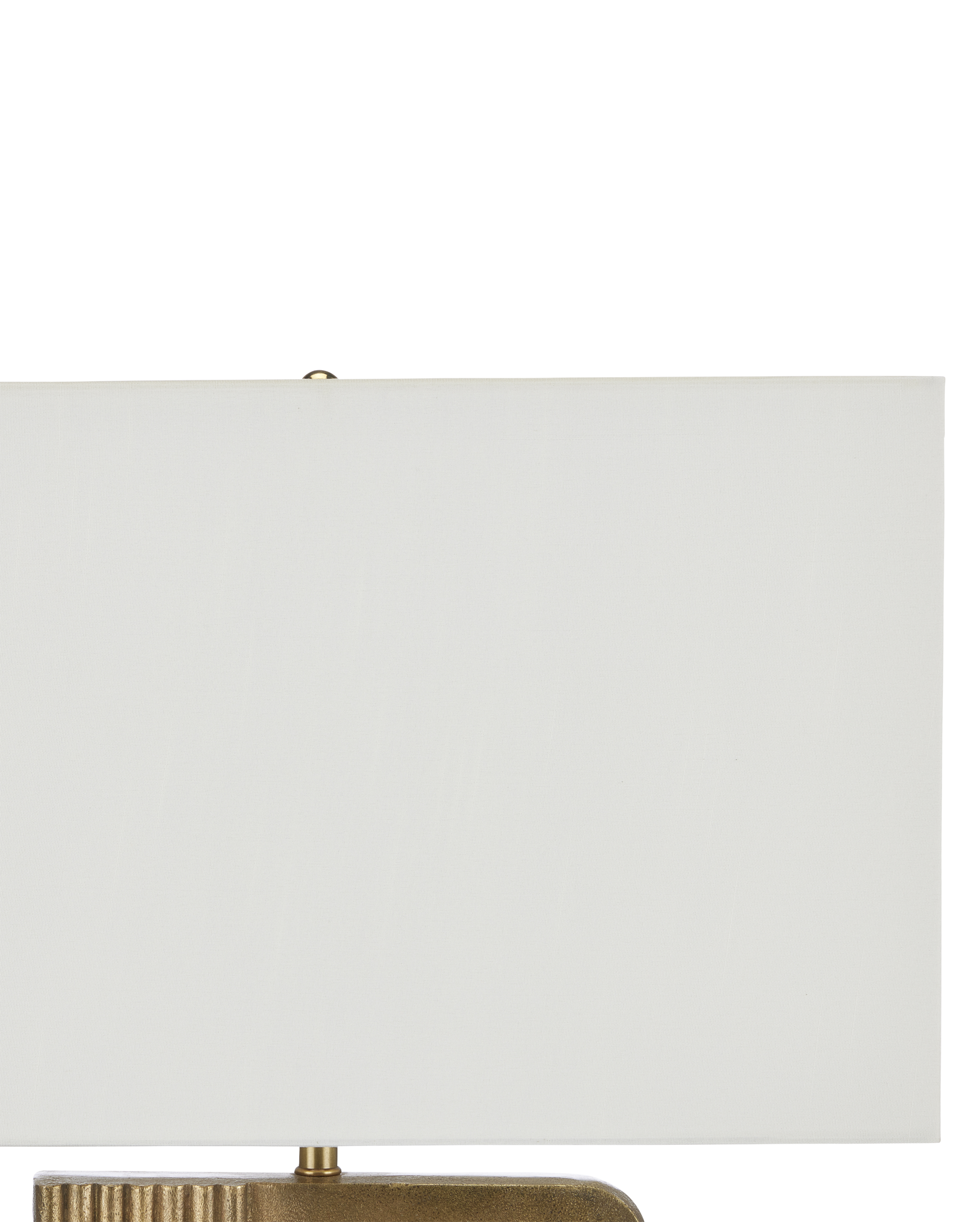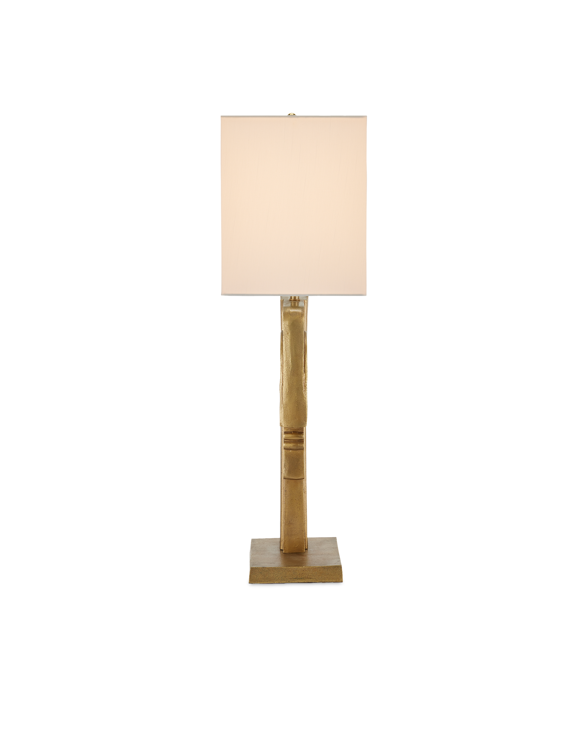 Designed by Ian Thornton, who was inspired by Art Deco motifs from the 1920s and 1930s when he conceived the Thebes Table Lamp, the cast aluminum composition has a warm antique brass finish. The artful face with its expression that calls to mind both Egyptian and Parisian deco influences, looks into a room with its canny stare from both sides of the gold table lamp so it can be placed in the center of a space. The rectangular white shantung shade is perfectly in scale with the elongated metal body.