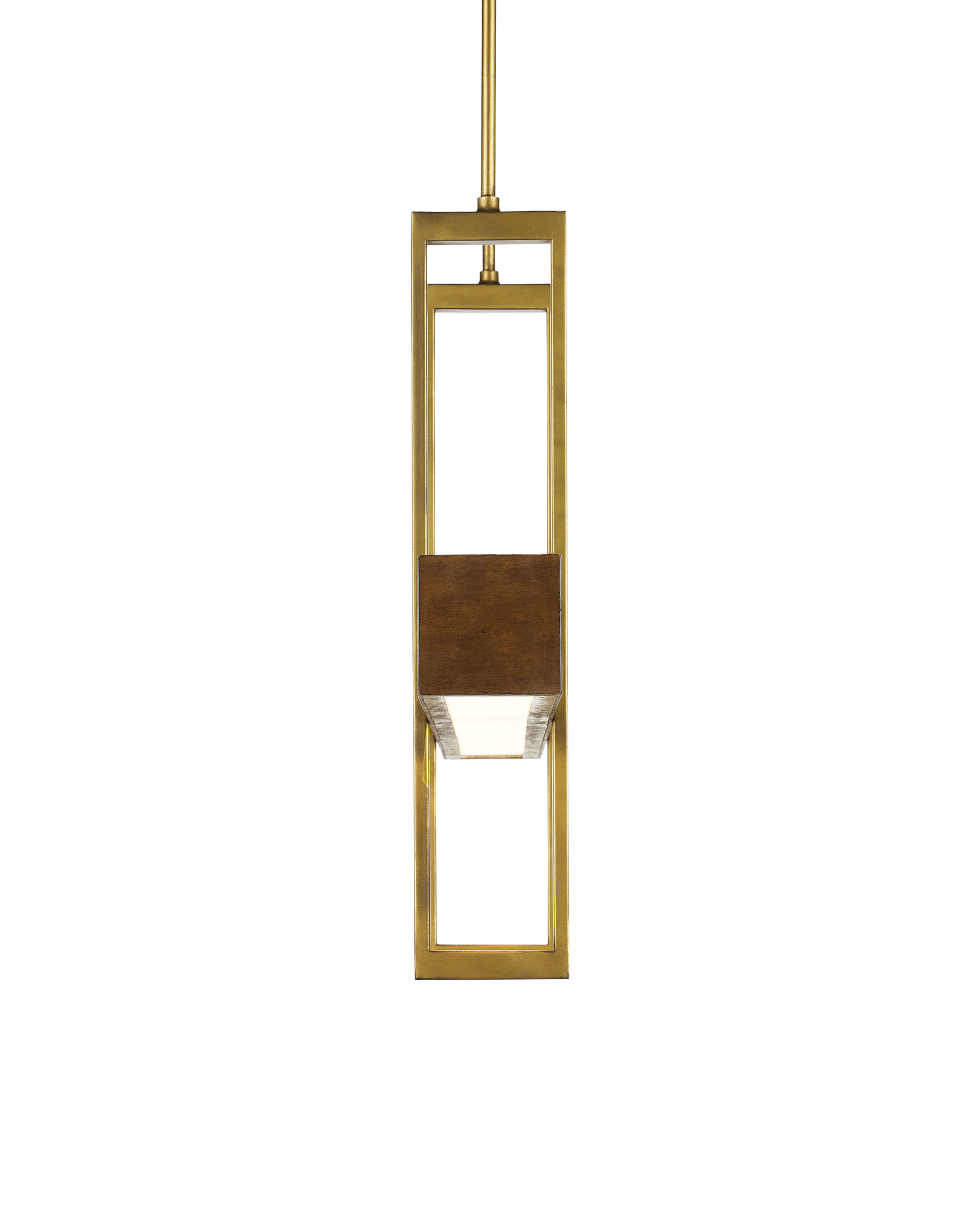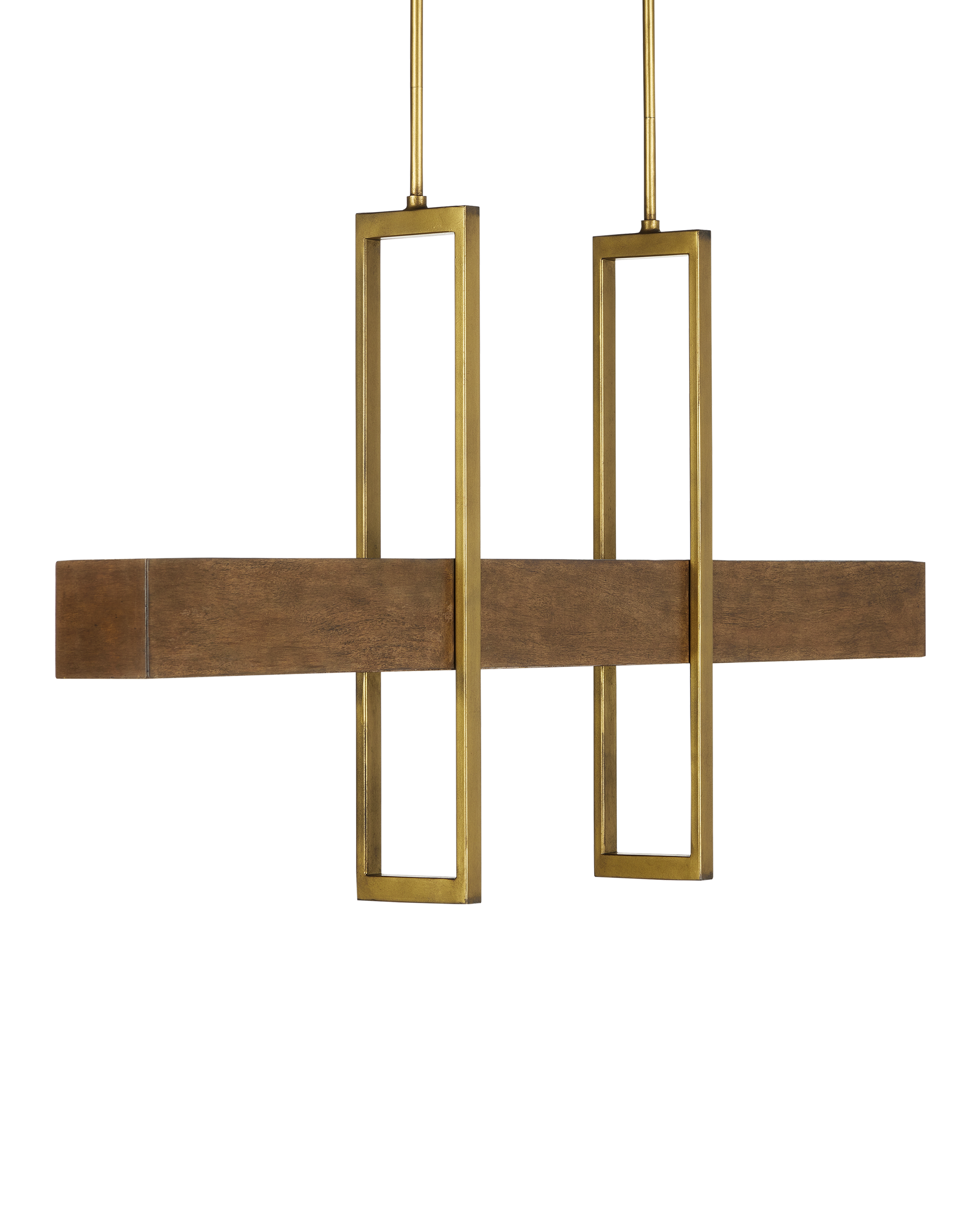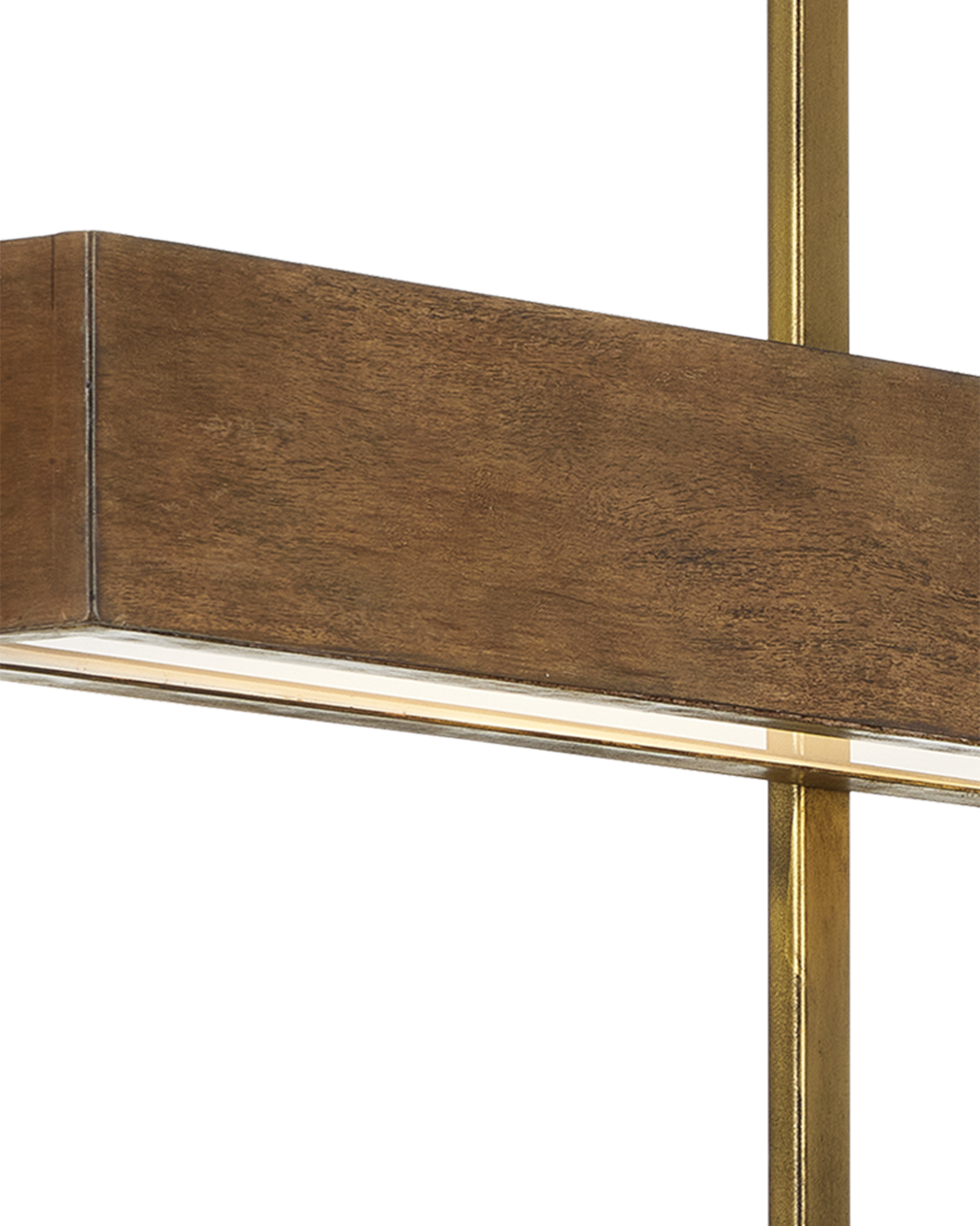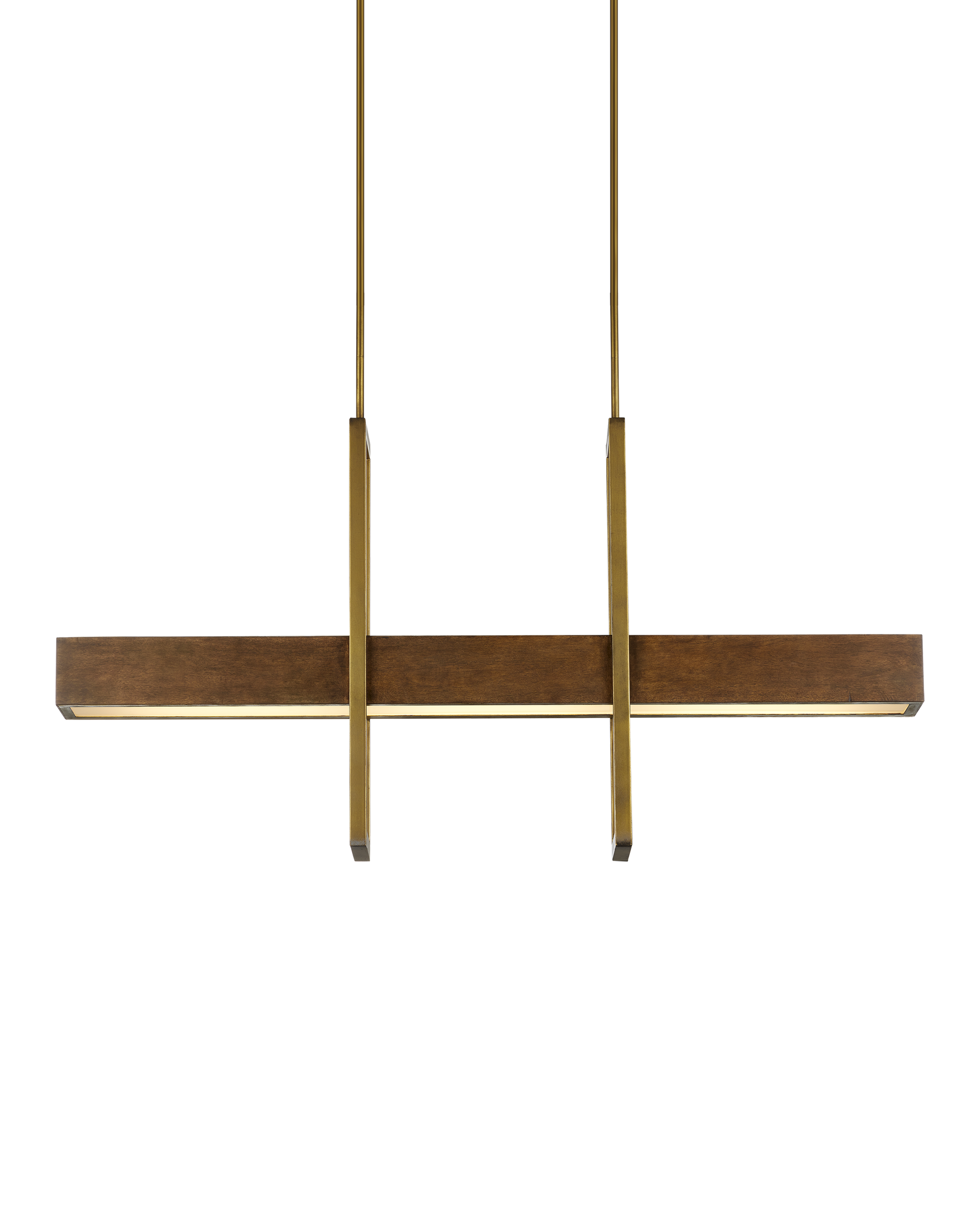 A sophisticated arrangement of rectilinear shapes, the Tonbridge Linear Chandelier also has a rich mix of materials. The vertical rectangles are made of metal in a painted brass finish and the horizontal wood element is in a warm chestnut wood finish. Ian Thornton designed this fixture with long kitchen counters and dining tables in mind. To soften the illumination, the wood rectangle is fitted with an acrylic diffuser. A design detail of note is how the painted brass elements have a bit of antiquing on the corners. Adjustable from 34" to 76" with use of included chain/rod kit/cable. If your space calls for a longer drop, additional chain/rods/cable is available for purchase.