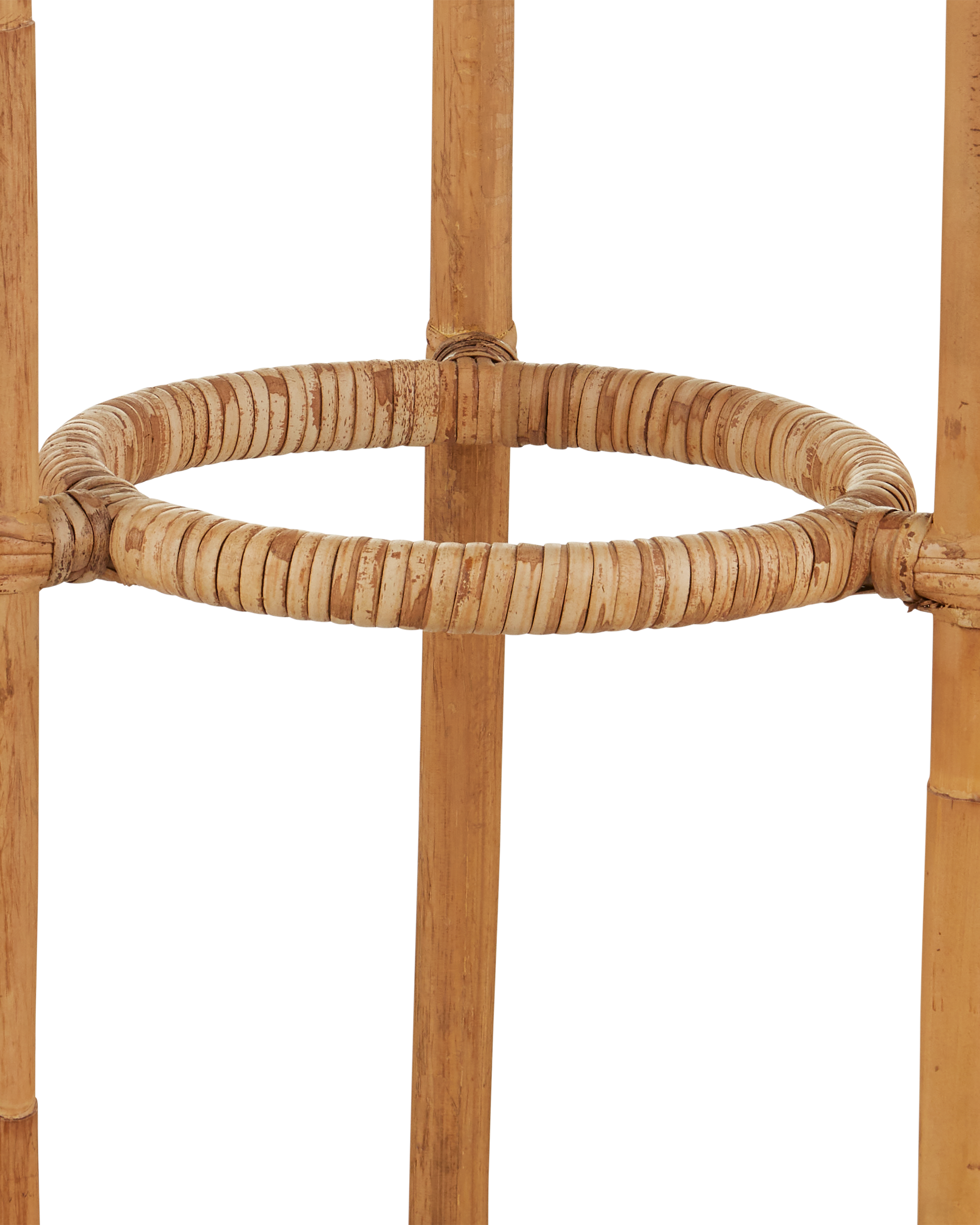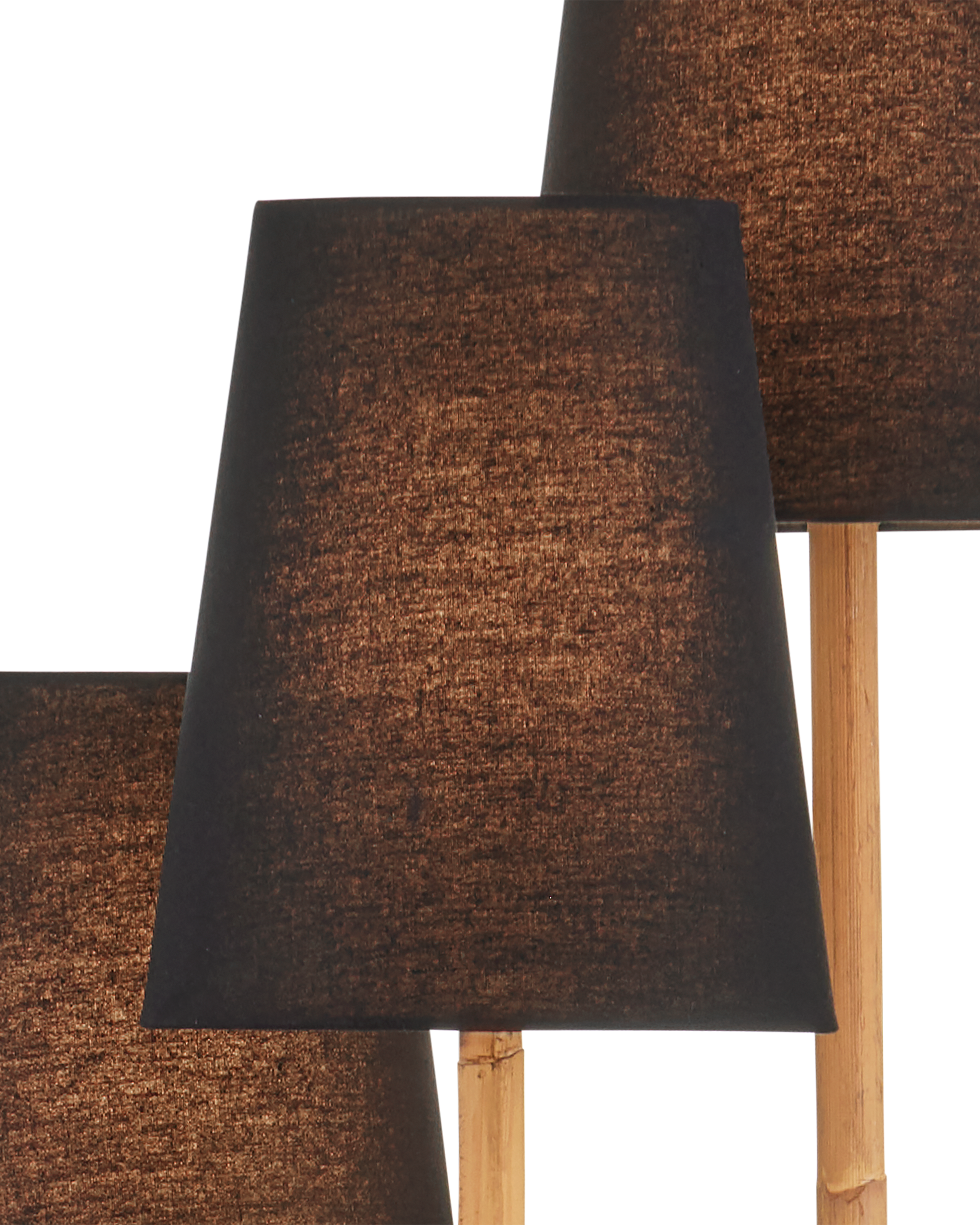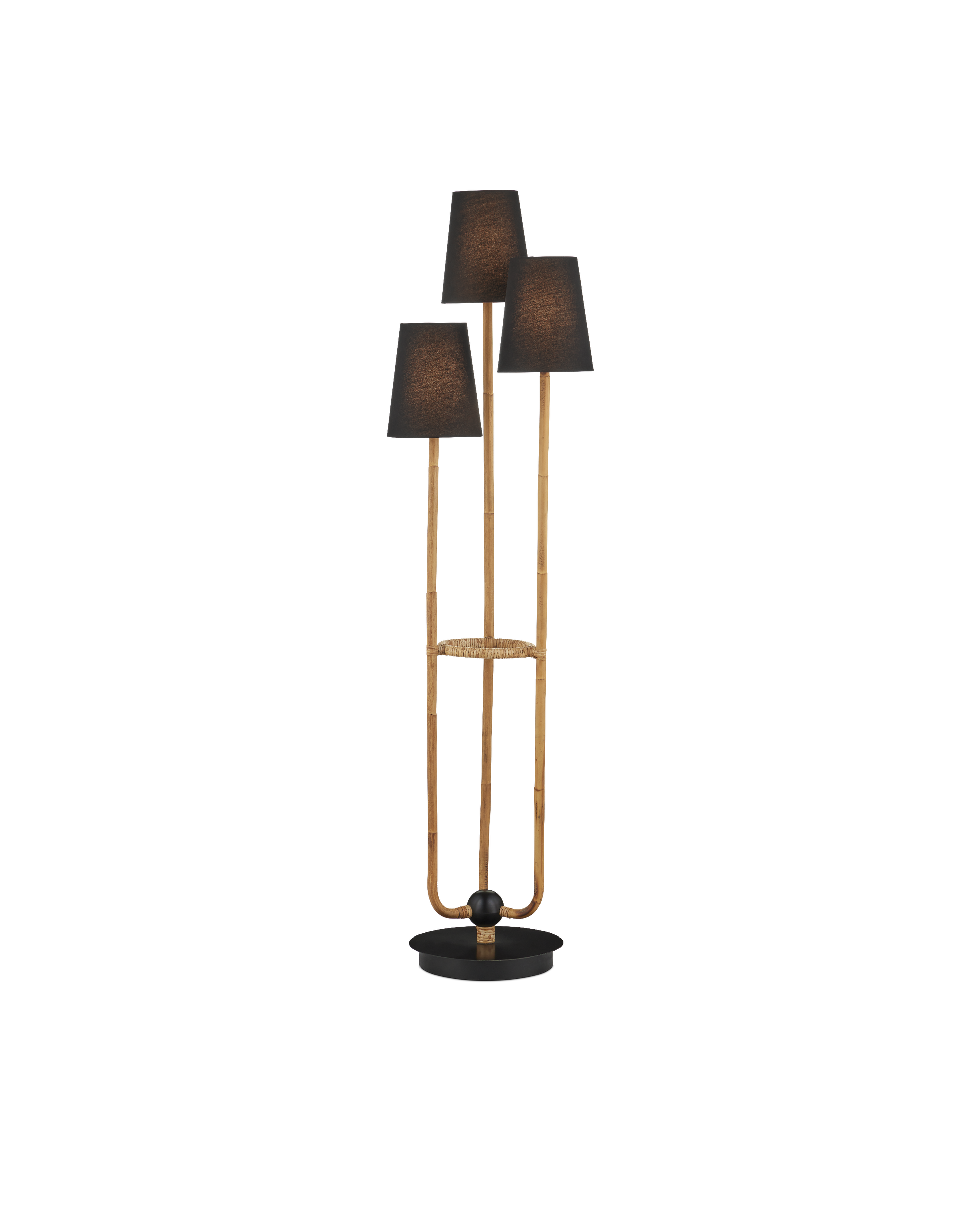 The three stems of the Triptych Floor Lamp that flow up from the satin balck base are covered in natural rattan until they disappear under the black fabric shades. There are a number of special attributes to this design: the combination of black and neutral tones, and the cascading effect of the three shades as their supports grow shorter. These design details make the rope-wrapped floor lamp a stylish choice for a room. A foot switch enhances easy off and on maneuvering even if the floor lamp is tucked behind a piece of furniture.