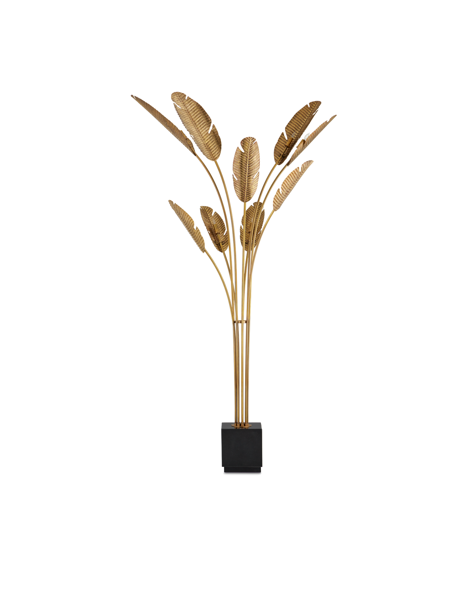 The Tropical Grande Floor Lamp is made of brass in a vintage brass finish with life-like leaves rising from the black granite base of to imply movement. This detail gives this gold floor lamp extra sophistication.