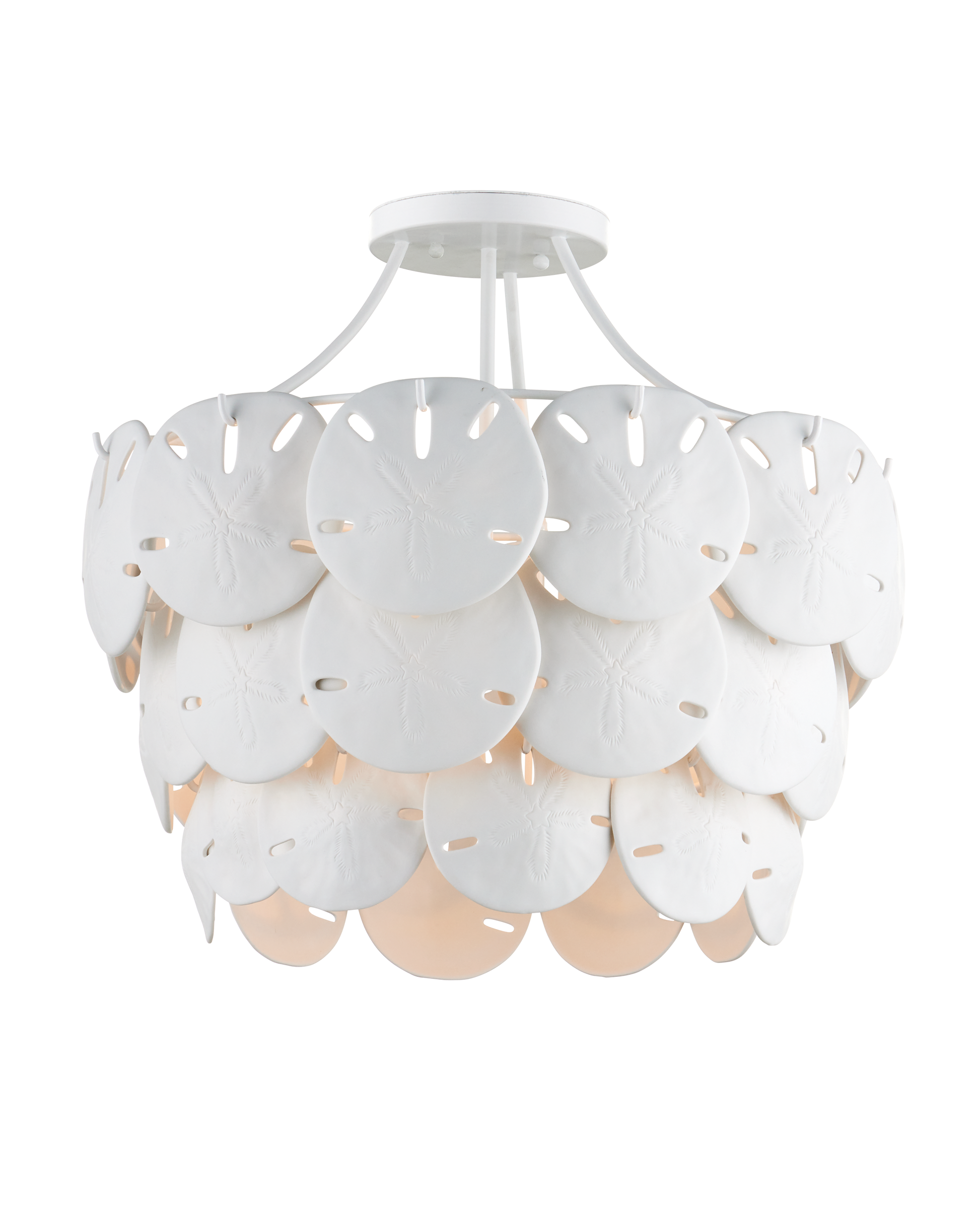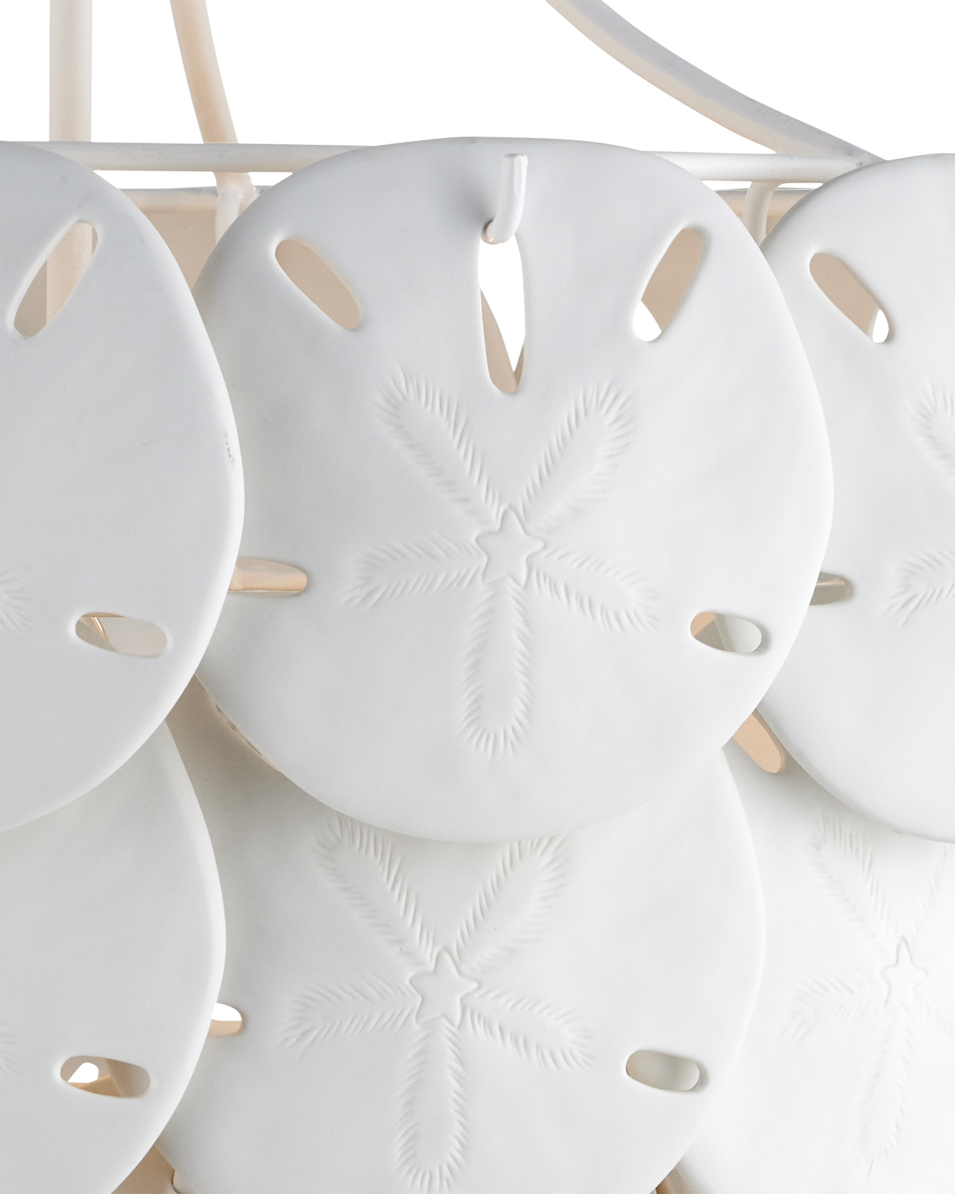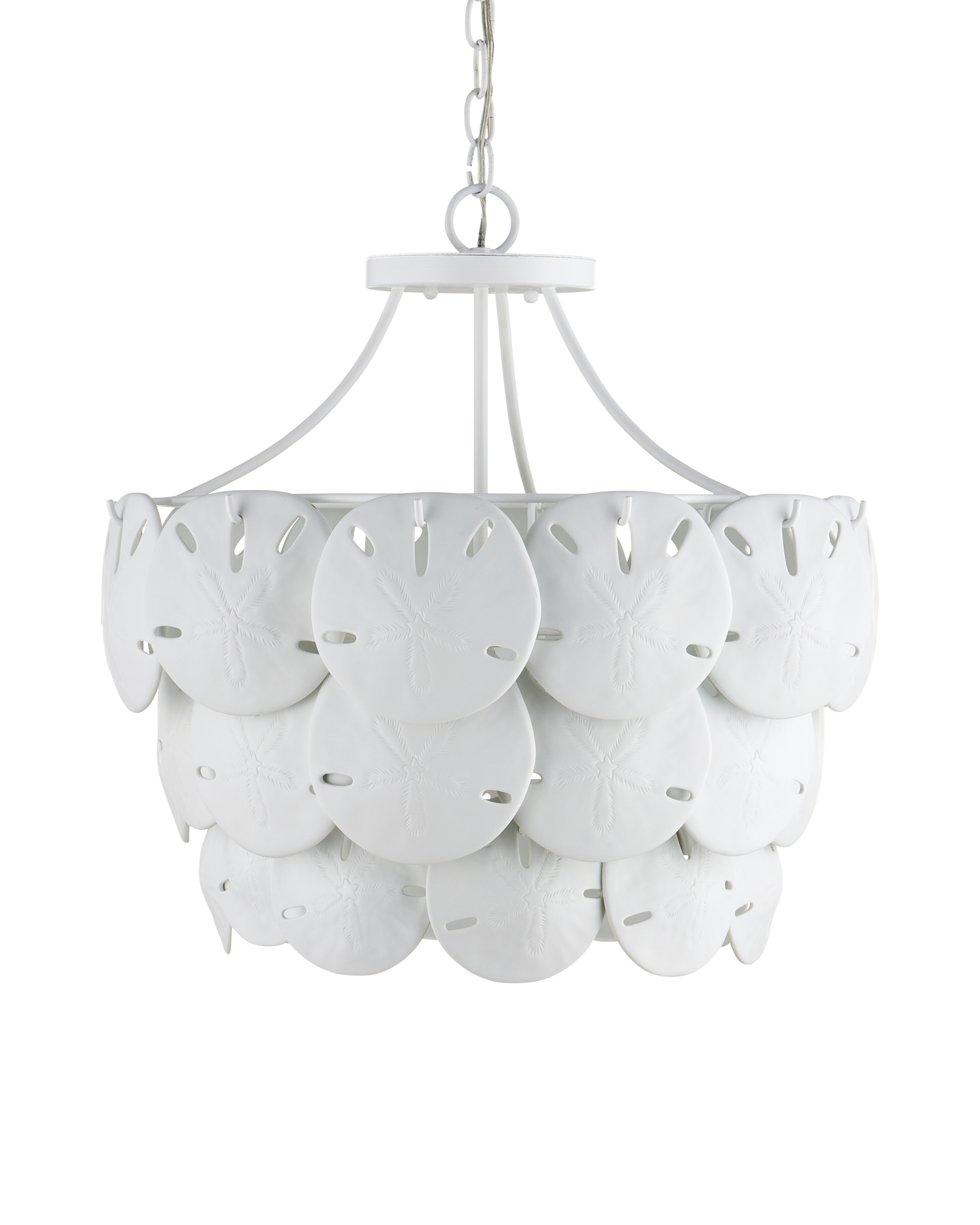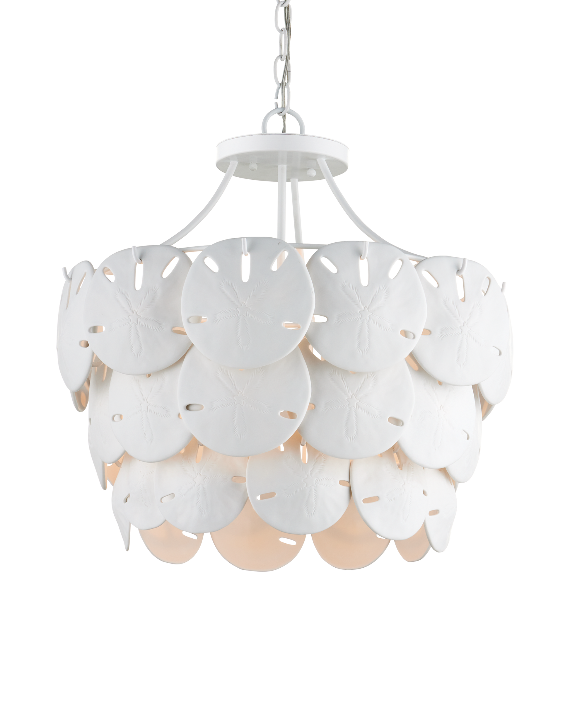 Marjorie Skouras designed the Tulum Medium Chandelier, inspired by the tropical beauty of the Yucatan Peninsula where she lives. This is an elegantly delicate design, as the sand dollars are cast in semi-translucent bone china and they make a pretty sound when a strong breeze ruffles them. There are three sizes of removable sand dollars on this design, which makes it easy to clean. The sugar white finish on the hardware complements the pale discs on this nature-inspired chandelier, making it apropos for rooms overlooking the ocean. Adjustable from 18.75" to 95.25" with use of included chain/rod kit/cable. If your space calls for a longer drop, additional chain/rods/cable is available for purchase.