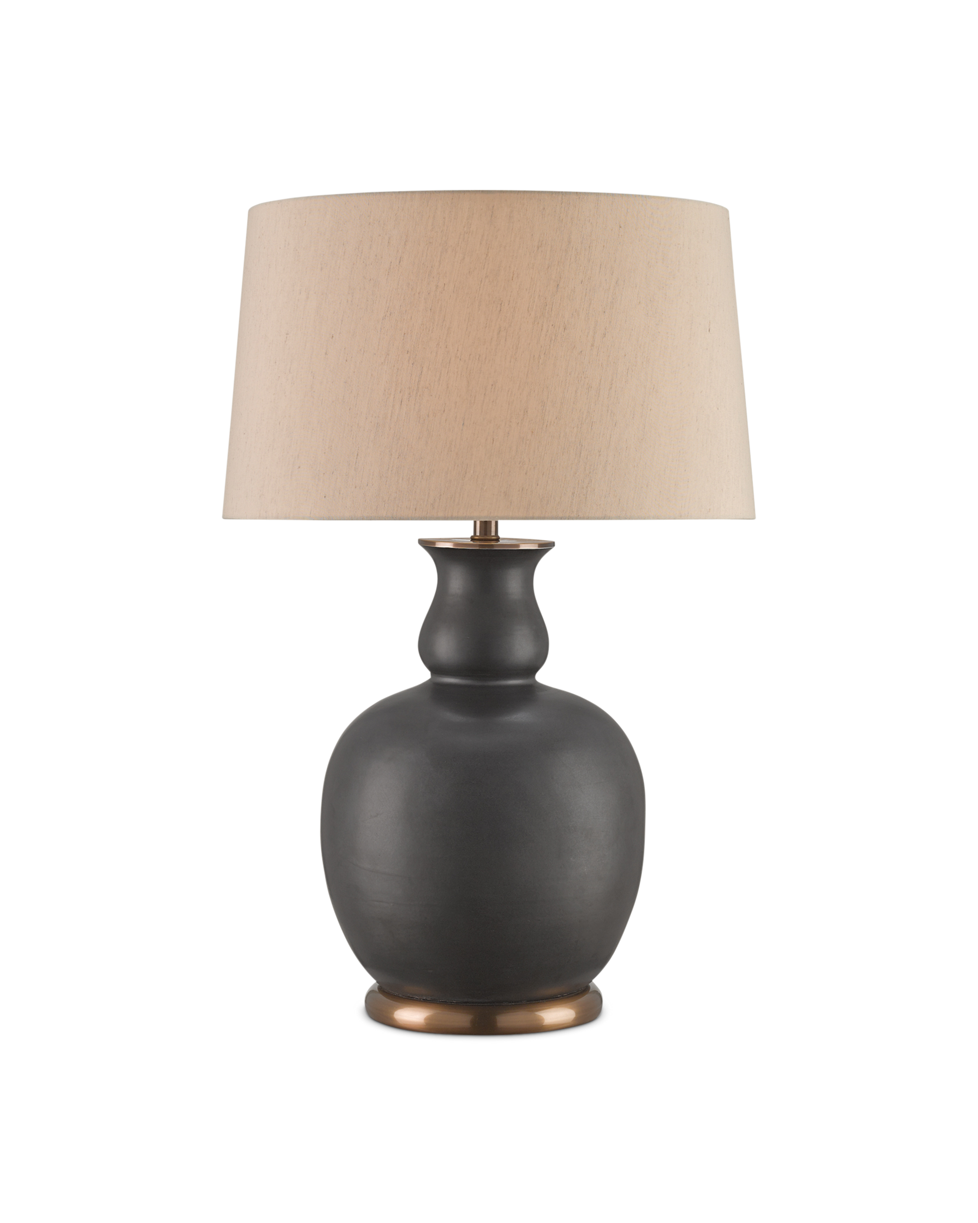 The Ultimo Table Lamp cuts a bold profile with the lustrous matte black finish on its rotund ceramic body. Details that make this black lamp special include the flaring shape of the lamp as it meets the shade, the warmth of the metal base and hardware in an antique brass finish, and the size of the beige poplin shade.