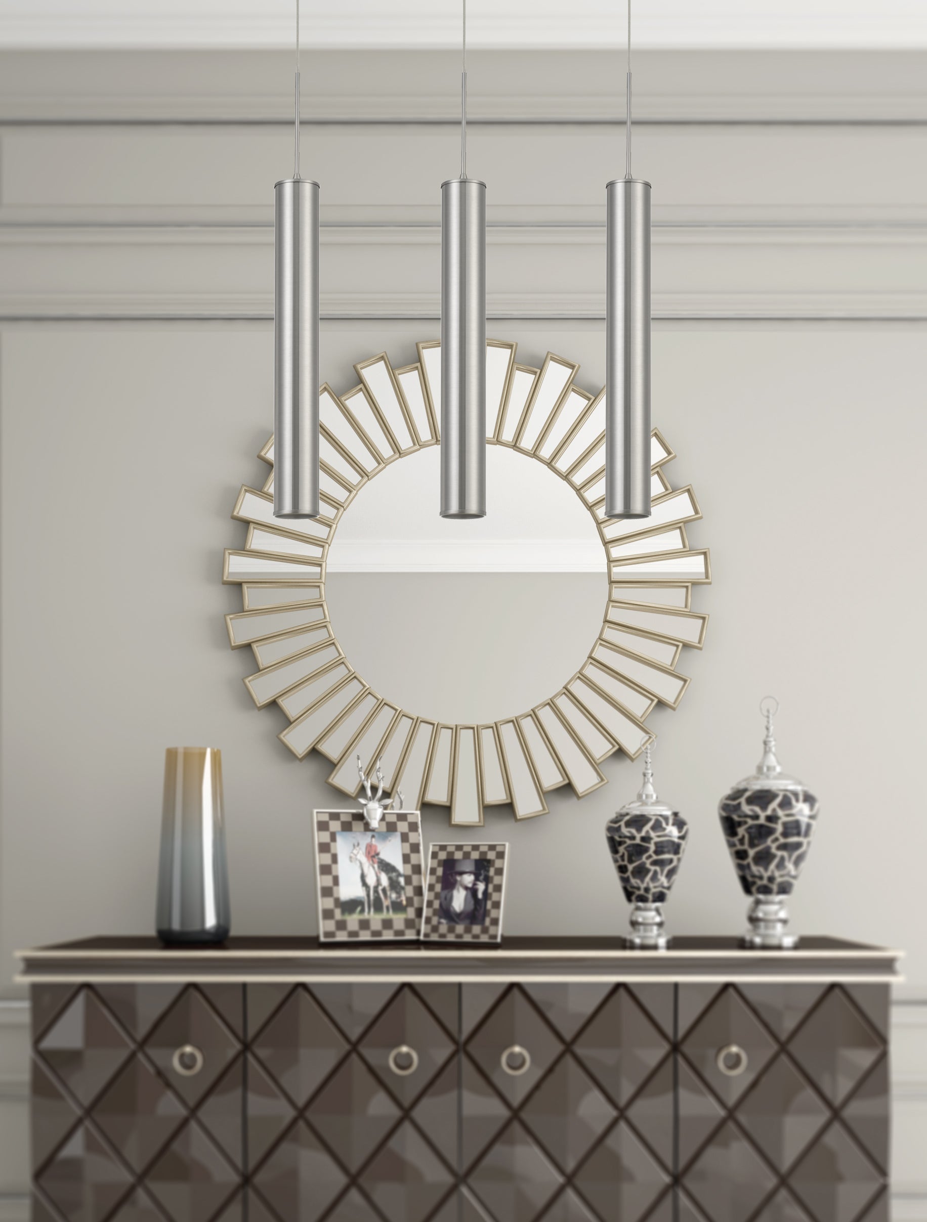 This Melini Dimmable Metal Pendant Fixture has a cylindrical design with a durable metal construction. This piece would work perfectly over a seating area or kitchen island.