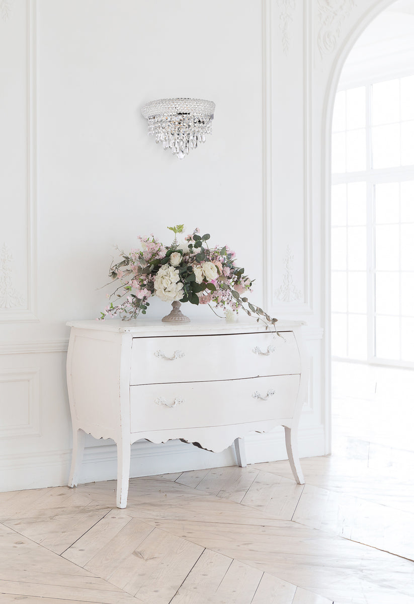 “Primo” means “first” in Italian, and the Primo wall sconces live up to their name as the top choice in classic, dramatic lighting. The gentle bell-shaped design adds graceful elegance to brighten any area of your home. A small ring on top, encrusted with crystals, holds strands of crystal octagons that flow outward to the larger bottom ring, laden with more crystals. Below that, this shimmering fixture culminates in descending layers of crystal octagons, balls, or drops, which come together with a Single ball at the bottom.