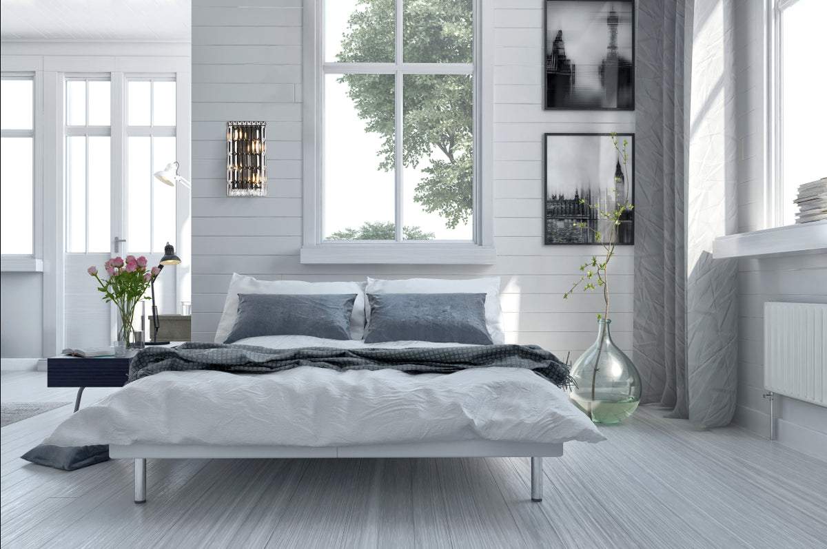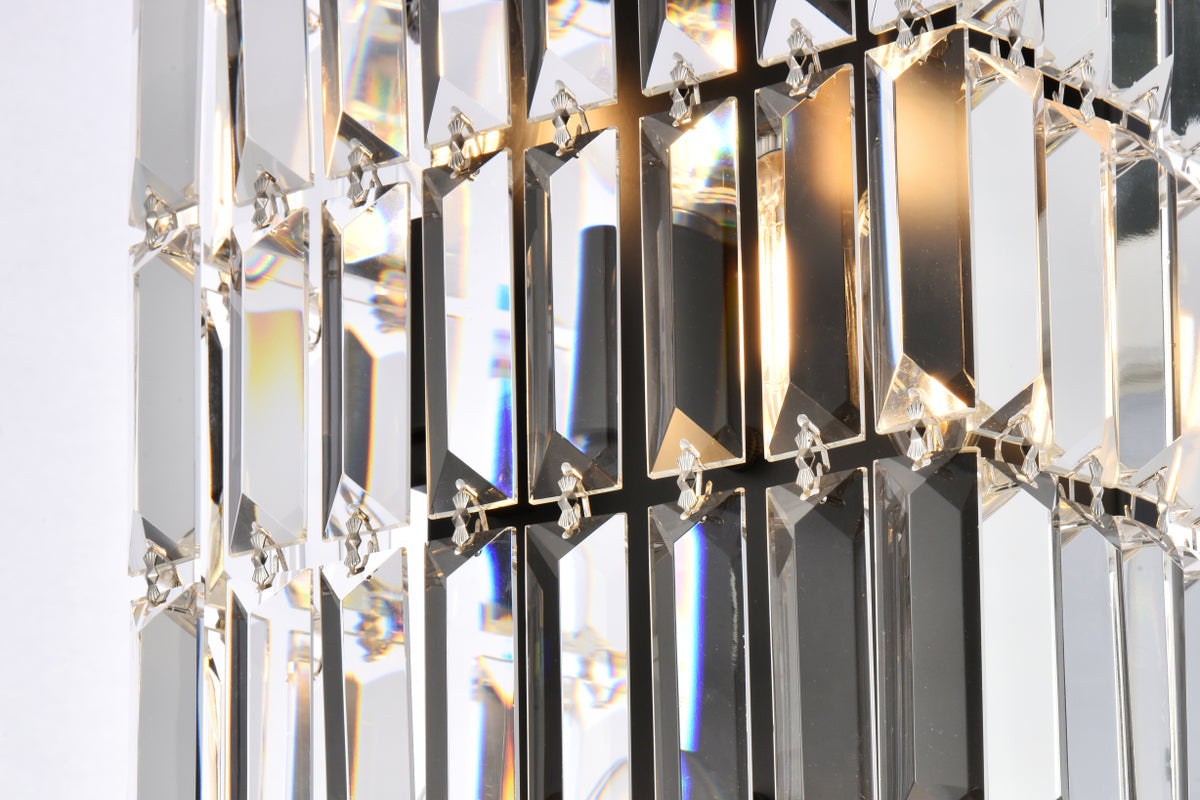 A riot of shapes and textures, Maxime collection wall sconces sparkle in a mosaic of crystal tiles. Square and rectangular precision-cut crystals form the flamboyant semicylindrical or rectangular exterior while faceted crystal balls create a bubbled effect for light to shine through beneath. Available in a black or chrome finish with clear crystals, these lamps are a luxurious addition to a bathroom, entryway, or kitchen.
