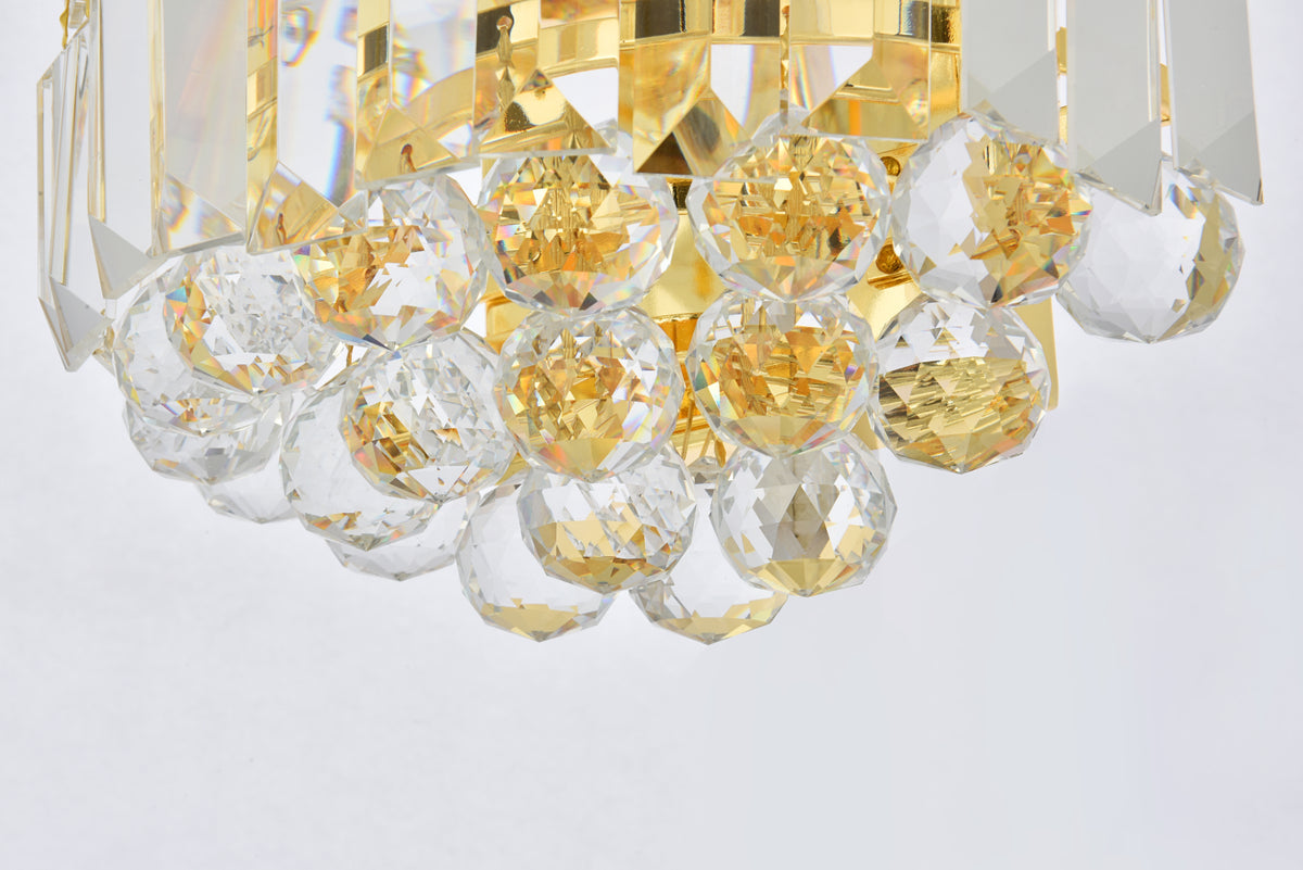 A light brimming with sparkle, Corona collection wall sconces fill a home with brilliant light. A rounded frame is overflowing with clear crystal balls and faceted prisms. Above all this splendor, a bejeweled scalloped band, tipped with matching crystal balls, forms a gorgeous “crown,” from which this collection derives its name. Crystal octagons dangle at the top for the final majestic touch. Available in a chrome or gold finish that is dazzling in an entryway, bathroom, or hallway.