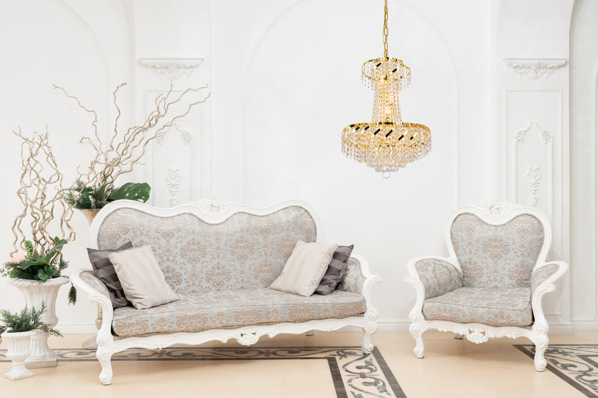 A luxurious take on the classic empire chandelier, Belenus collection hanging fixtures add glamour to a dining room, stairwell, or living room. Curls of gold or Silver spiral along the top of this chandelier while clear octagon crystal strands drape downward to a profusion of crystal balls for the ultimate refraction from any angle. Soft candelabra bulbs (not included) are tucked inside to create a warm glow hidden within. Available in a gold or chrome finish.