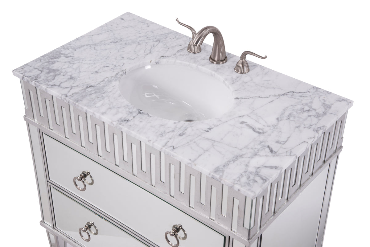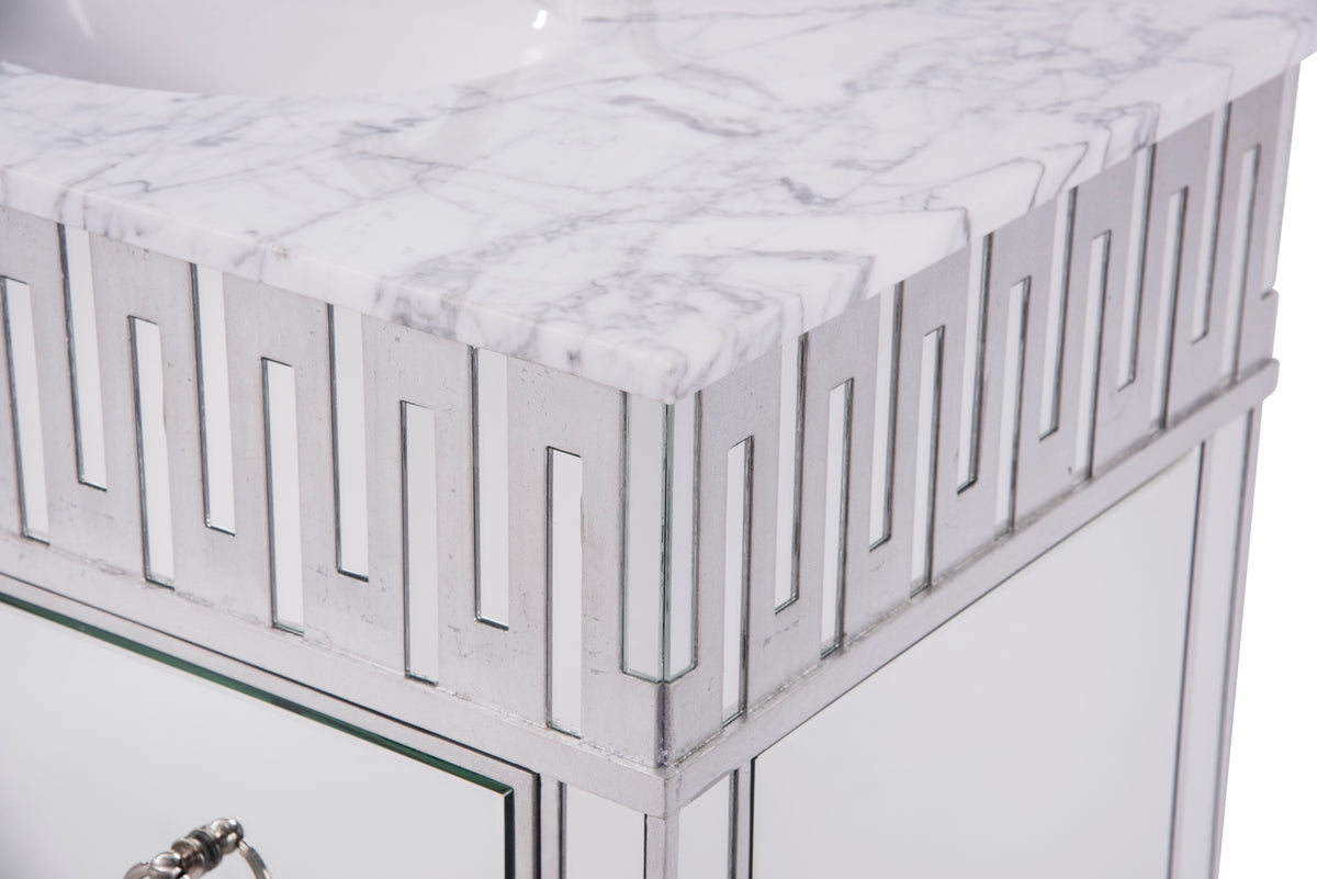 Our unique “nouveau” vanity brings together the best of contemporary styling and functionality to your home or office bathroom, design with authentic white marble, top-grade mirrors, hand-rubbed silver finish, brushed steel knobs
