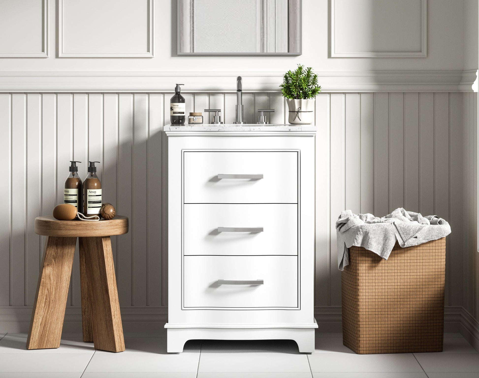 Enhance your bathroom with this expertly crafted vanity that combines functionality and timeless design. The slightly curved silhouette adds softness and sophistication, while the faux-marble countertop showcases unique veining for a one-of-a-kind look. Complete with a porcelain undermount sink, this vanity is available in White, Blue, and Grey finishes to complement any décor. Soft-closing drawers offer quiet and smooth storage access, including a U-shaped middle drawer designed to fit around plumbing. Built with solid wood and MDF for lasting durability, it also features adjustable foot levelers for stability and ships fully assembled, making it an effortless and stylish upgrade to your space.