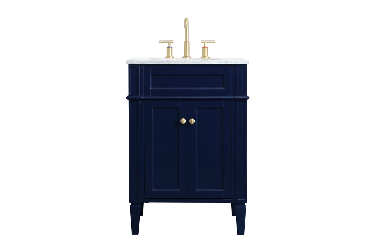 Modern sophistication is defined within the urbane blue finish and brushed gold knobs of this compact vanity. Its modest length makes it the perfect addition to any sized home, and saves space with its storage area hidden behind the double cabinet doors. Topped with a Carrara white marble counter top and a porcelain sink, this design will add everlasting class to your bathroom and powder room.