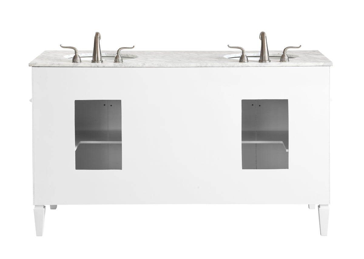 This classic, contemporary marble top vanity console from our “Park Avenue” collection is roomy enough to keep all your bath essentials close at hand. Fitted with a spacious Italian Carrara white marble counter top and 2 oval porcelain sink, you will naturally enhance your home or office bathroom with both its beauty and practicality. Featuring a hand painted white cabinet, 4 drawers in the middle, a set of recessed door with shelf inside on each side, brushed steel knob and tapered leg. measurements: W60”xD21.5”Xh35”