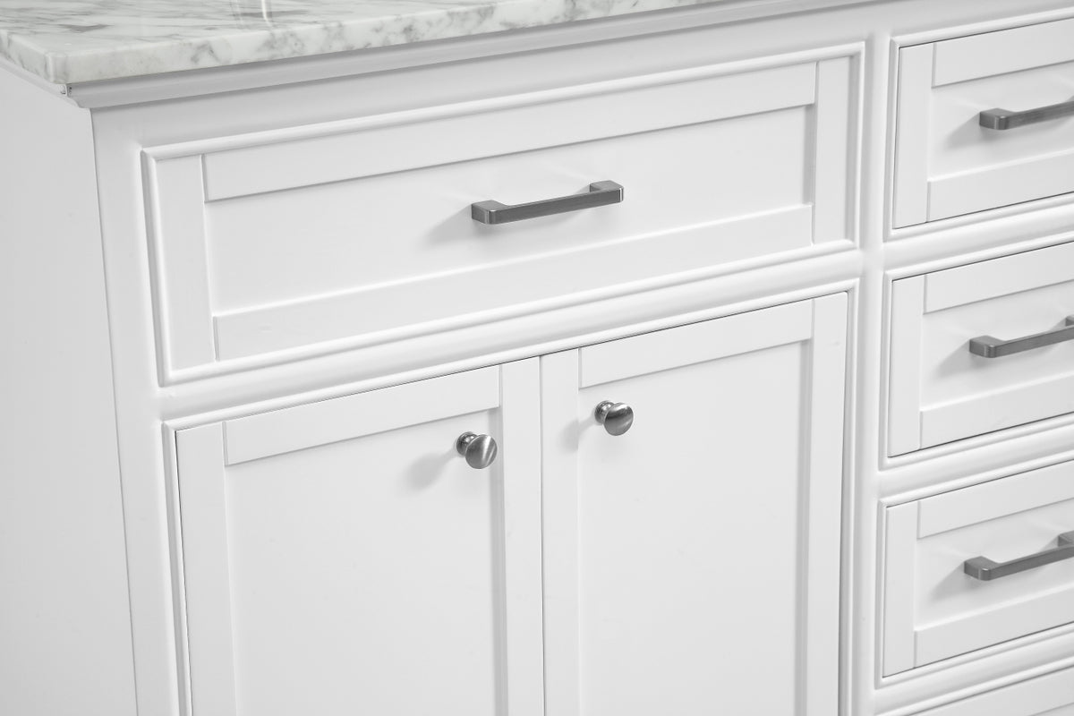 From its Italian Carrara white marble top to its contemporary-styled hand painted white cabinet, this member of our “Americana” vanity collection is sure to enhance either your home or office bathroom. Beneath its lustrous, natural marble top and 2 oval, white porcelain under mount sink, is a cabinet with 4 handsome center drawers and s set of doors with a Single shelf each for all your bathroom essentials, highlighted with recessed panel doors, brushed steel bar handle and knobs, stands on strong solid pedestal feet. A wonderful balance of simplicity and practical function! Measurements: W60”xD21.5”xH35”