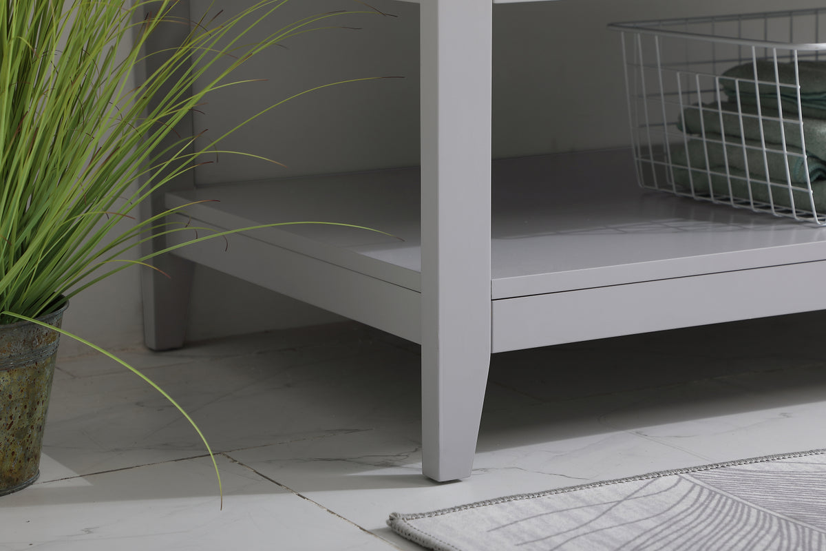 The nonchalant attitude of this 42" traditional grey finish vanity will have you wanting more. The slender brushed nickel handle bars open the 3 cabinet doors to reveal ample storage space to put away and store bathroom essentials, and the open space below allows for you to place clean towels on the rack. Topped with a Calacatta engineered marble countertop, you and your guests will enjoy this easy going vanity. Comes with a matching backsplash to complete the look and protects your wall.
