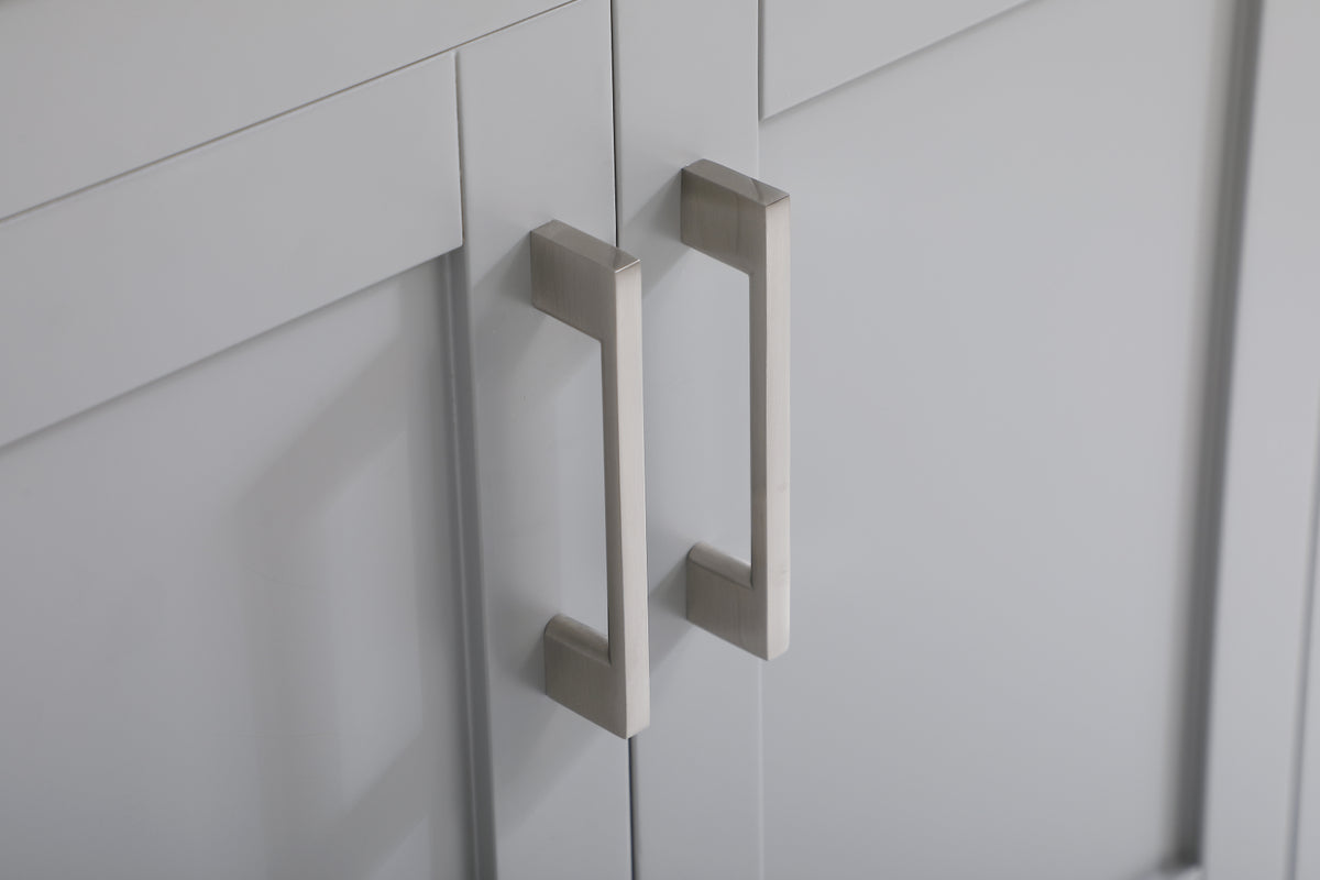 The nonchalant attitude of this 60" traditional grey finish vanity will have you wanting more. The slender brushed nickel handle bars open the two double cabinet doors and two center drawers to reveal ample storage space to put away and store bathroom essentials, and the open space below allows for you to place clean towels on the rack. Topped with a Calacatta engineered marble countertop and double porcelain undermount sink, you and your guests will enjoy this easy going vanity.