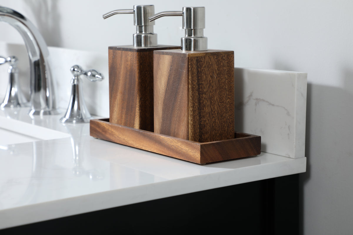 The subtle beauty of the Theo collection vanity exudes comfortable luxury. Its modern, yet traditional beauty will surely dress up your bathroom or powder room without any fuss. The calacatta engineered marble countertop and porcelain undermount sink shows quiet opulence, and the legs support upright without fail. Brushed nickel hardware complements the classic black finish, with pulls adorning the two cabinet doors, showcasing ample storage space within. Slated shelf allows for additional space to organize your towels. Whether this vanity is in your bathroom or for guests, its presence will surely elevate the aesthetics of your room. Comes with a matching backsplash to help protect your bathroom wall.