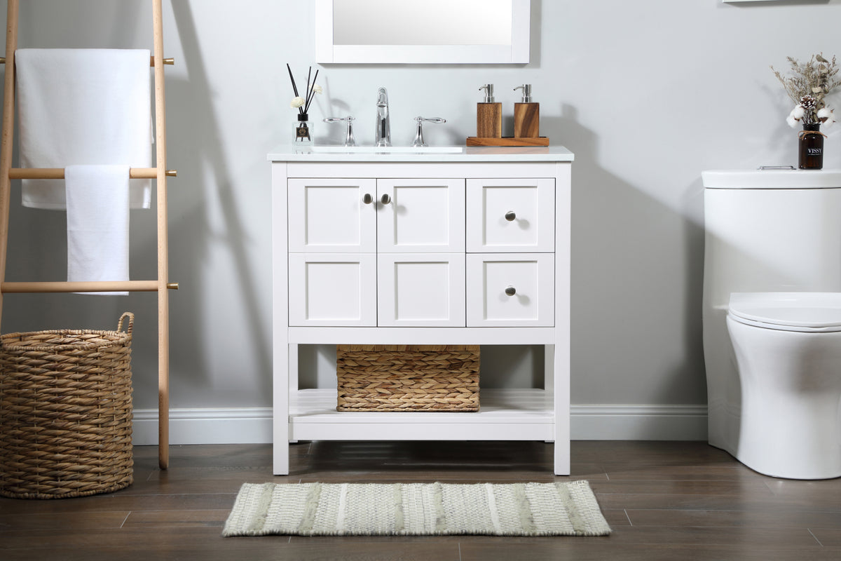 The subtle beauty of the Theo collection vanity exudes comfortable luxury. Its modern, yet traditional beauty will surely dress up your bathroom or powder room without any fuss. The calacatta engineered marble countertop and porcelain undermount sink shows quiet opulence, and the legs support upright without fail. Brushed nickel hardware complements the classic white finish, with pulls adorning the two cabinet doors, showcasing ample storage space within. Slated shelf allows for additional space to organize your towels. Whether this vanity is in your bathroom or for guests, its presence will surely elevate the aesthetics of your room.