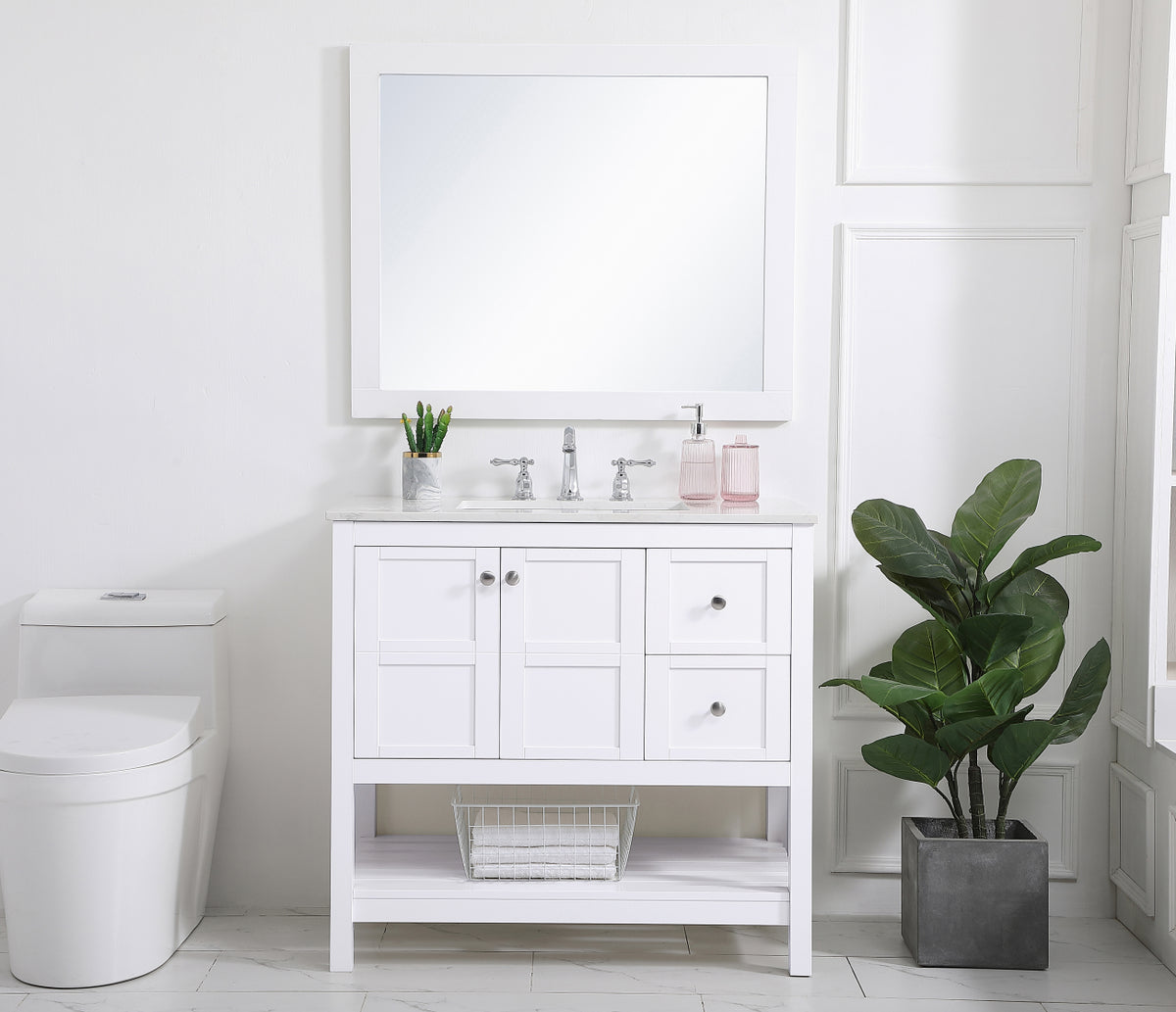 The subtle beauty of the Theo collection 36" vanity in a white finish exudes comfortable luxury. Its modern, yet traditional beauty will surely dress up your bathroom or powder room without any fuss. The white stone countertop and porcelain undermount sink shows quiet opulence, and the legs support upright without fail. Brushed Nickel hardware complements the trendy white finish, with pulls adorning the two cabinet doors and two drawers, showcasing ample storage space within. Slated shelf allows for additional space to organize your towels. Whether this vanity is in your bathroom or for guests, its presence will surely elevate the aesthetics of your room.